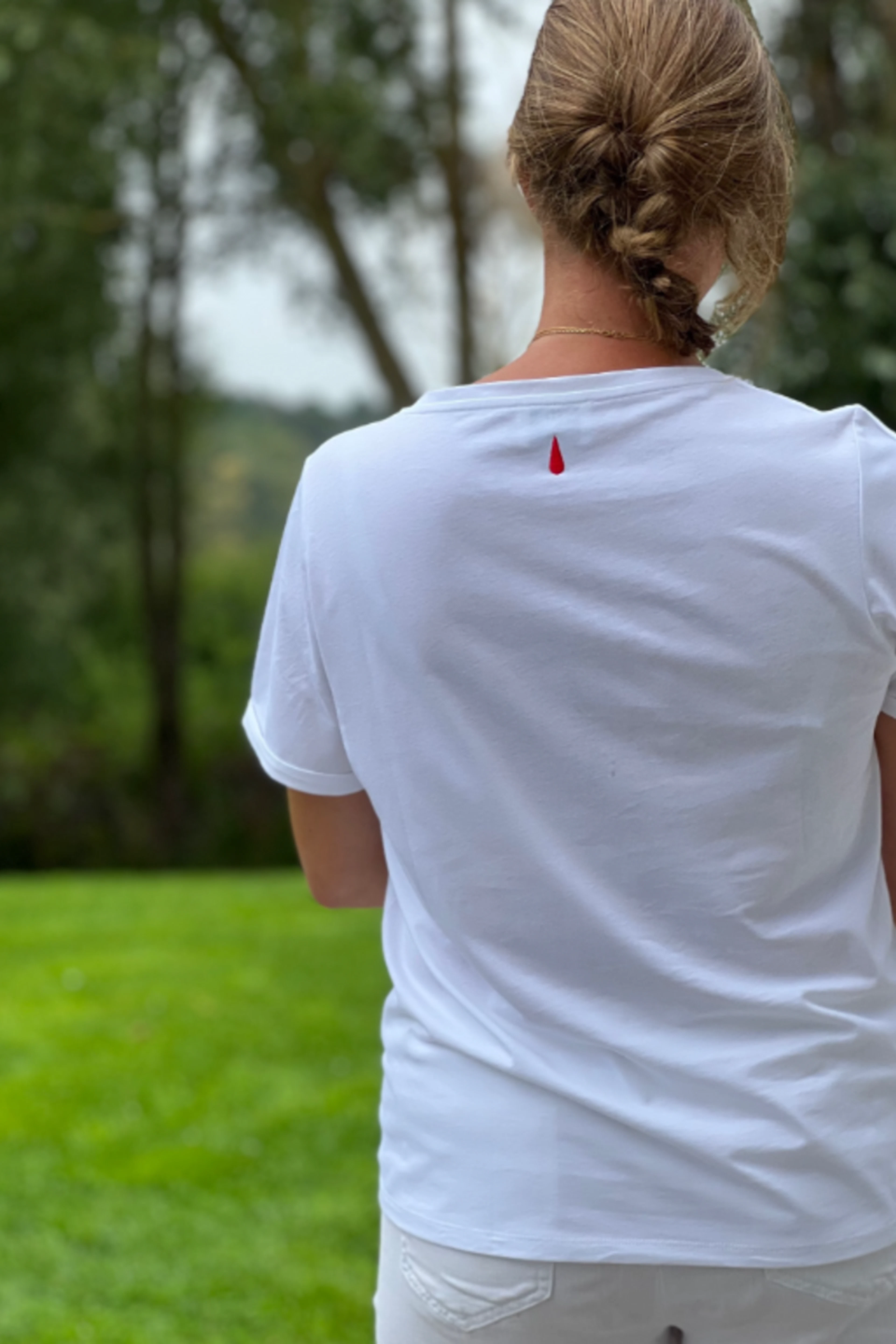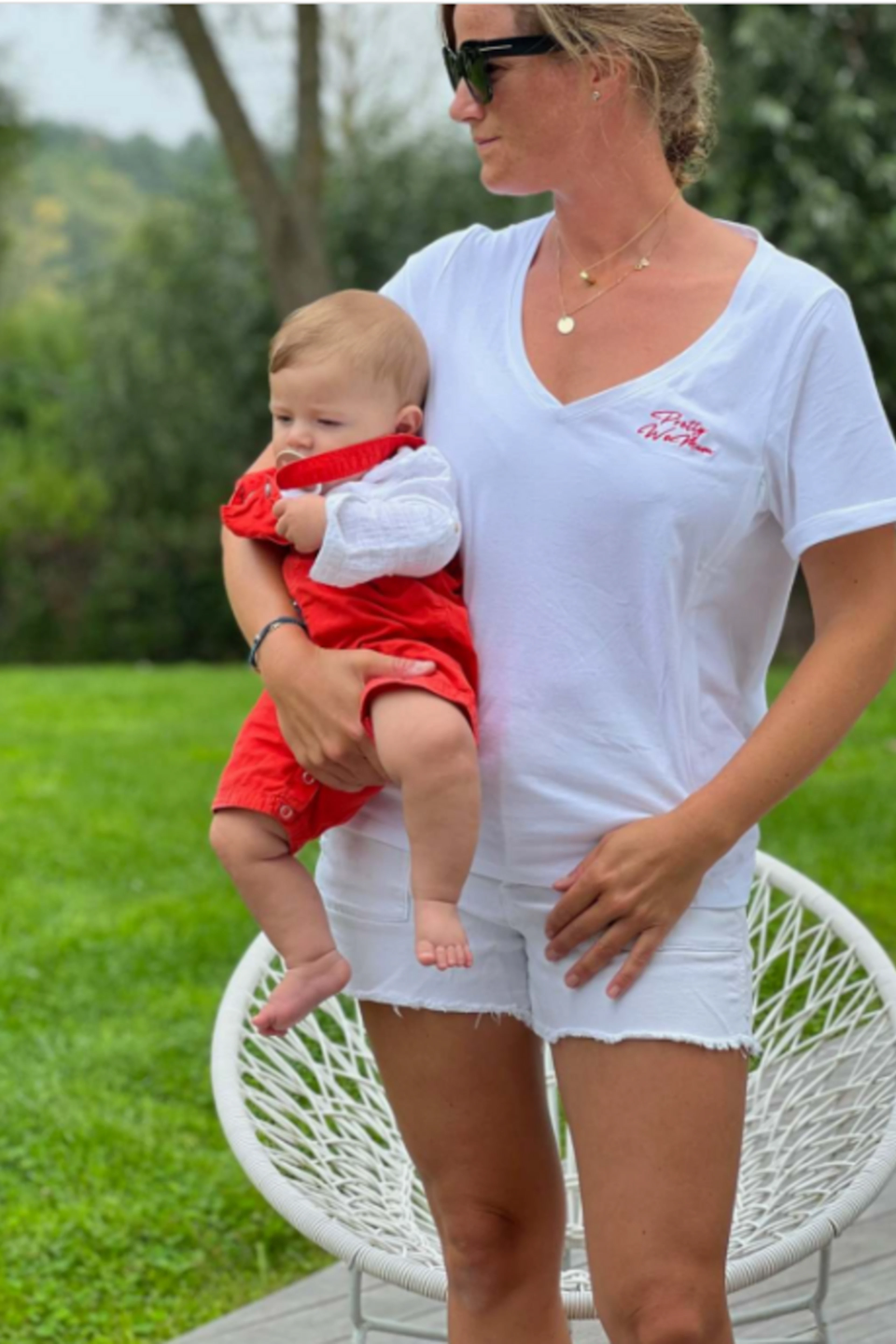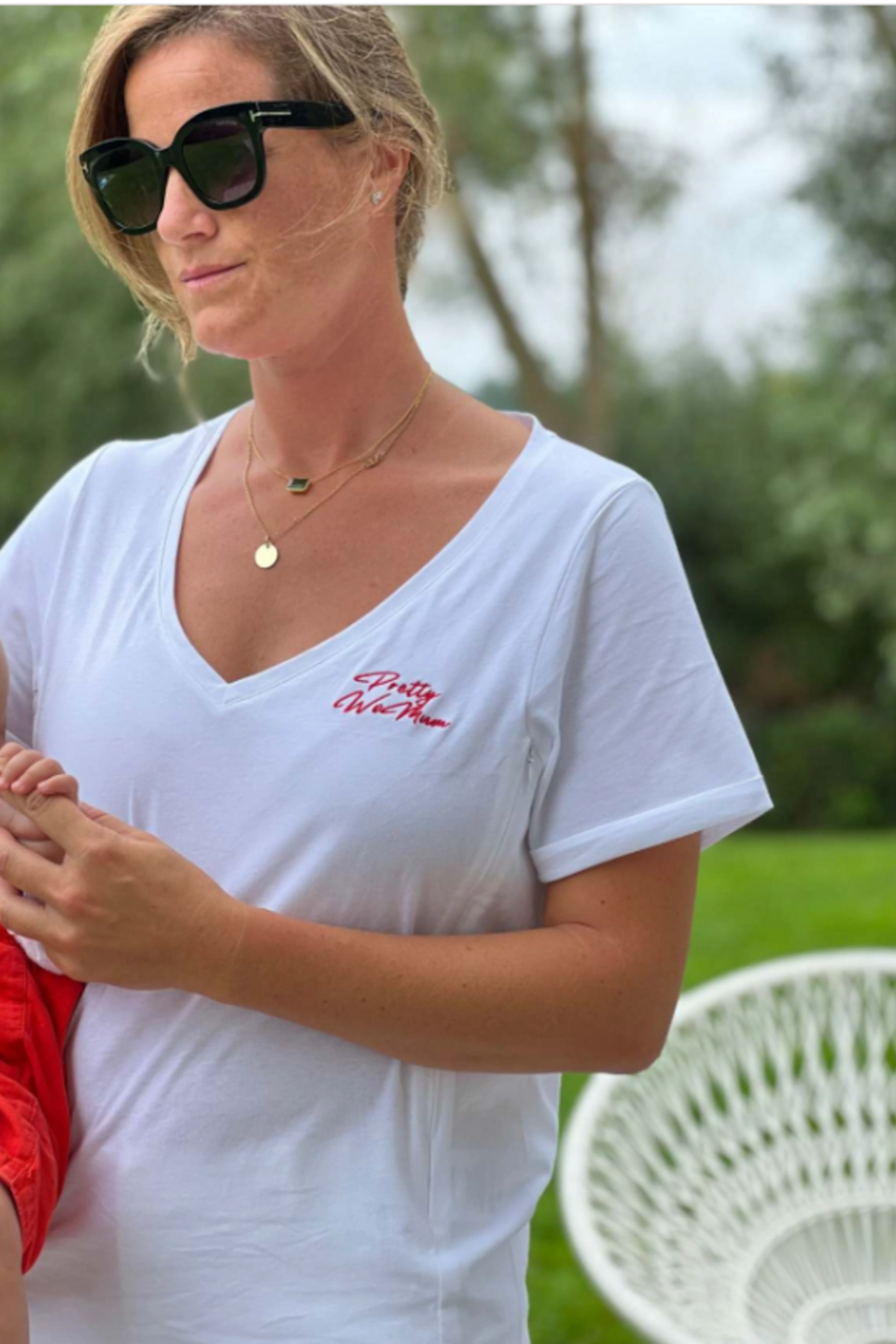 Pour un look estival chic, associez ce t-shirt à des shorts en lin et des sandales dorées. Idéal pour les journées ensoleillées. • T-shirt en coton • Décolleté en V • Manches courtes • Coupe droite • Inscription brodée