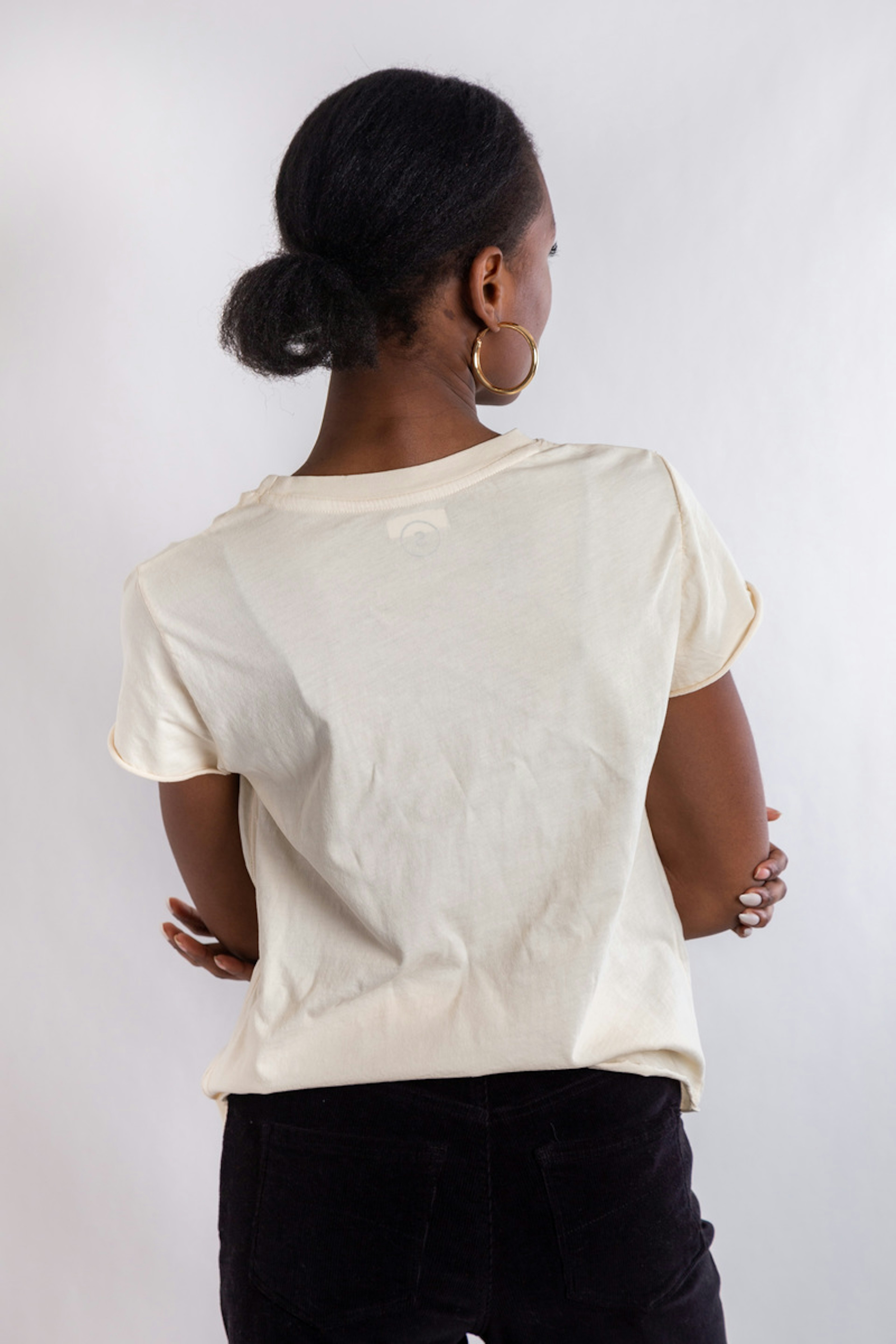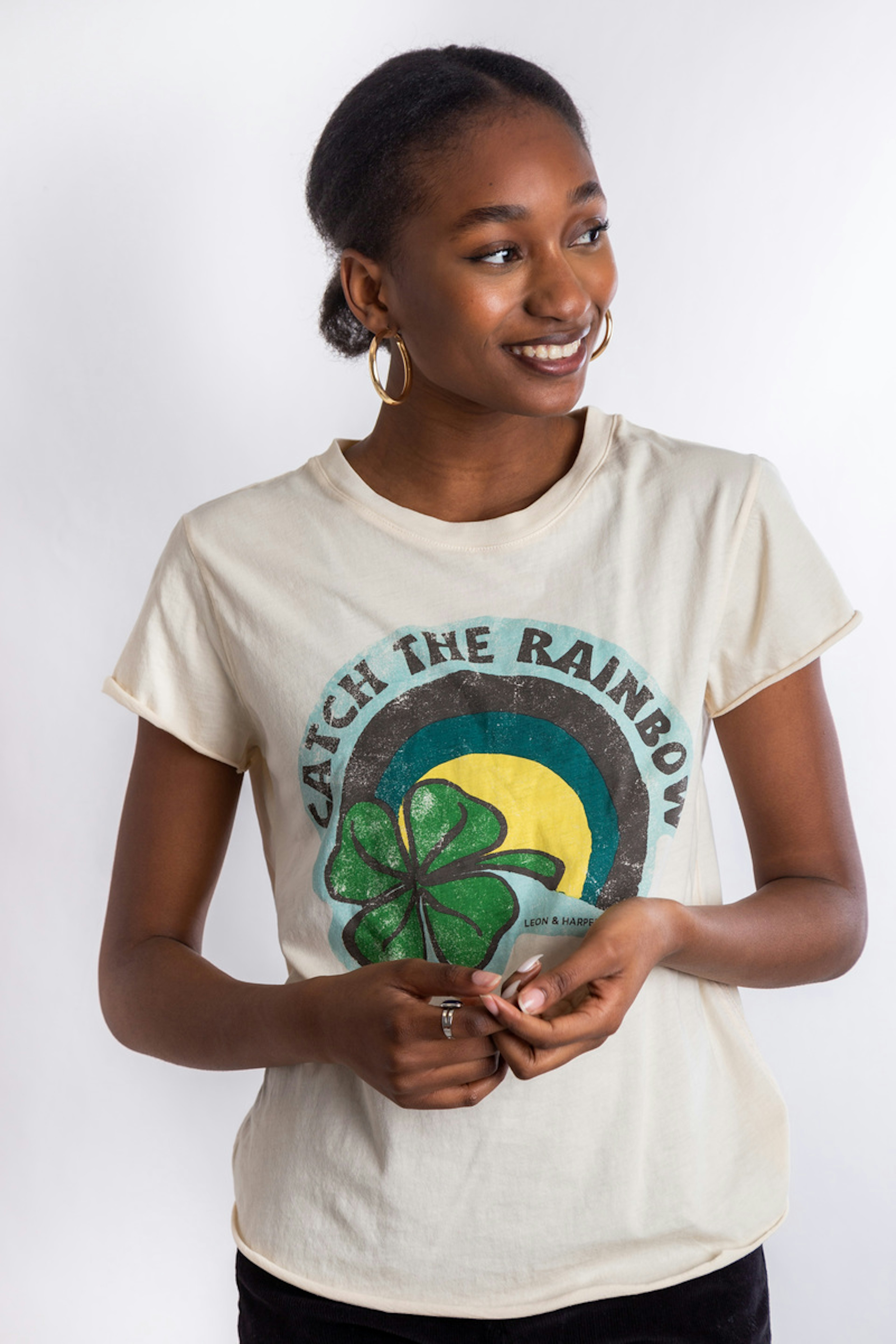 โข T-shirts blanc ร l'esprit vintage de la femme Leon & Harper avec son trรจfle ร 4 feuilles printรฉ โข Manches courtes โข Col rond โข Coupe droite โข Print craquelรฉ โข Composรฉ ร 100% de coton biologique