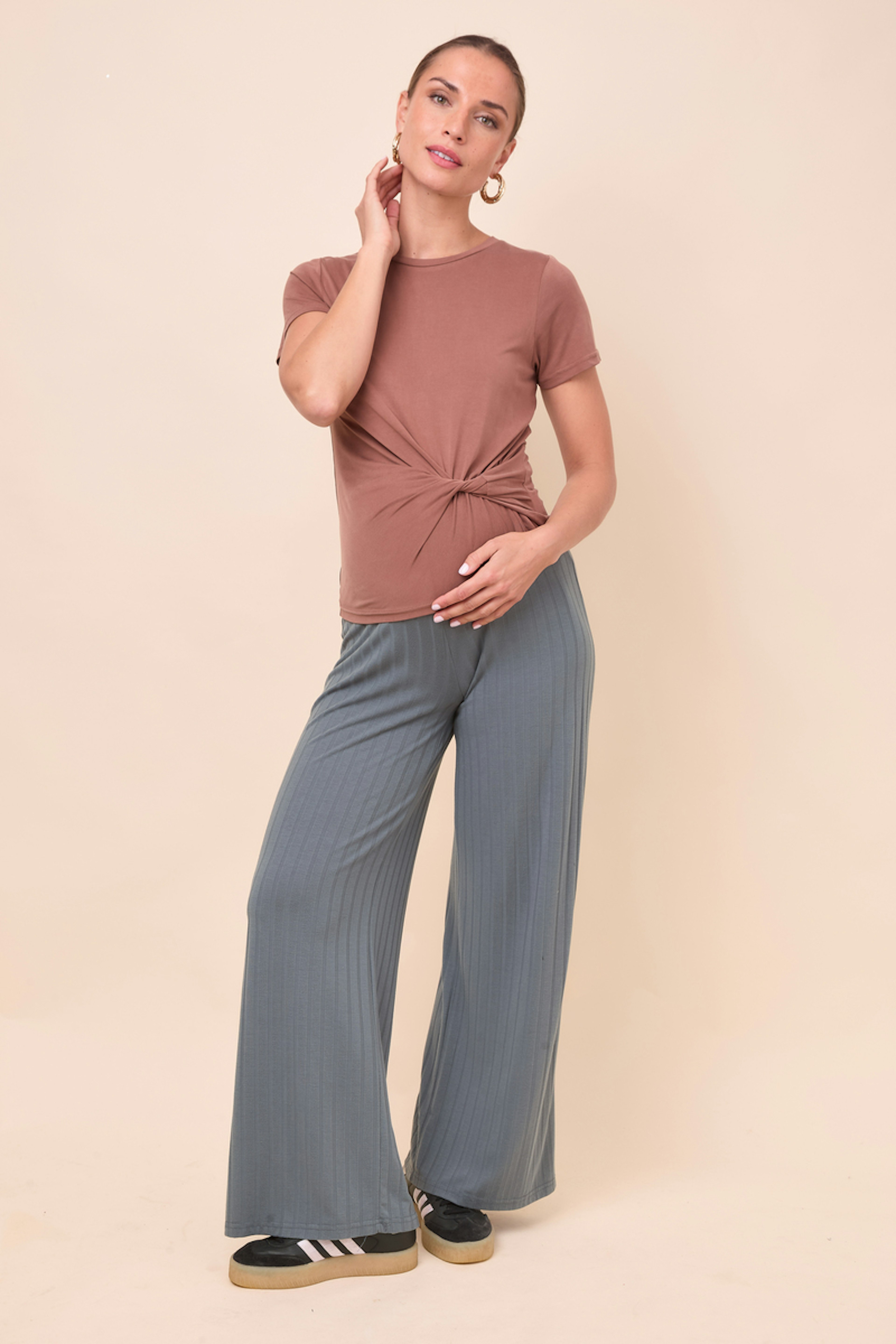 Pour une allure chic et décontractée, associez ce t-shirt avec un pantalon taille haute. Parfait pour les journées ensoleillées. • T-shirt avec nœud • Coupe décontractée • Manches courtes • Col rond classique • Détail noué à la taille