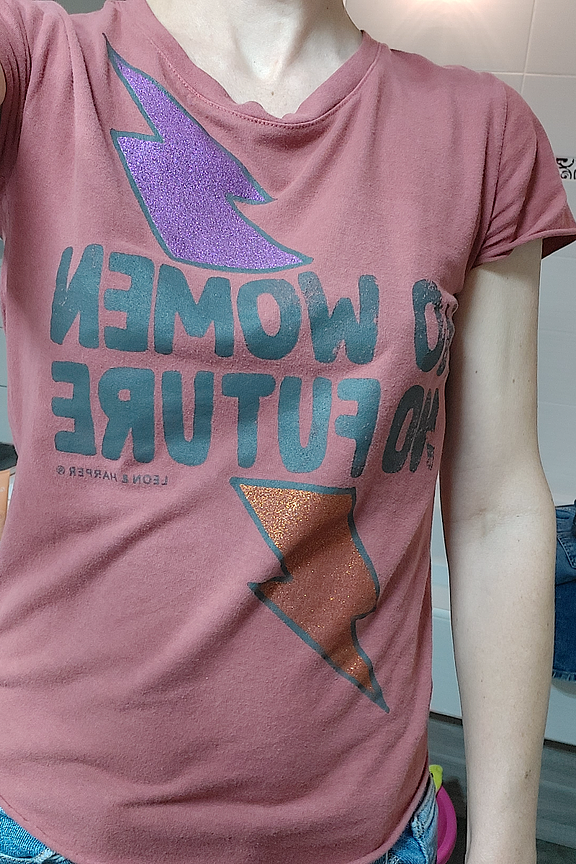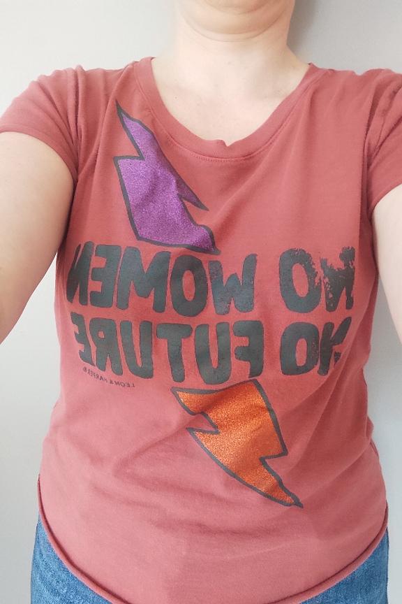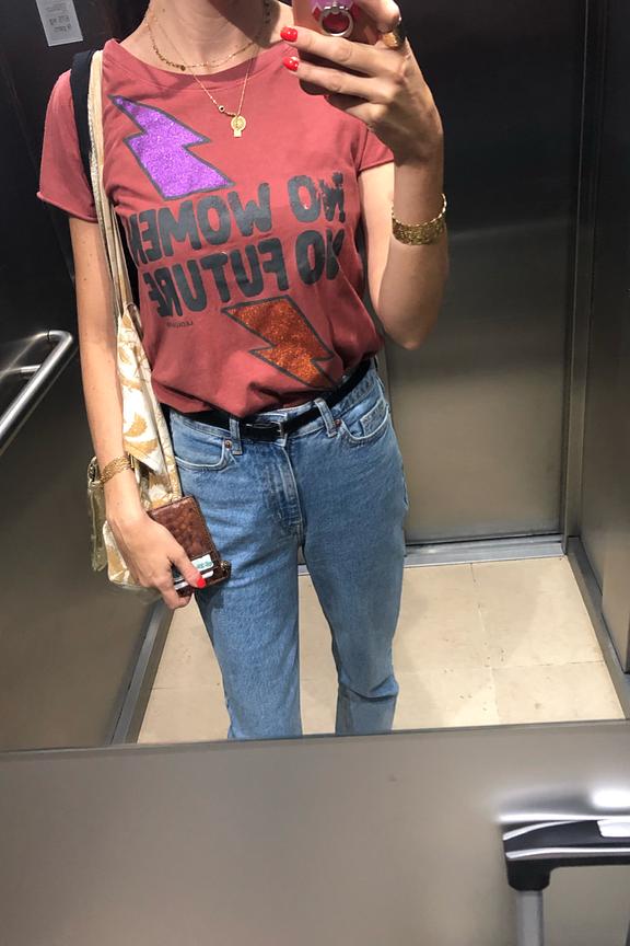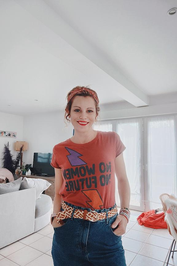 Illuminez votre journรฉe avec ce tee-shirt, parfait pour toute saison. Associez-le ร un jean mom et des baskets pour un look dรฉcontractรฉ ou glissez-le dans une jupe taille haute pour une allure plus sophistiquรฉe. โข Tee-shirt en coton bio โข Manches courtes roulottรฉes โข Col rond classique โข Sรฉrigraphie "No women no future" โข Imprimรฉ audacieux โข Coupe droite confort