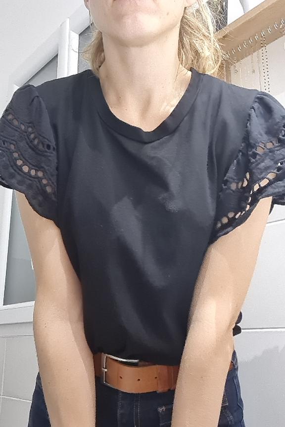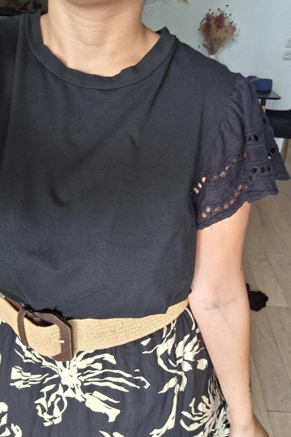 Ajoutez une touche d'รฉlรฉgance ร votre look avec ce tee-shirt noir sophistiquรฉ. Associez-le ร un jean taille haute et des escarpins pour un style chic et dรฉcontractรฉ, ou ร une jupe fluide et des sandales pour une allure estivale. Parfait pour l'รฉtรฉ. โข Tee-shirt ร manches courtes โข Manches dรฉcorรฉes de dentelle ajourรฉe โข Encolure ronde โข Matiรจre douce et respirante โข Coupe dรฉcontractรฉe