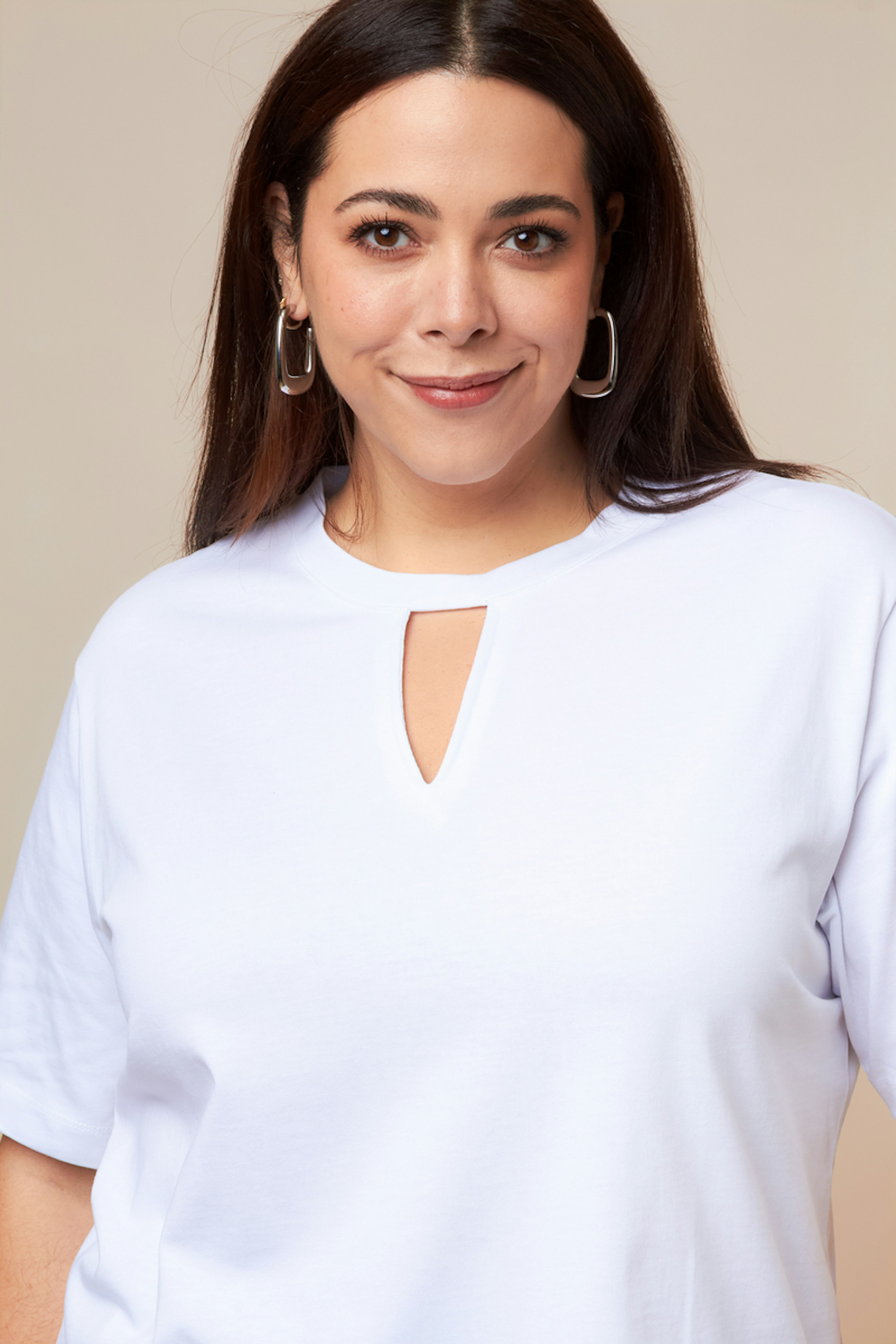 Associez ce t-shirt blanc avec un jean ou une jupe colorée pour un look frais et moderne. Parfait en toute saison. • T-shirt à découpe moderne • Coupe confortable et légèrement ample • Manches courtes décontractées • Col rond avec ouverture originale • Blanc éclatant