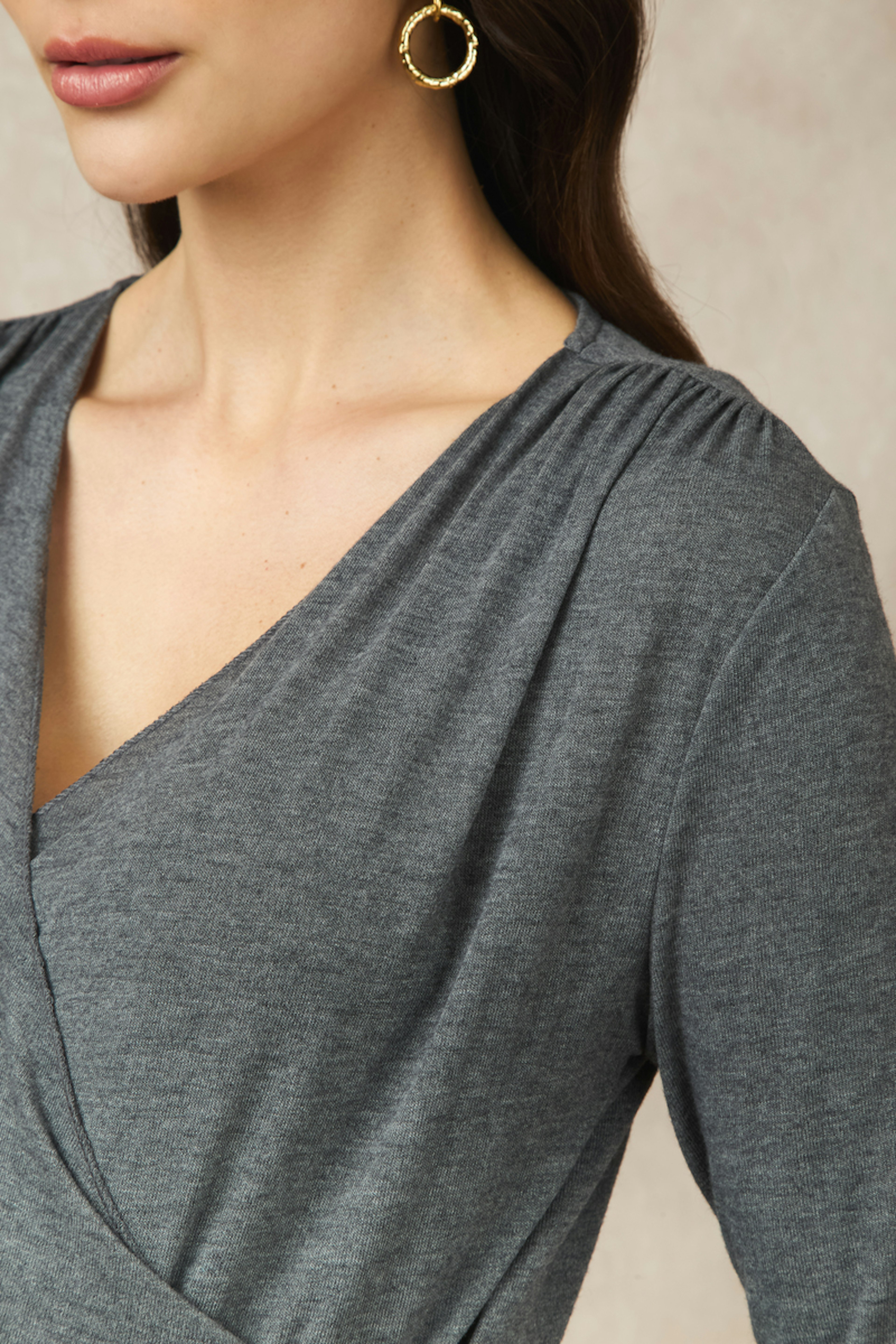 Ajoutez une écharpe colorée et un jean slim pour un look hivernal chic et confortable. • Tee-shirt à manches longues • Col en V flatteur • Coupe ajustée • Effet drapé sur le devant • Parfait pour la maternité