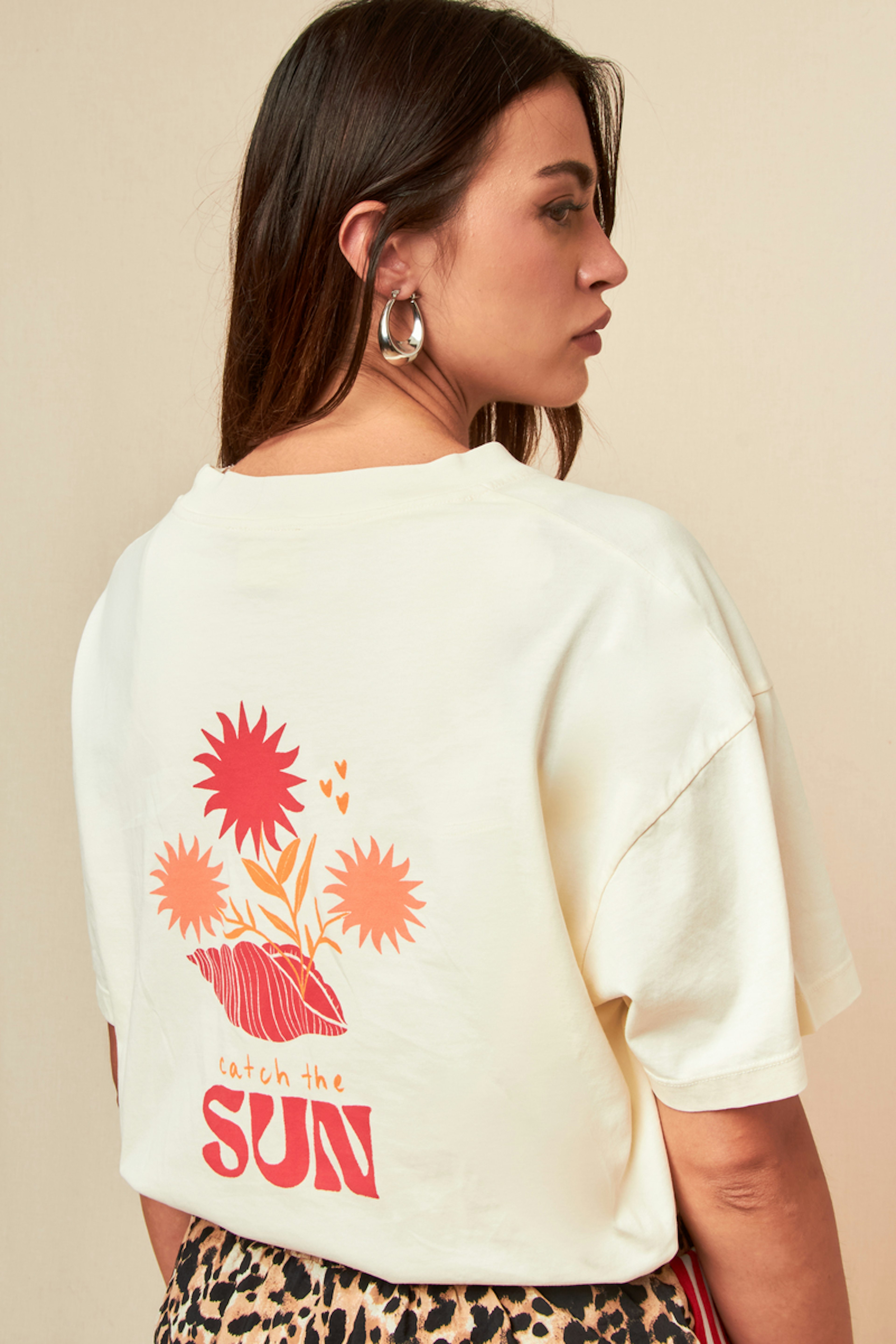 Portez ce tee-shirt avec un pantalon large ou une jupe longue pour un look décontracté chic. Parfait en toute saison. • Tee-shirt en coton biologique • Coupe ample • Manches courtes • Encolure ronde • Motif imprimé discret