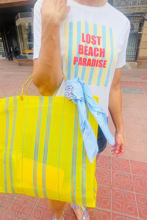 Ajoutez une touche de fraรฎcheur estivale ร votre garde-robe avec ce tee-shirt รฉclatant! Associez-le ร un short en jean taille haute et ร des sandales plates pour un look dรฉcontractรฉ et tendance. Idรฉal pour les journรฉes ensoleillรฉes et les soirรฉes d'รฉtรฉ. โข Tee-shirt en coton โข Coupe crop โข Manches courtes โข Col rond โข Motif rayรฉ avec texte "Lost Beach Paradise"