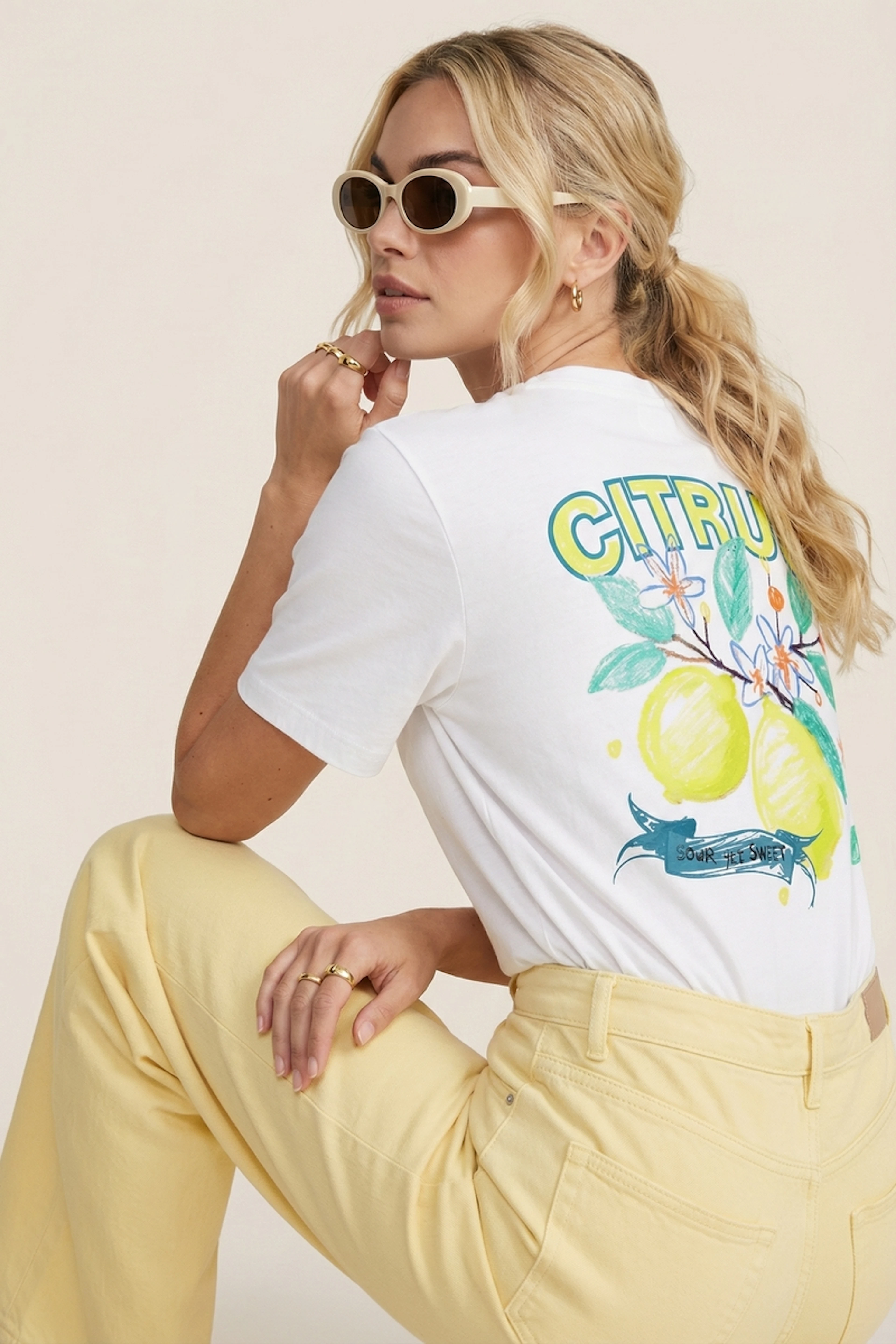 Associez ce t-shirt à un short en jean et des sandales pour un look d'été rafraîchissant. • T-shirt en coton • Coupe décontractée • Manches courtes • Imprimé Citrus au dos • Col rond classique