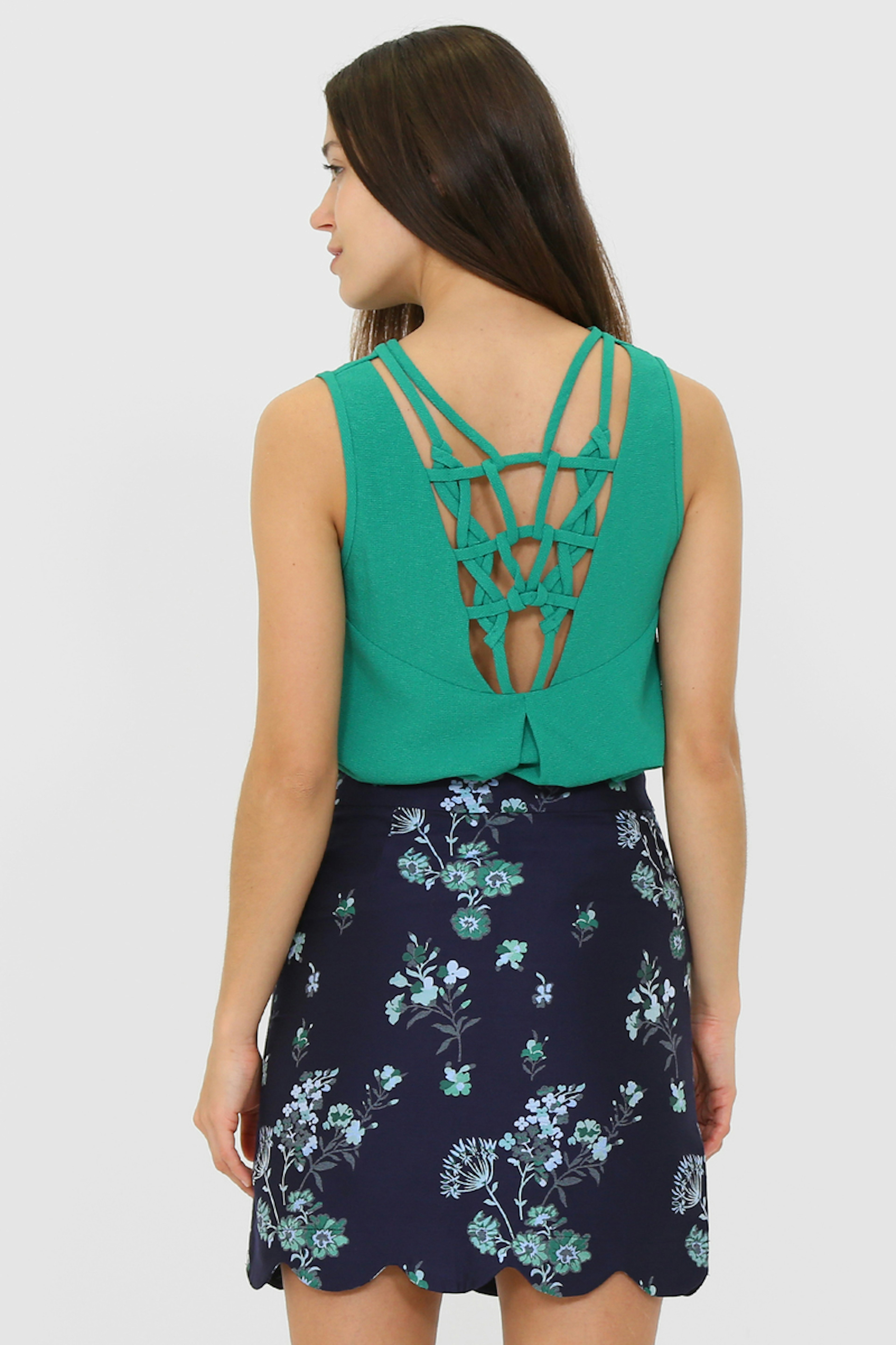 Top vert, manches courtes, col rond avec effet tressรฉ dans le dos.