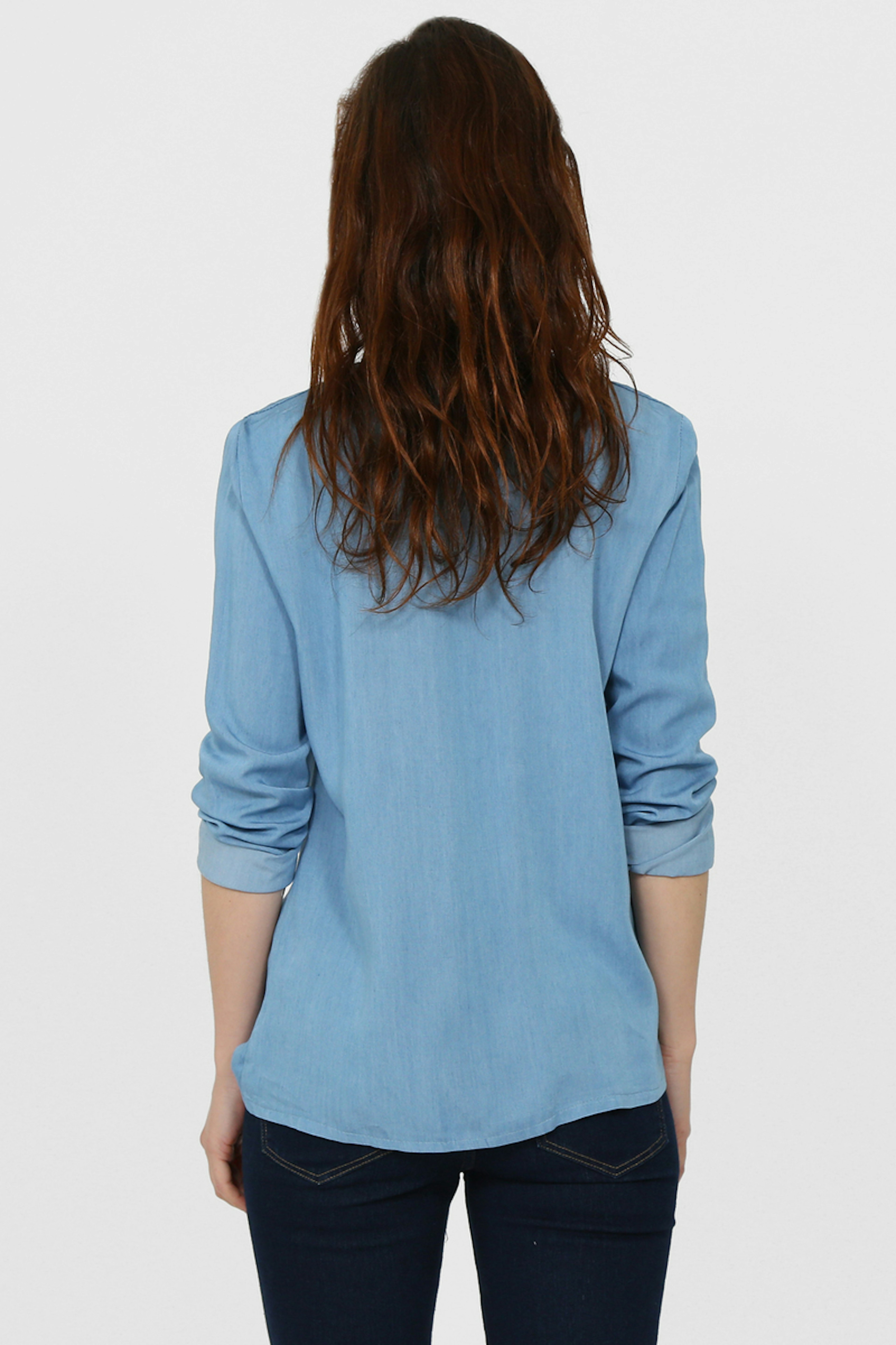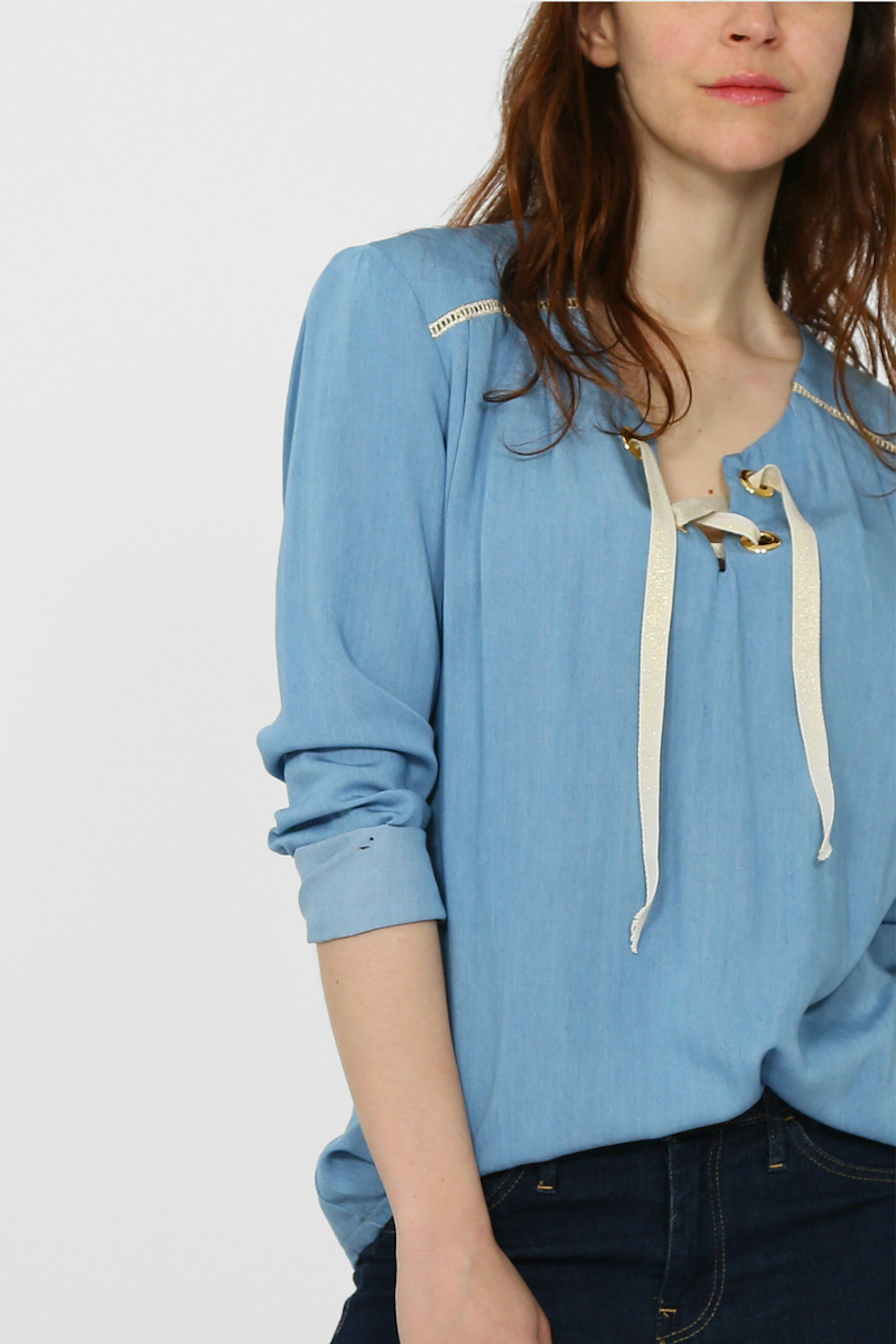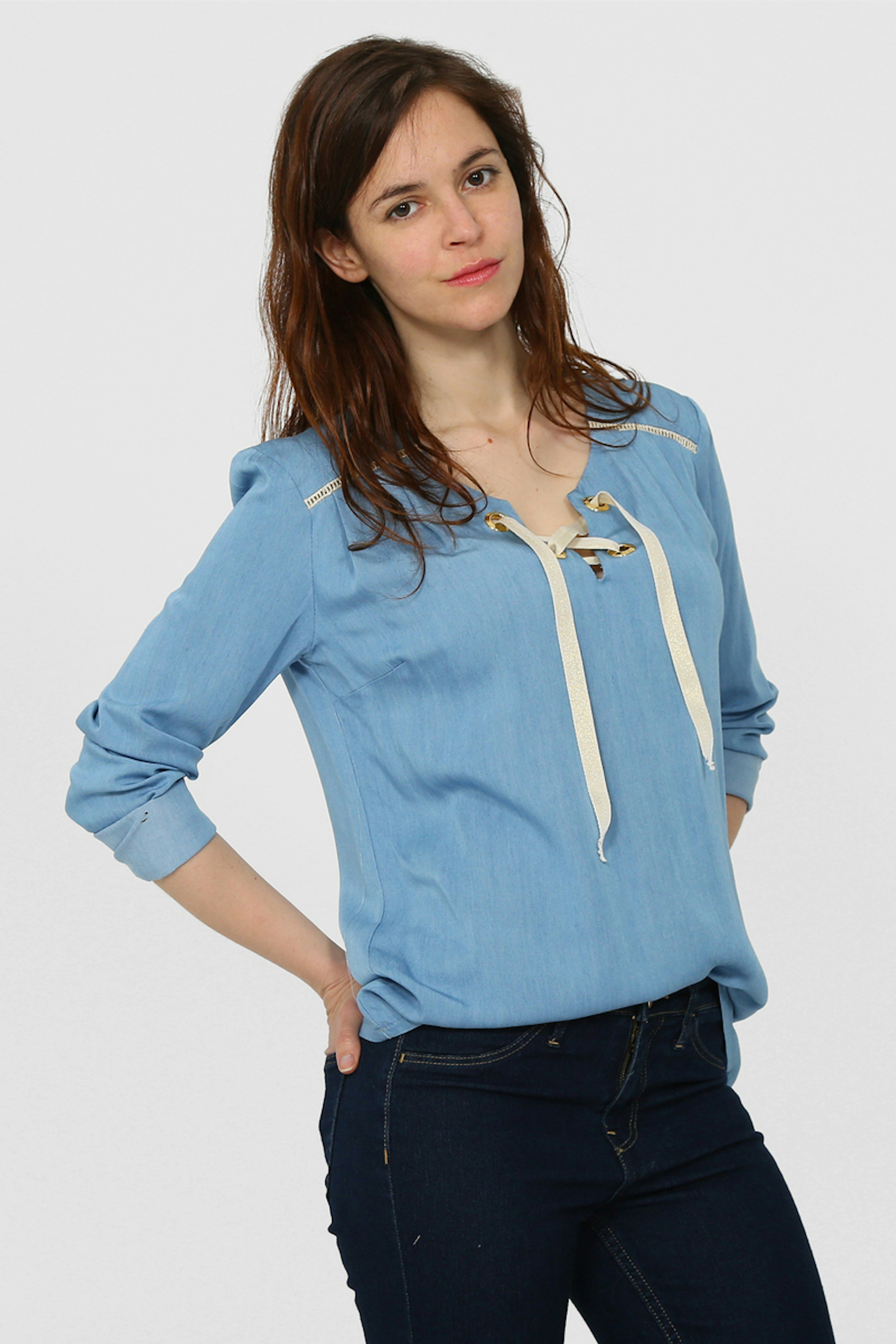 Top bleu denim avec laรงage sur le devant, manches longues et col rond.