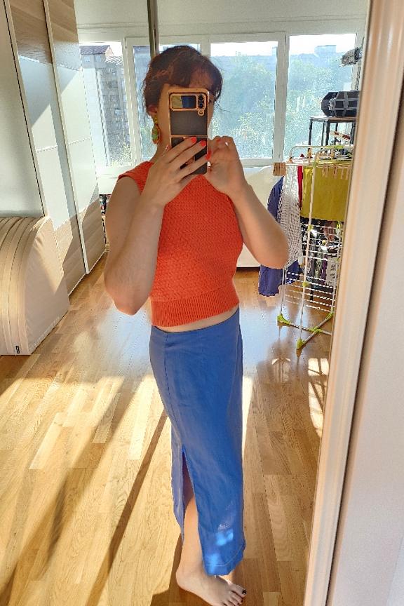 โ2e fois que je le loue, j'adore sa couleur et sa matiรจre pour l'รฉtรฉ. Je prends tjs une taille au-dessus (le 40/L pour mon 1m60 avec petit buste)โ