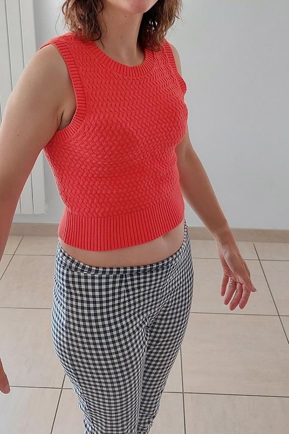 โข Pull en maille orange โข Dรฉtails de mailles tressรฉs โข Sans manches โข Col rond โข Bords cรดtes โข Coupe droite