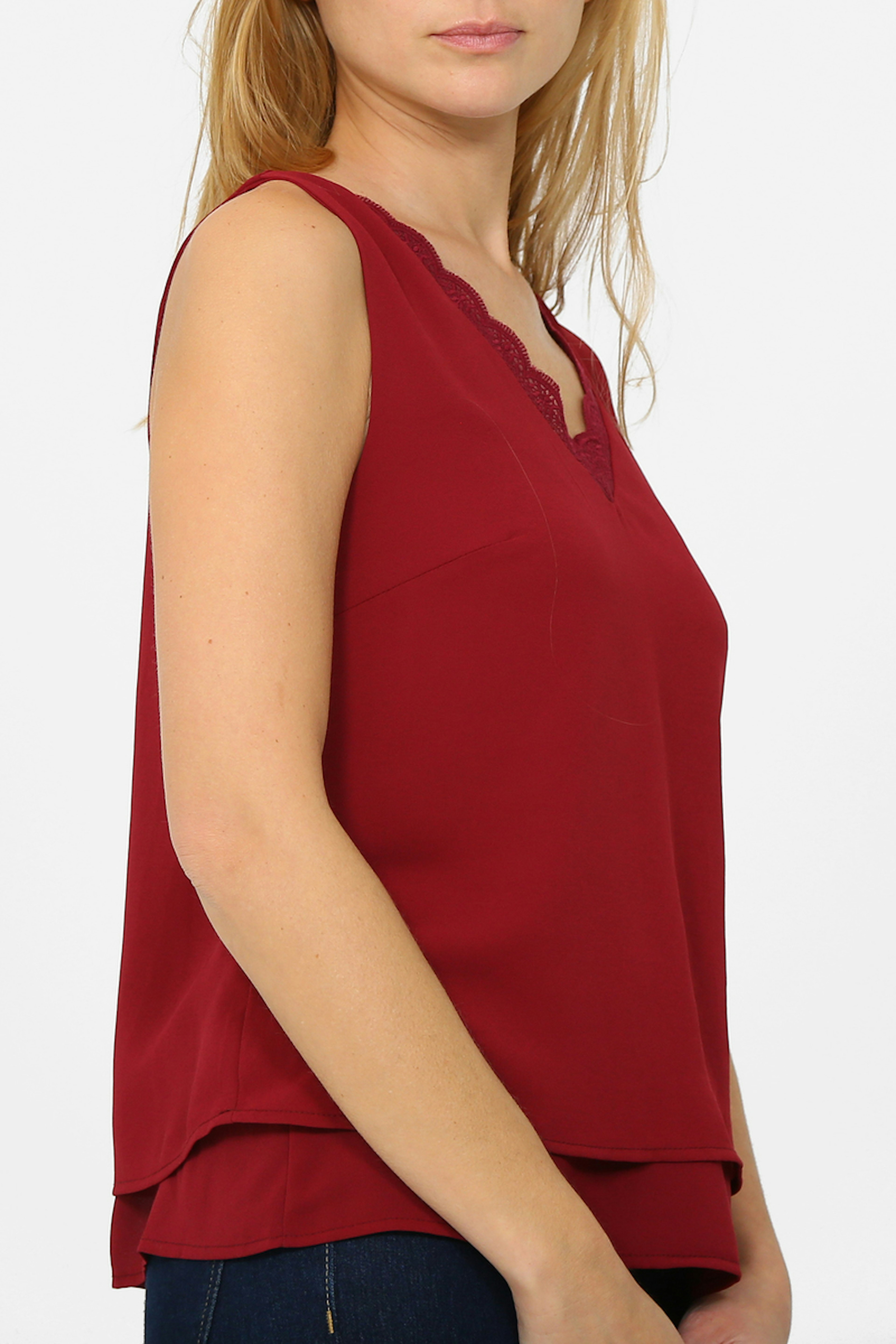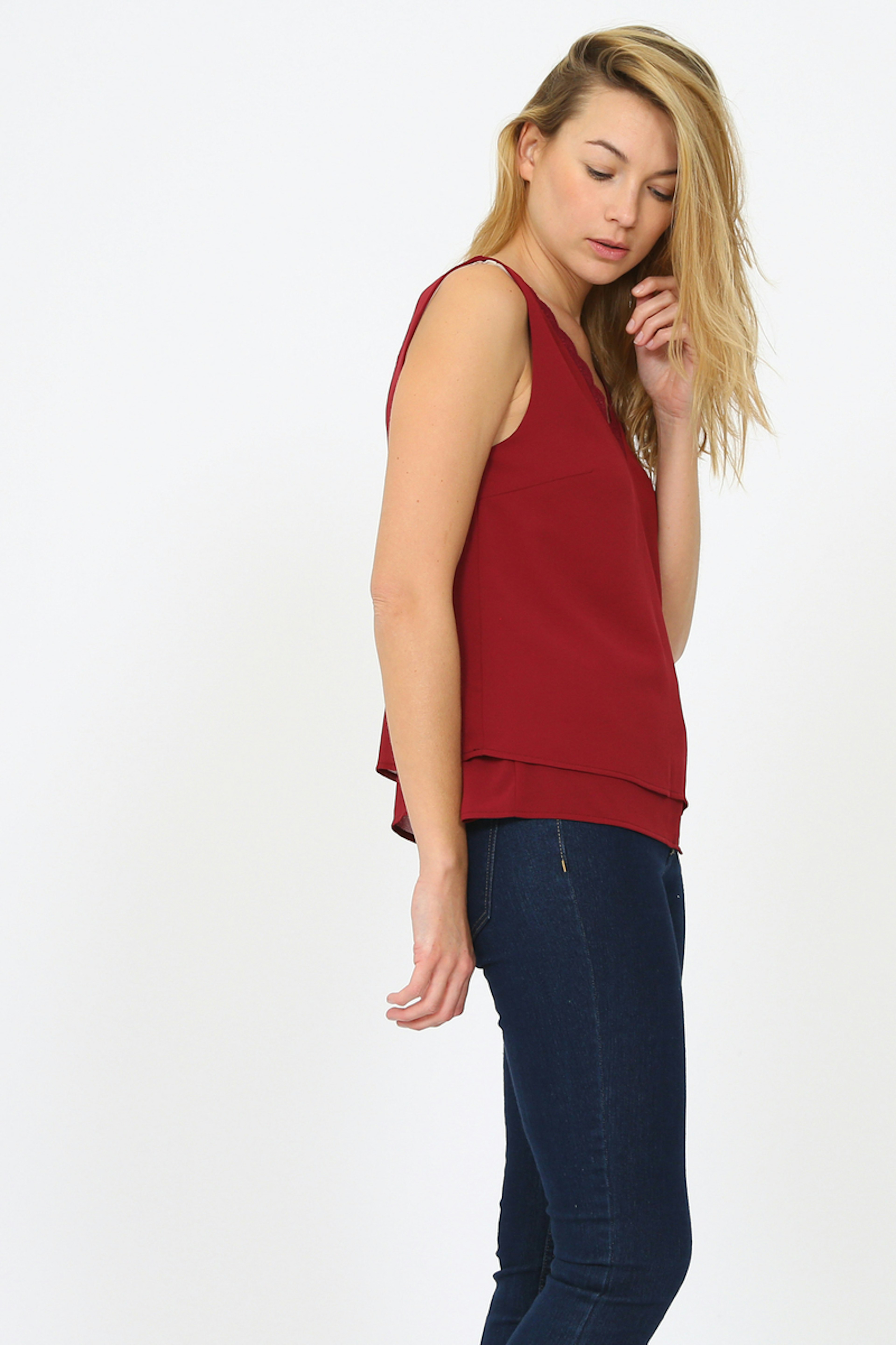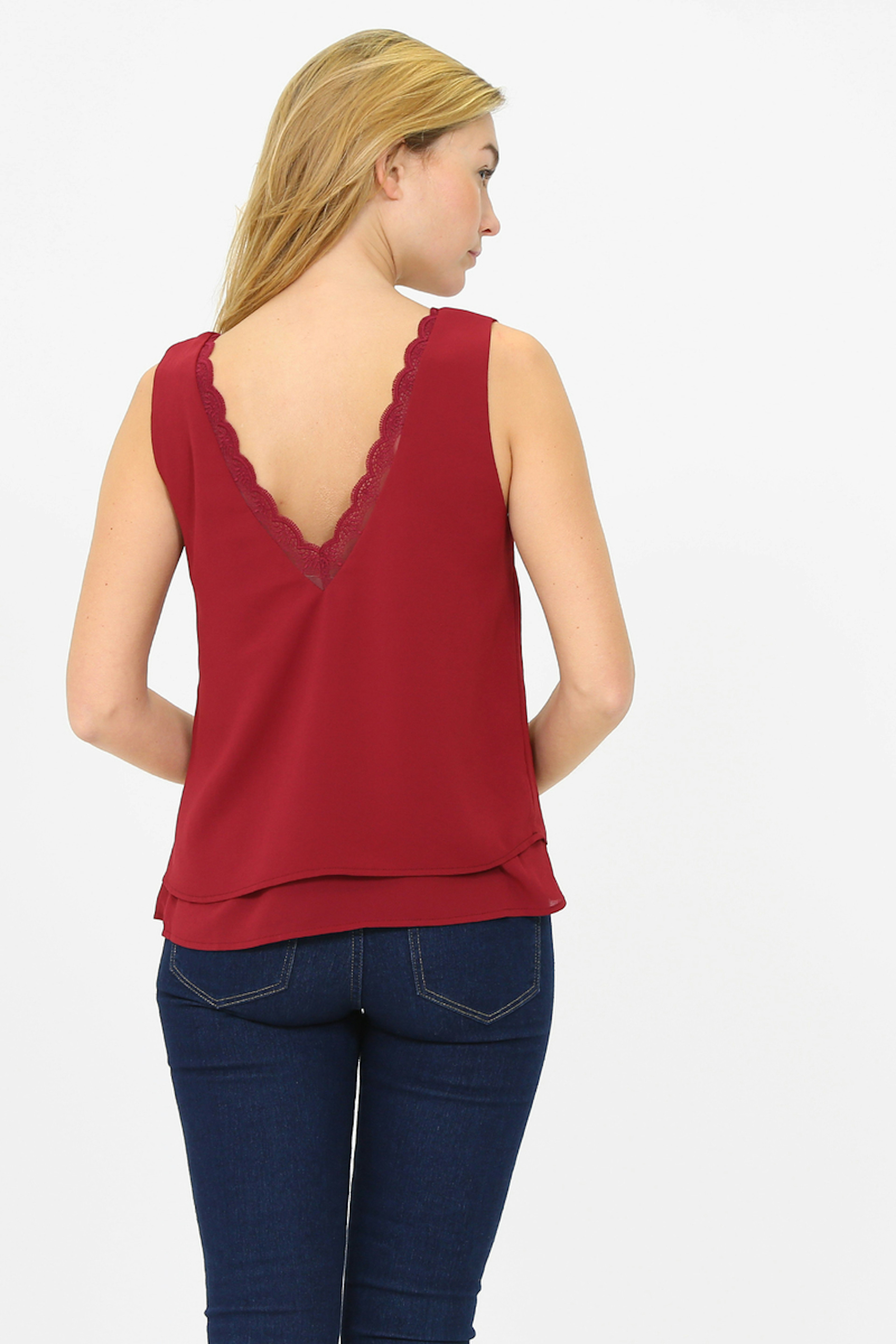Top couleur bordeaux, sans manches, dรฉcolletรฉ en V devant et dans le dos avec bordure en dentelle.