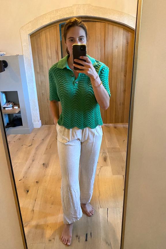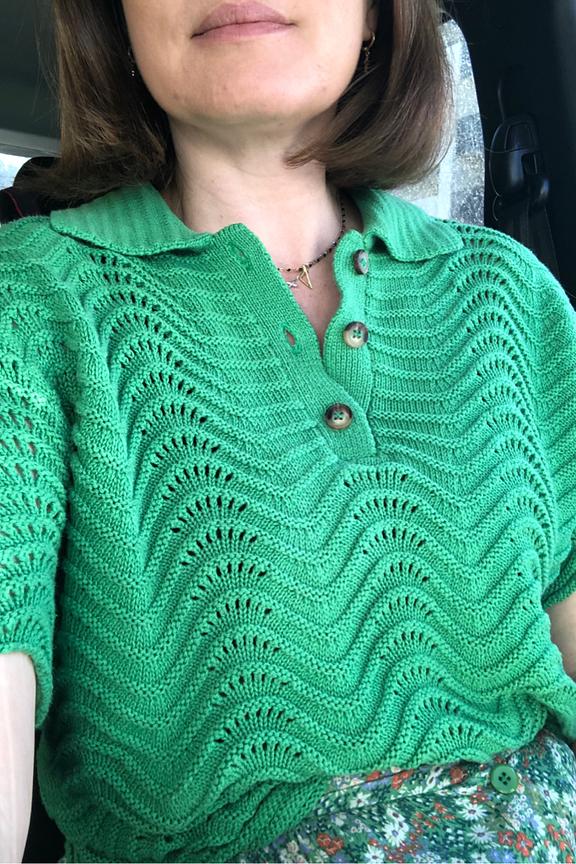 โข Maille travaillรฉe โข Toucher coton โข Coupe courte โข Longueur hanches โข Col chemise boutonnรฉ en maille โข Manches courtes โข Finitions roulottรฉes en maille โข La taille unique convient du 34 au 42 โข Longueur du produit depuis l'รฉpaule pour la taille unique : 51,5cm