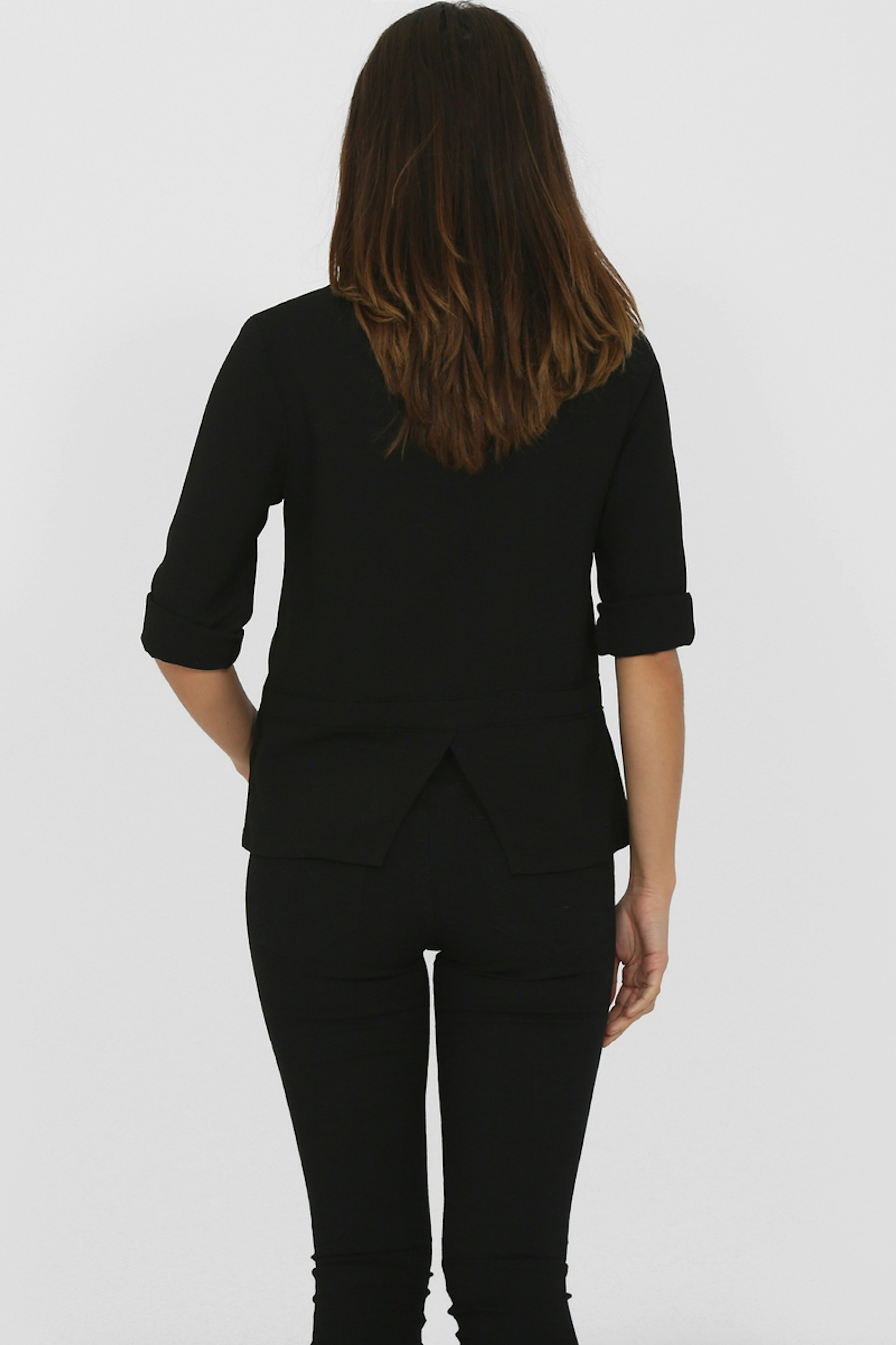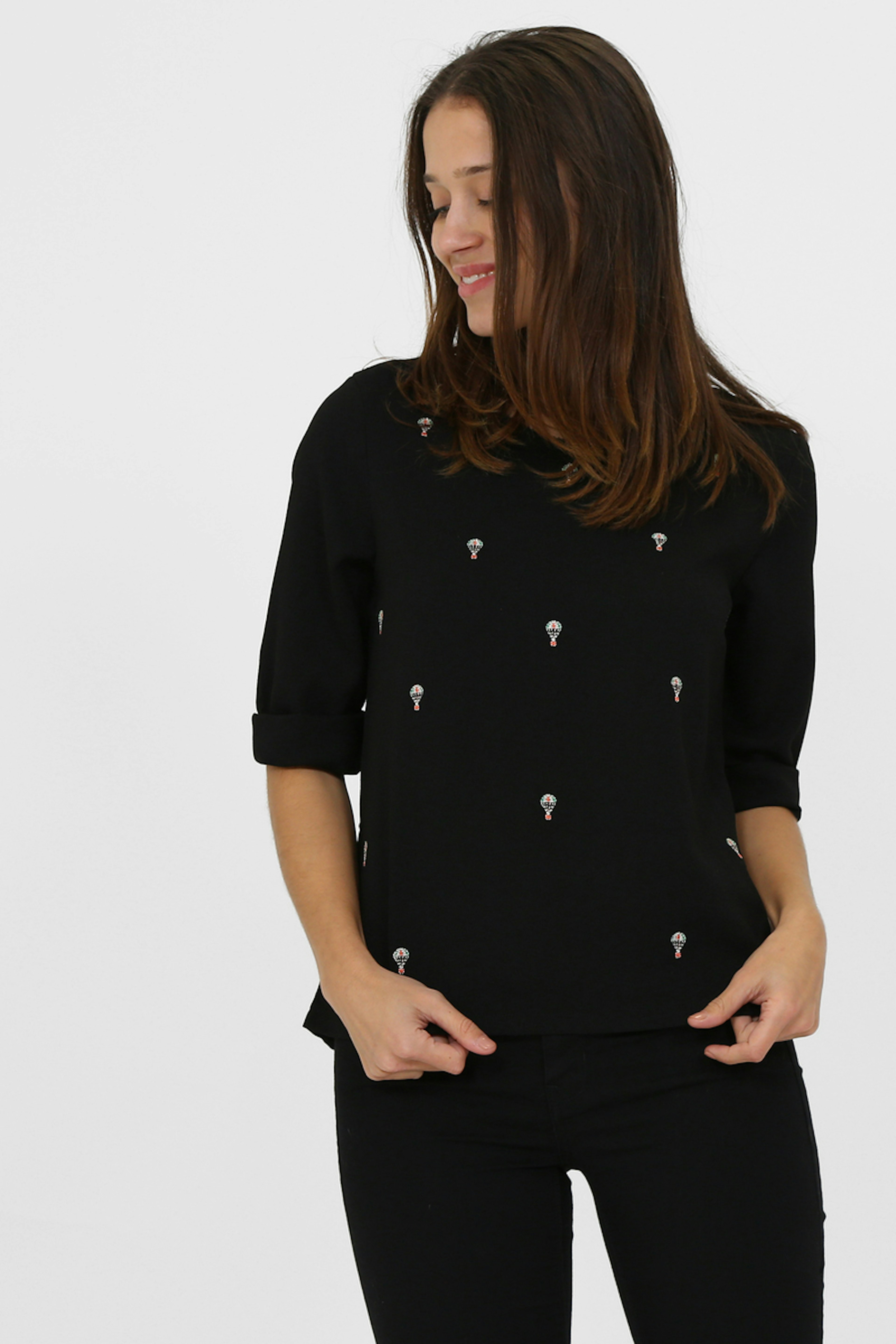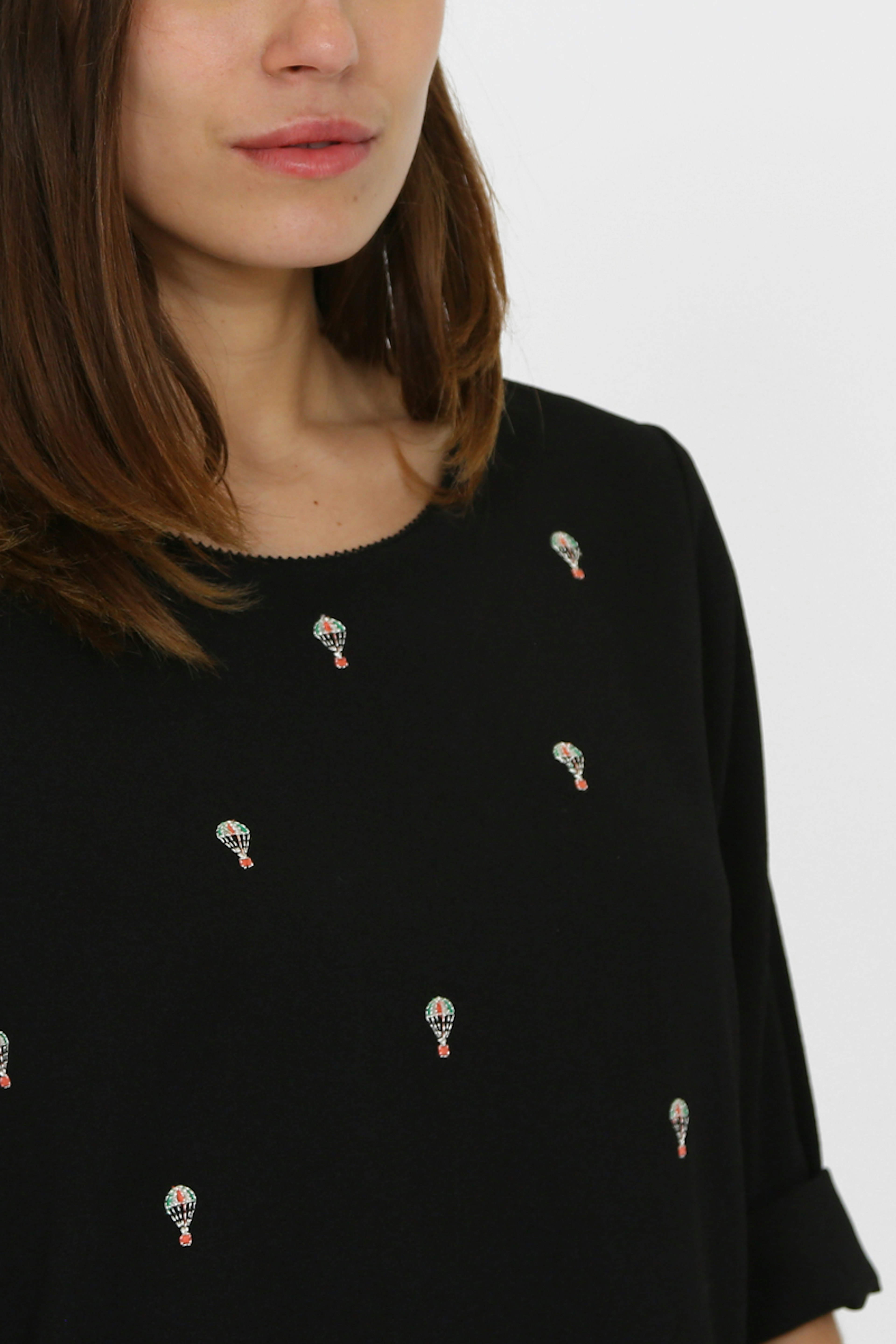 Top noir avec imprimรฉ montgolfiรจre sur le devant, manches 3/4 et col rond.