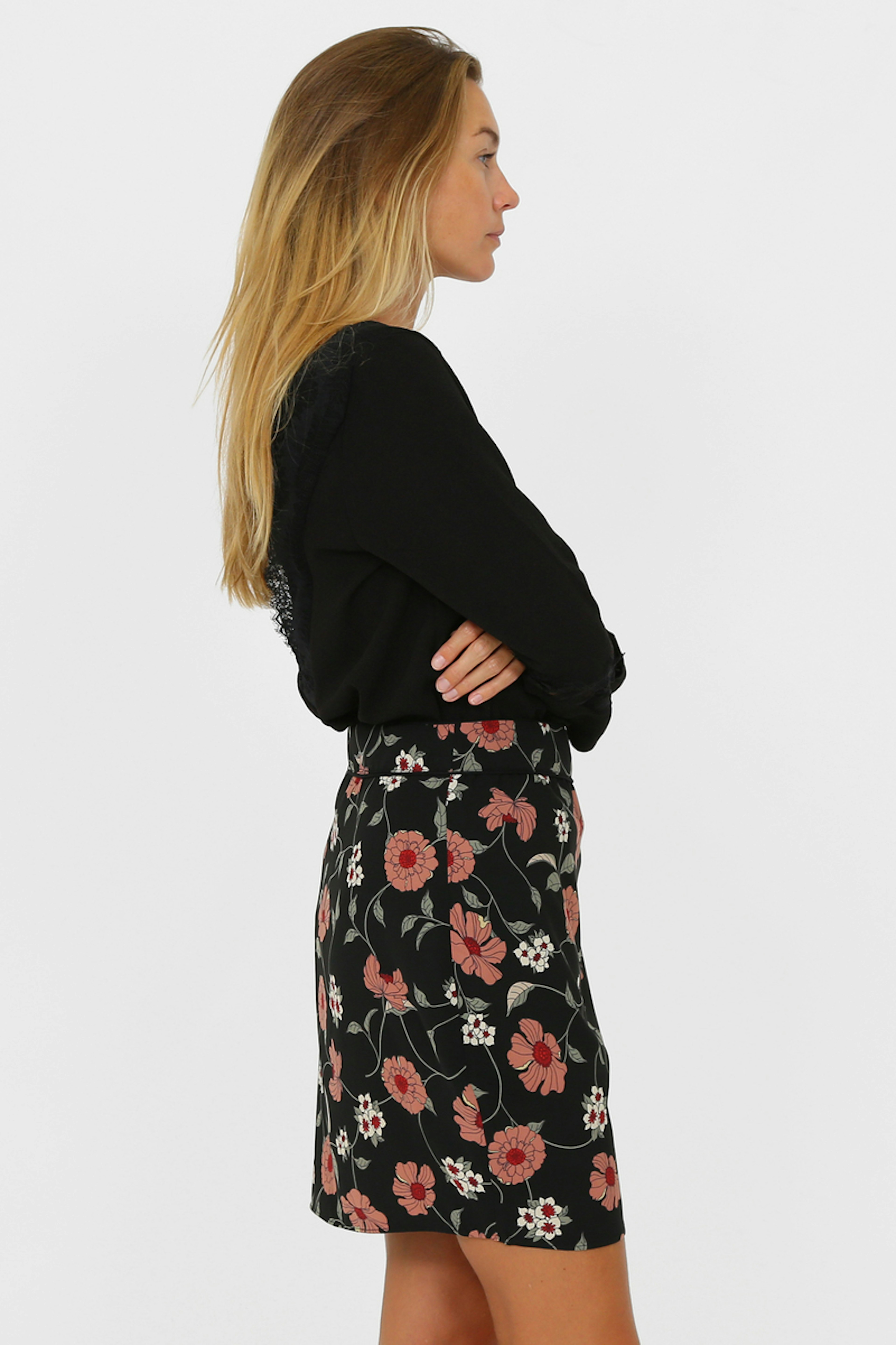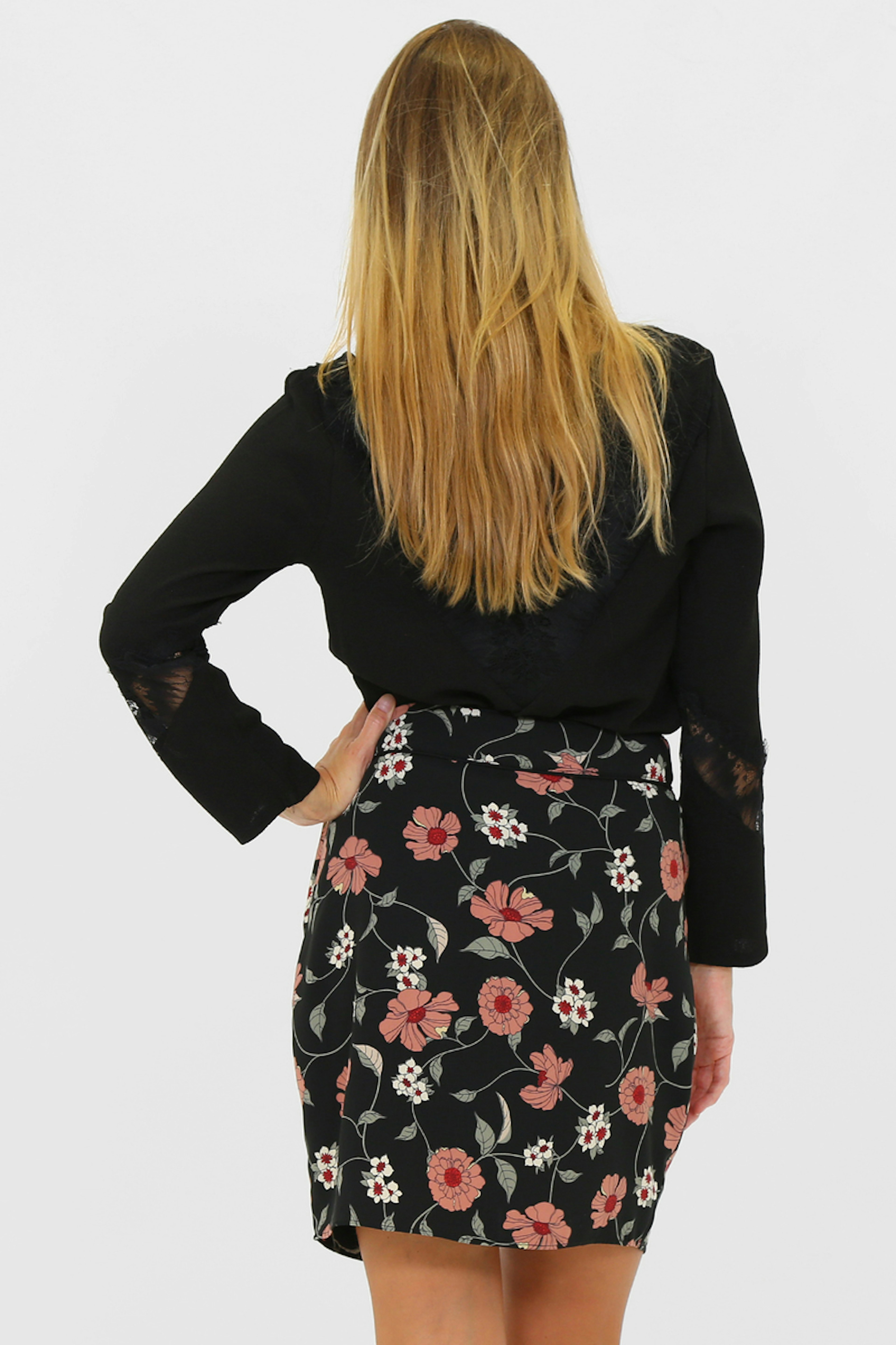 Top ร manches longues noir avec col en V et dรฉtails de dentelle sur le devant et le dos ainsi que sur les manches.
