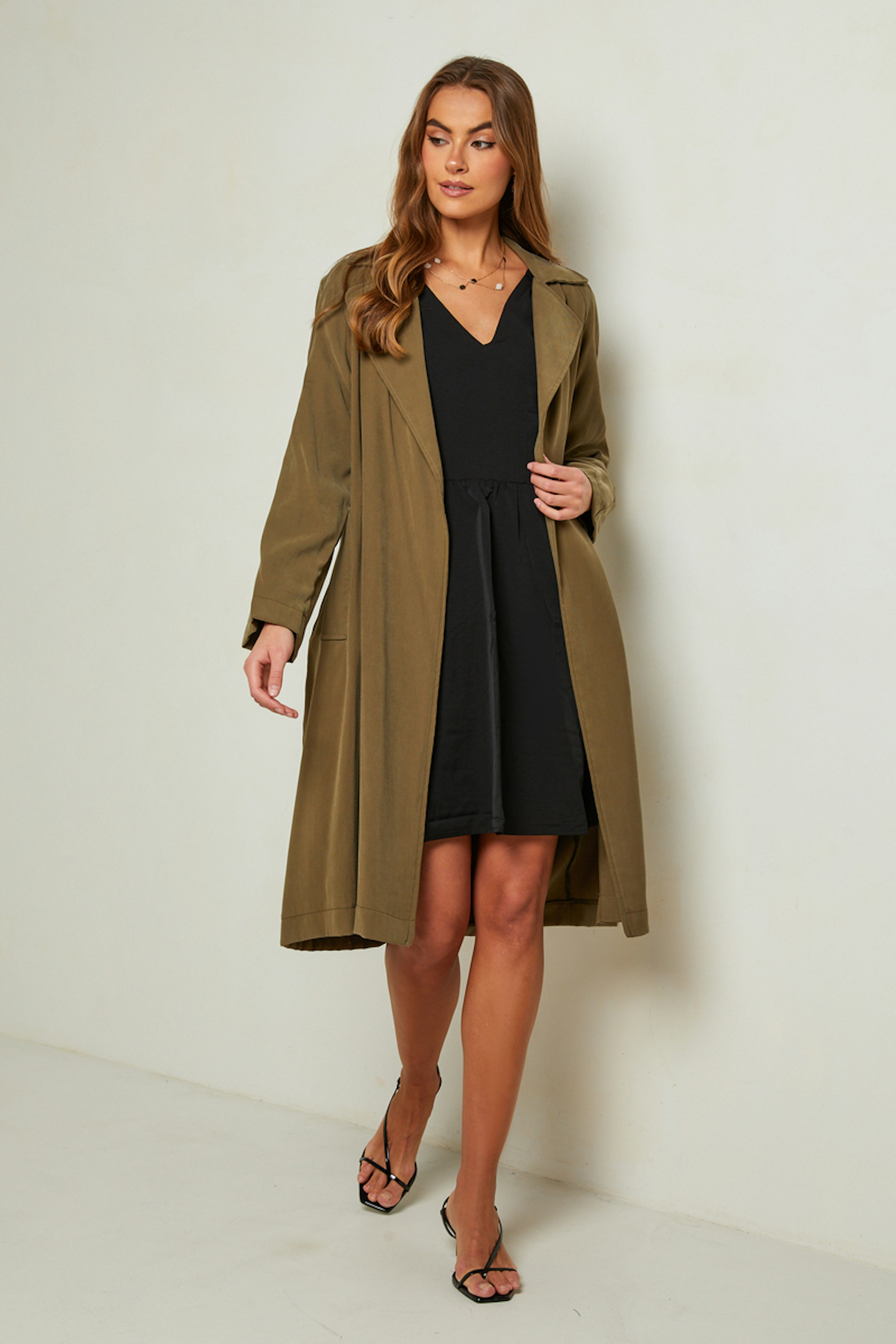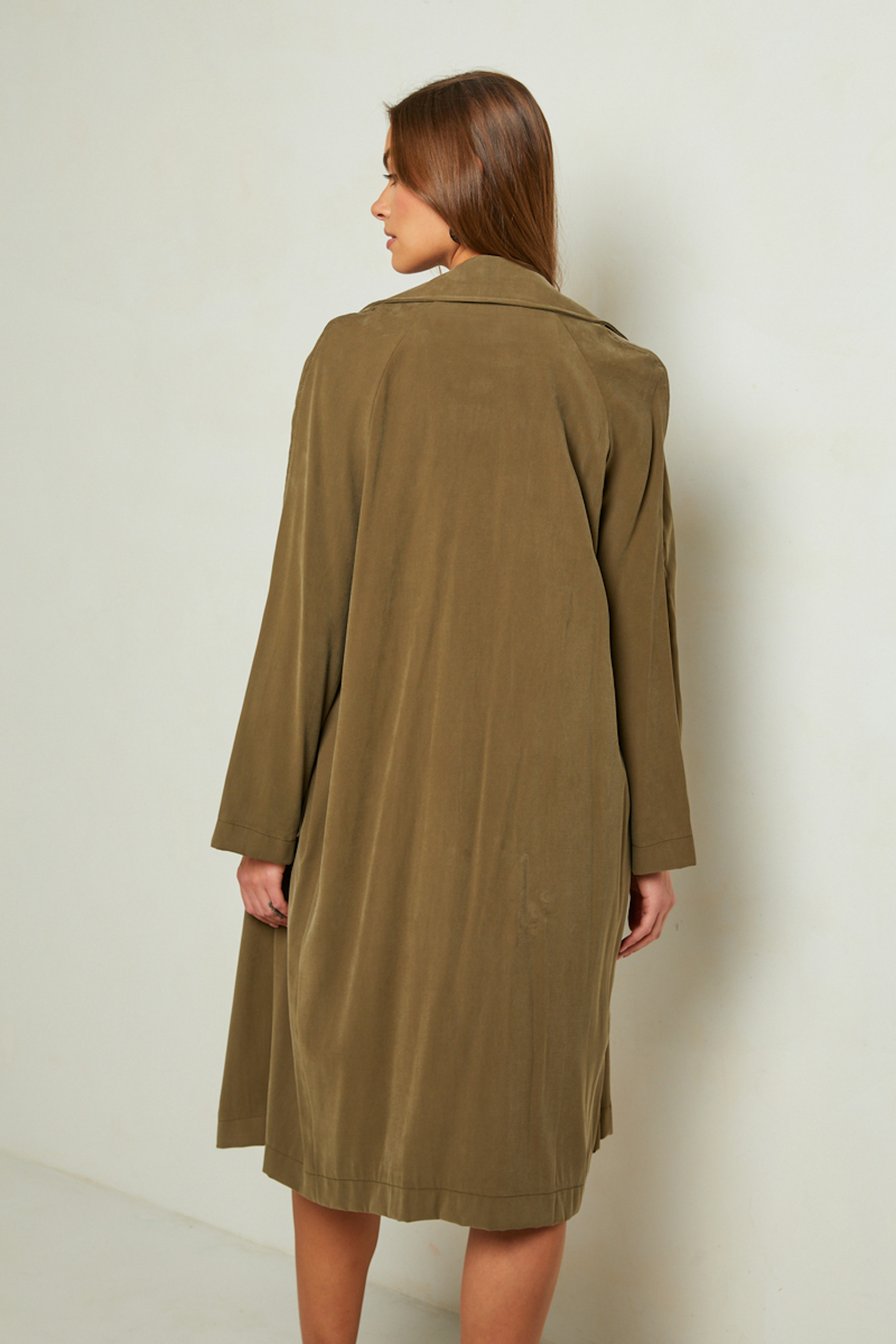 โข Trench long โข Couleur unie kaki โข Manches longues โข Coupe fluide lรฉgรจrement oversize โข Fabriquรฉ en France
