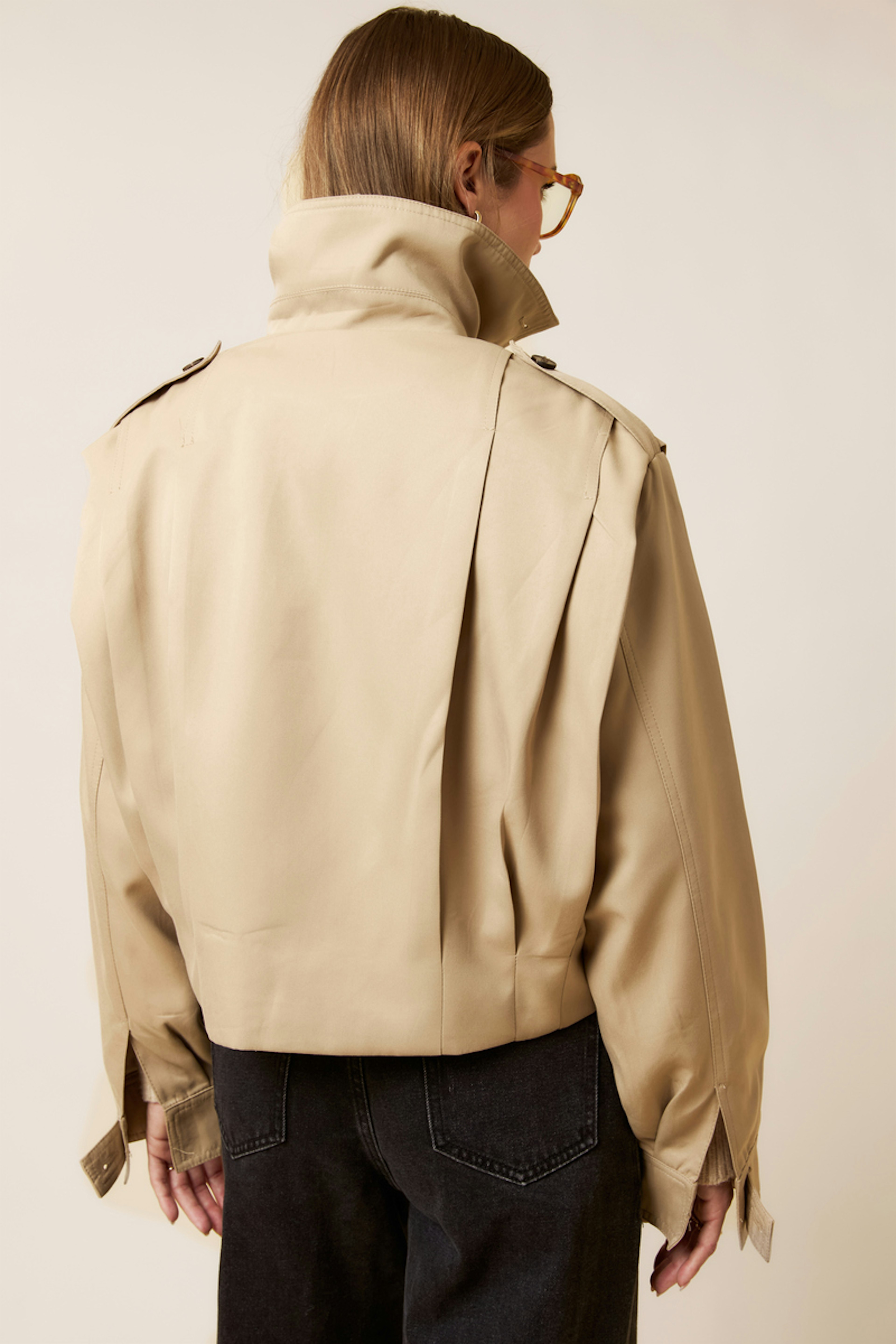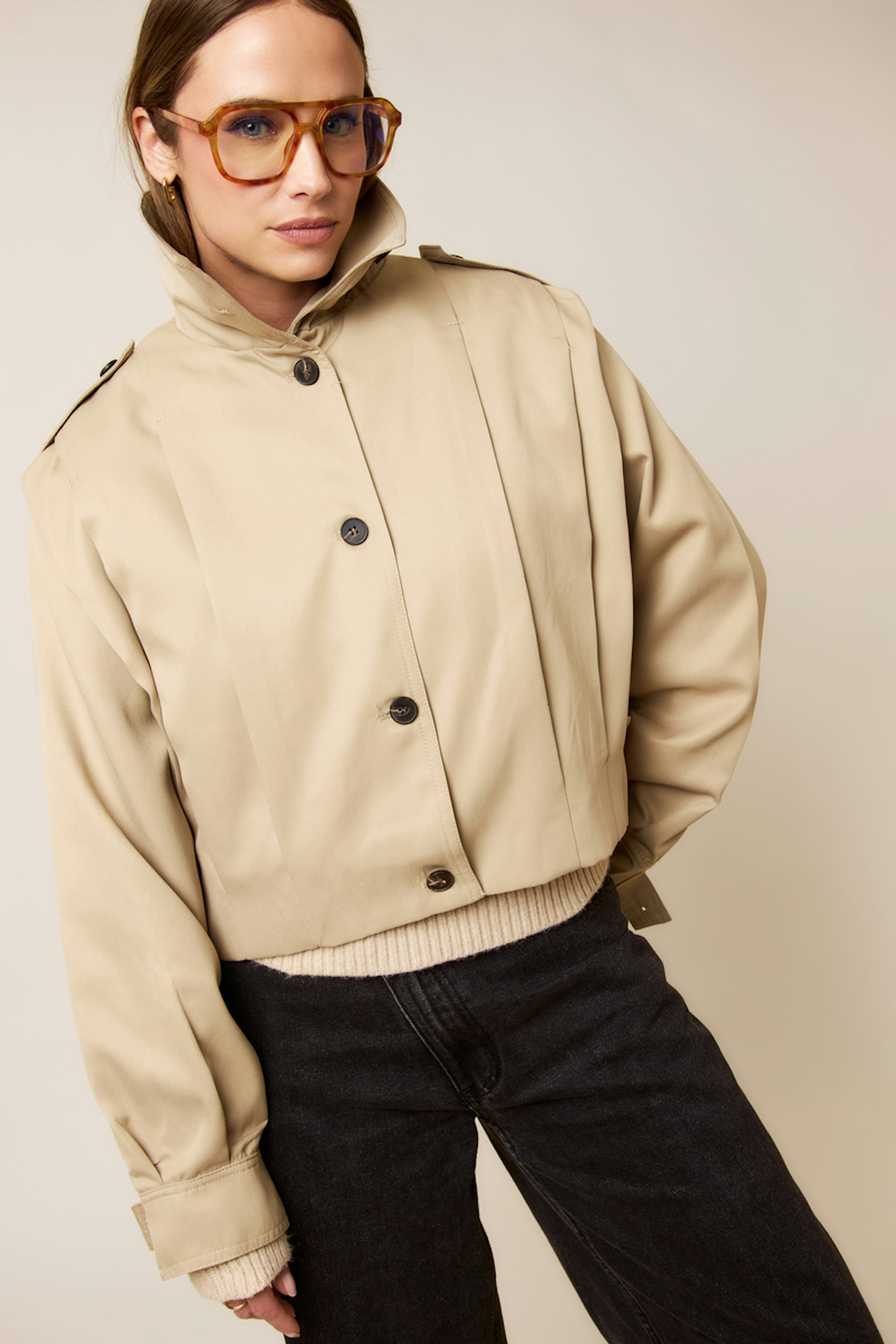Portez ce trench avec un pull léger et des bottines pour un look chic en hiver. • Trench moderne • Coupe courte • Épaules structurées • Manches longues • Détails de ceinture