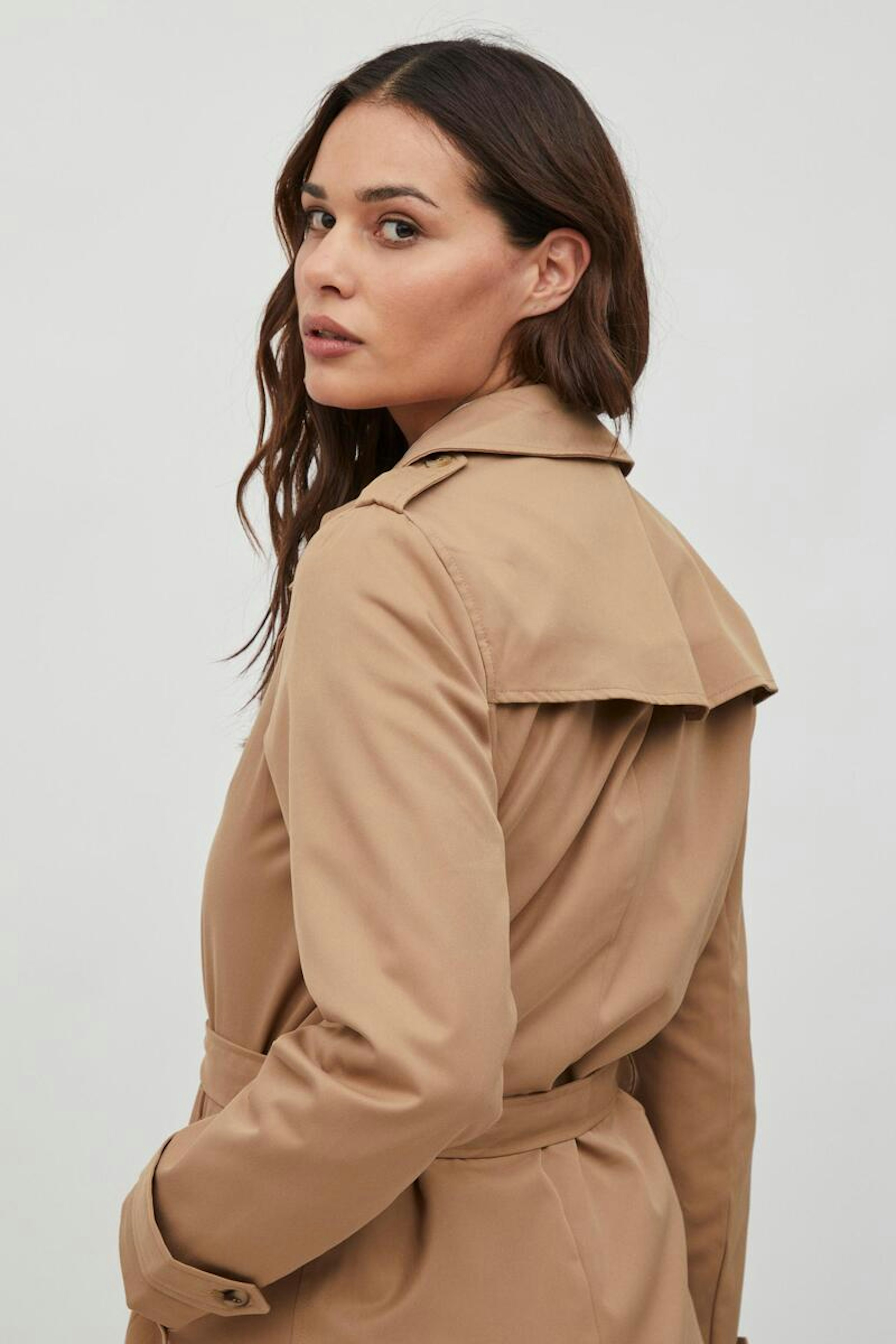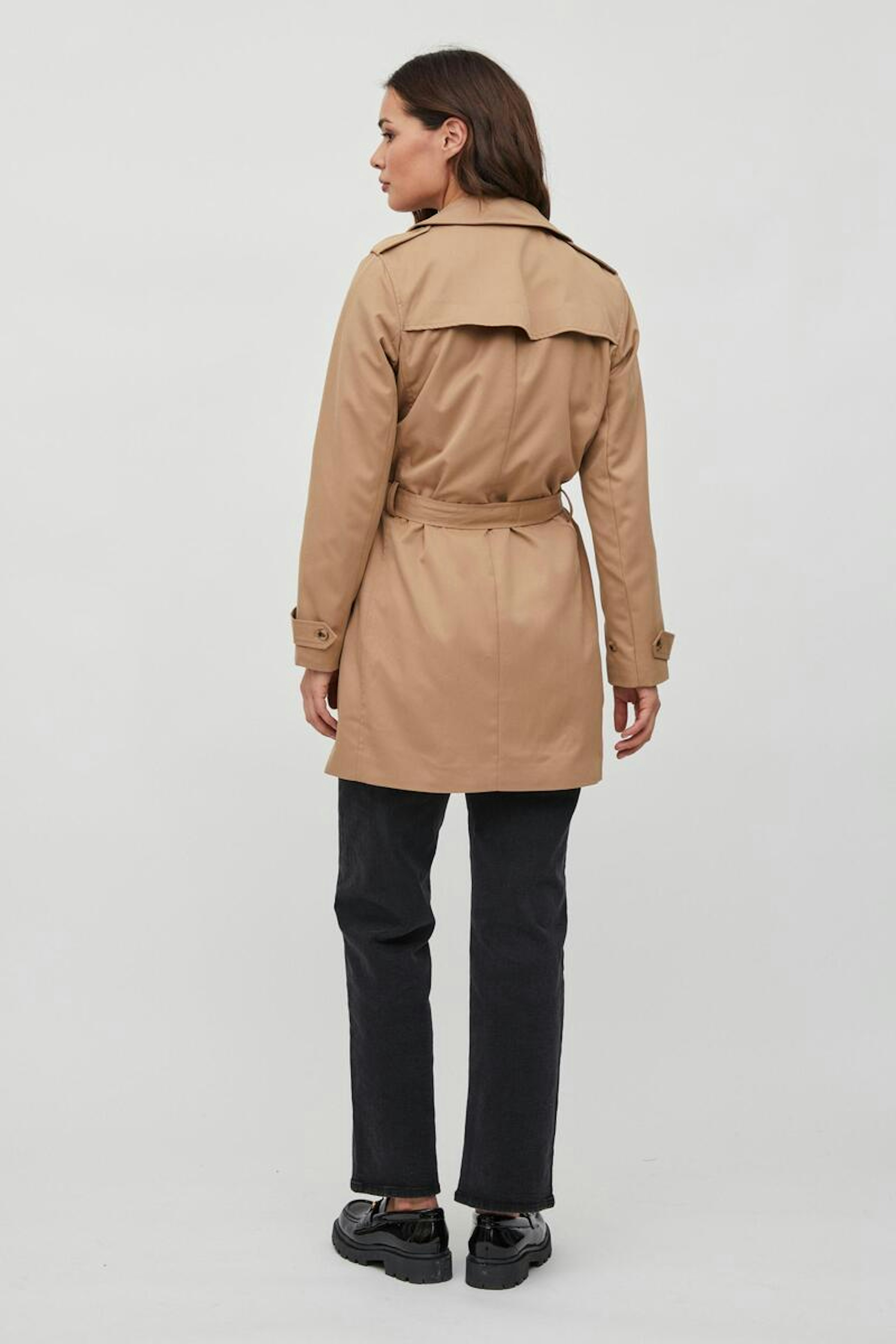 โข Trench-coat avec ceinture โข Double boutonnage โข Tissu lรฉger โข Deux poches โข Une poche intรฉrieure