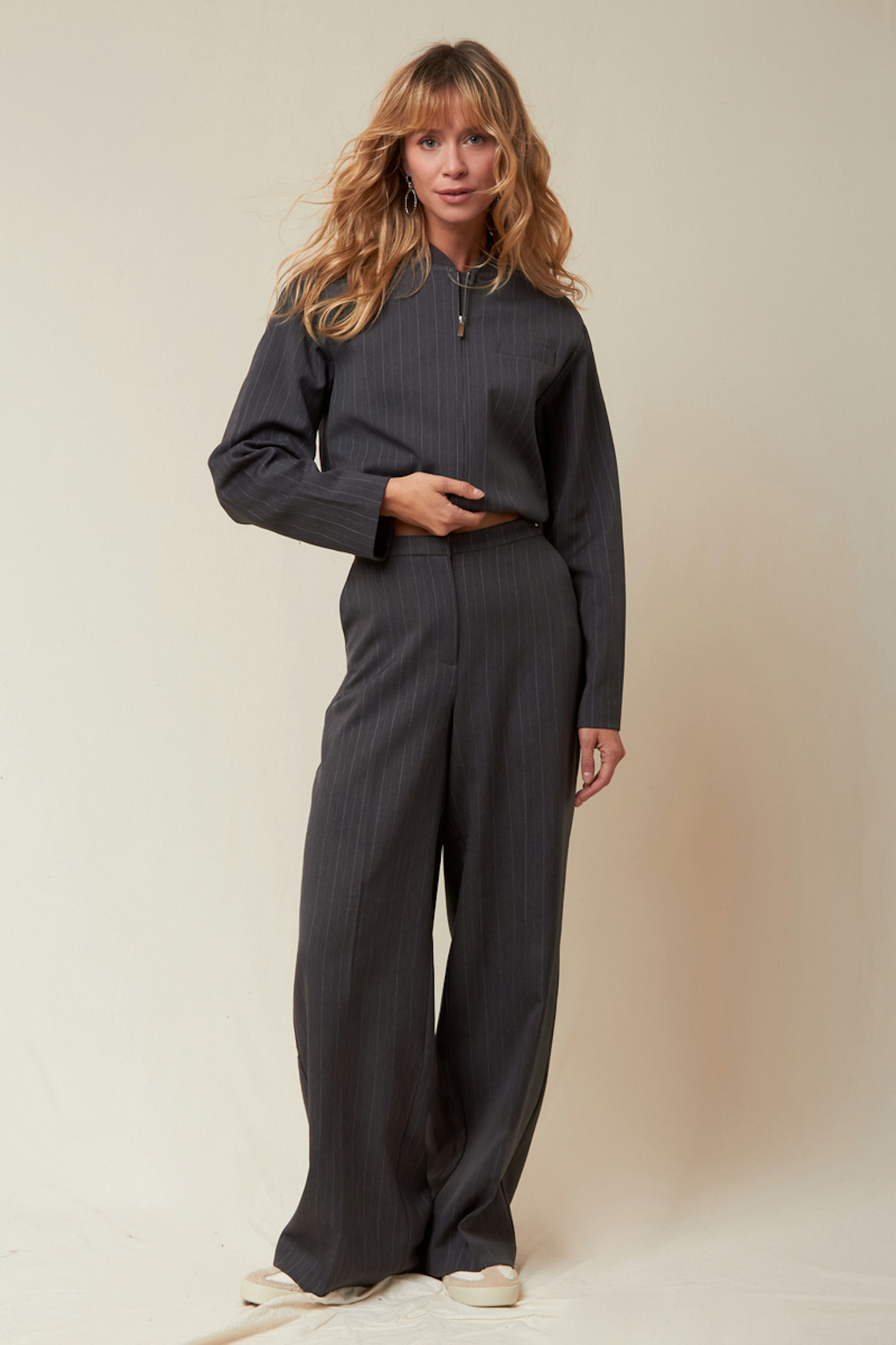 Optez pour un style chic en associant cette veste avec un pantalon ajusté et des bottines. Parfait pour un look raffiné en toutes saisons. • Veste en tissu texturé • Fermeture éclair avant élégante • Manches longues amples • Coupe décontractée • Motif à fines rayures