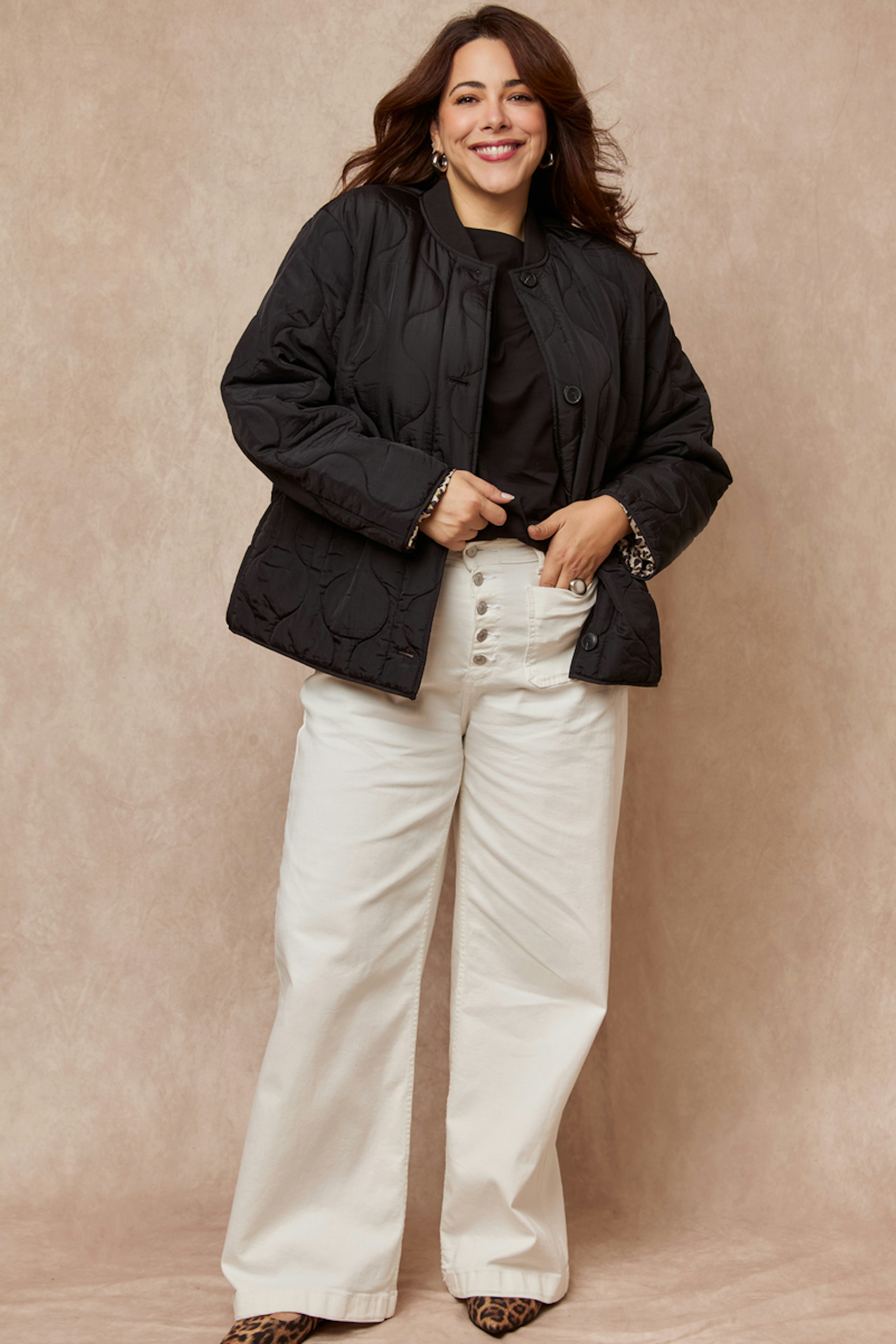 Cette veste noire, parfaite en toute saison, se marie idéalement avec un jean brut et des bottines pour une allure chic et décontractée. Ajoutez un foulard coloré pour une touche de pep. • Veste matelassée • Coupe droite • Col rond • Manches longues • Doublure motif léopard