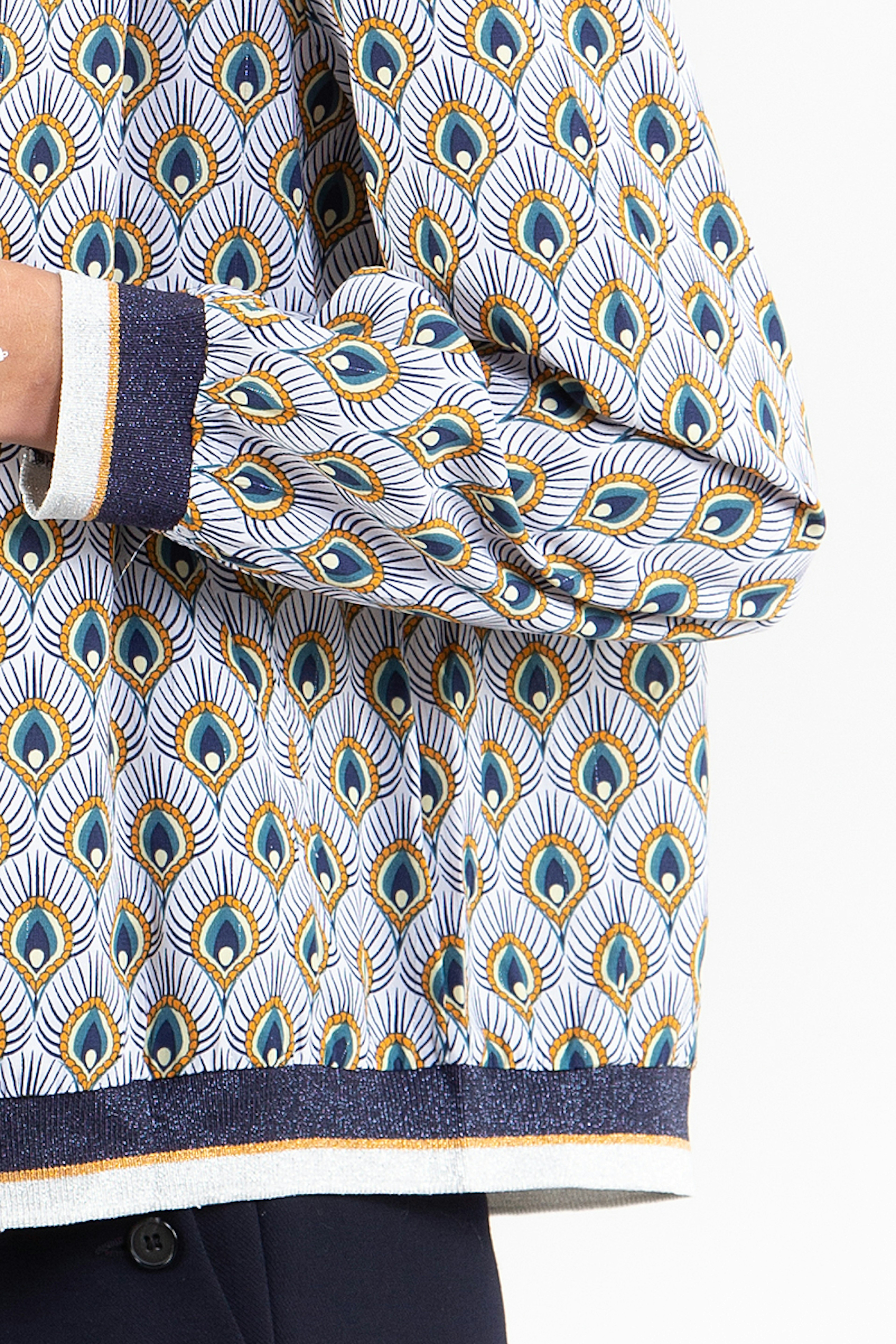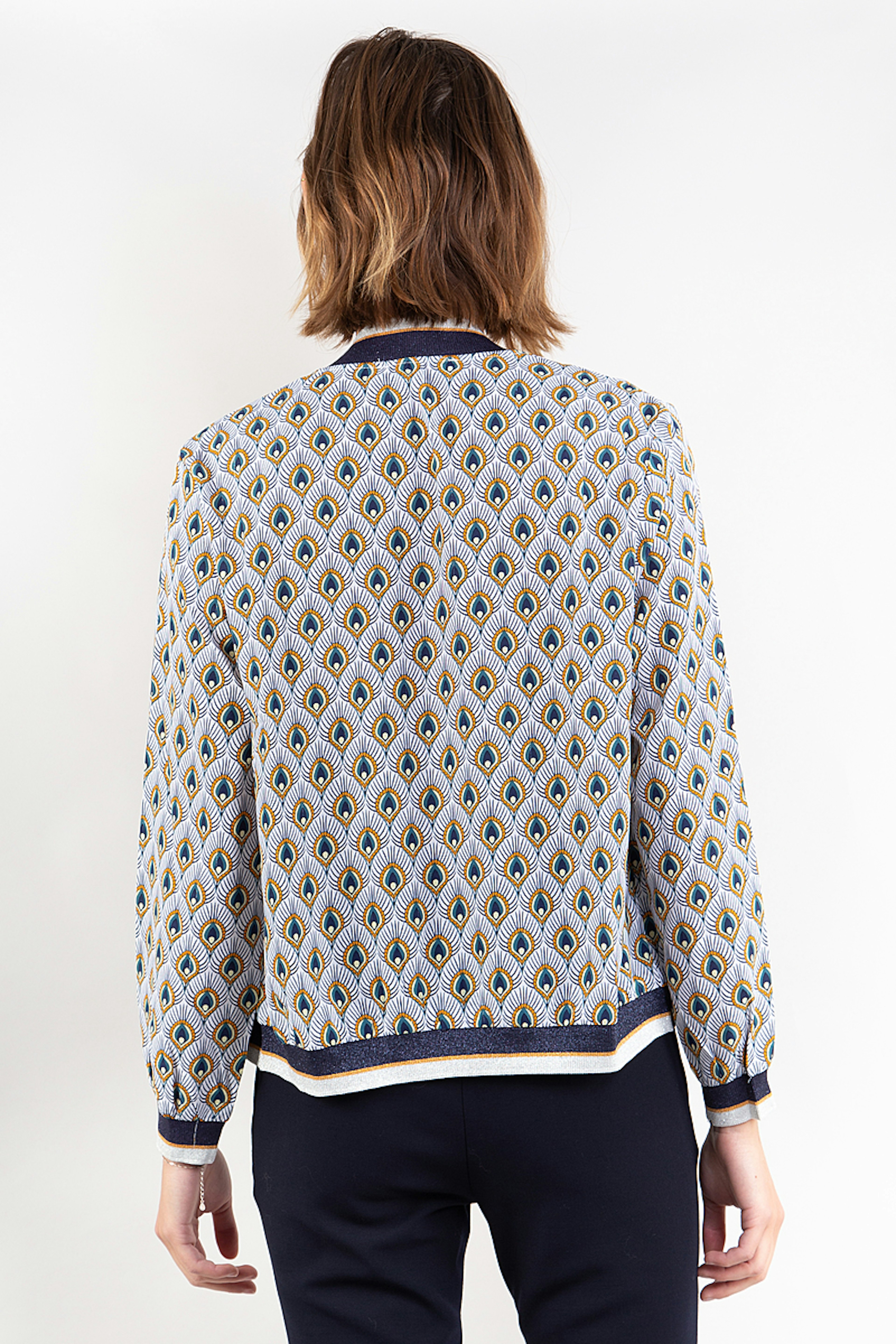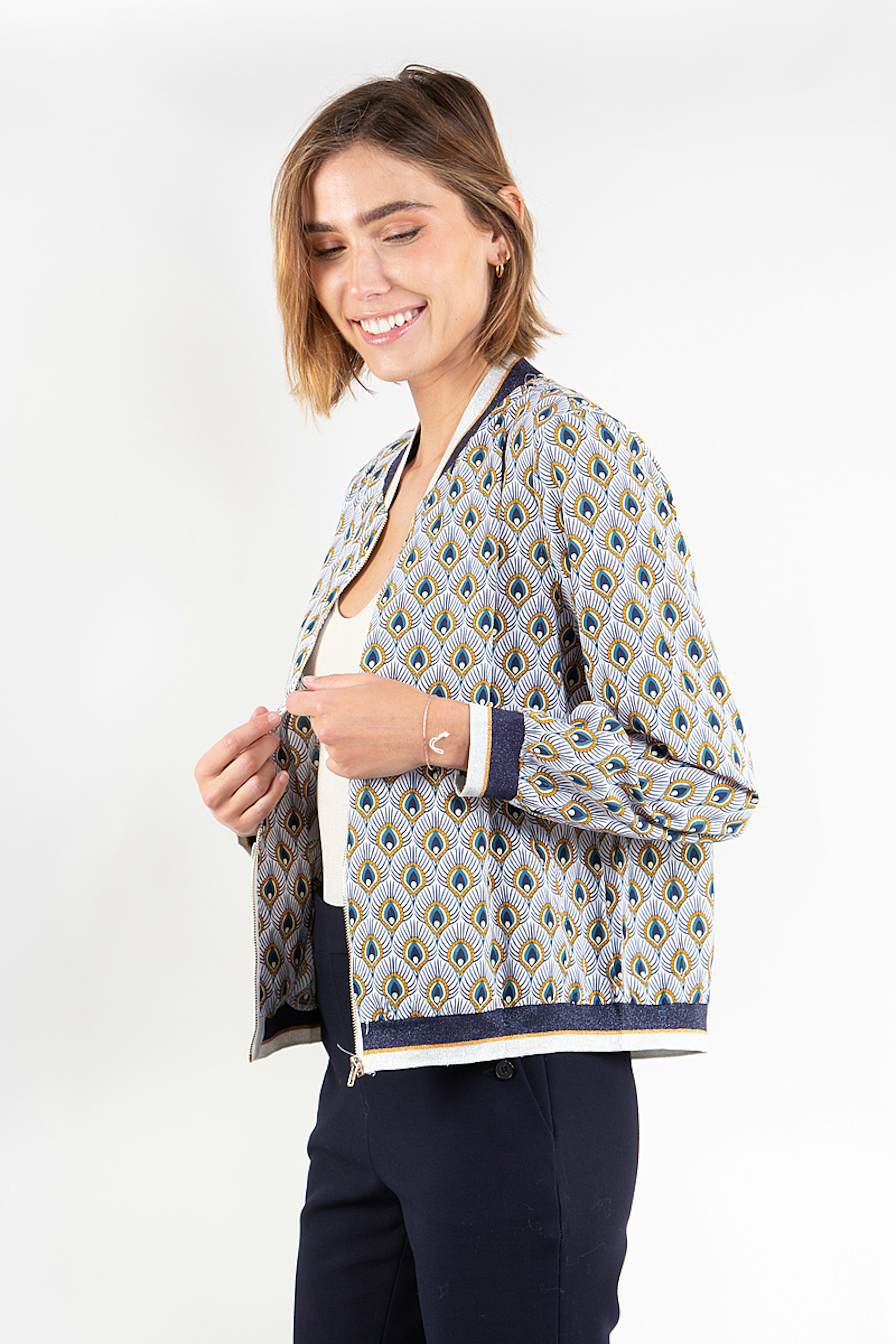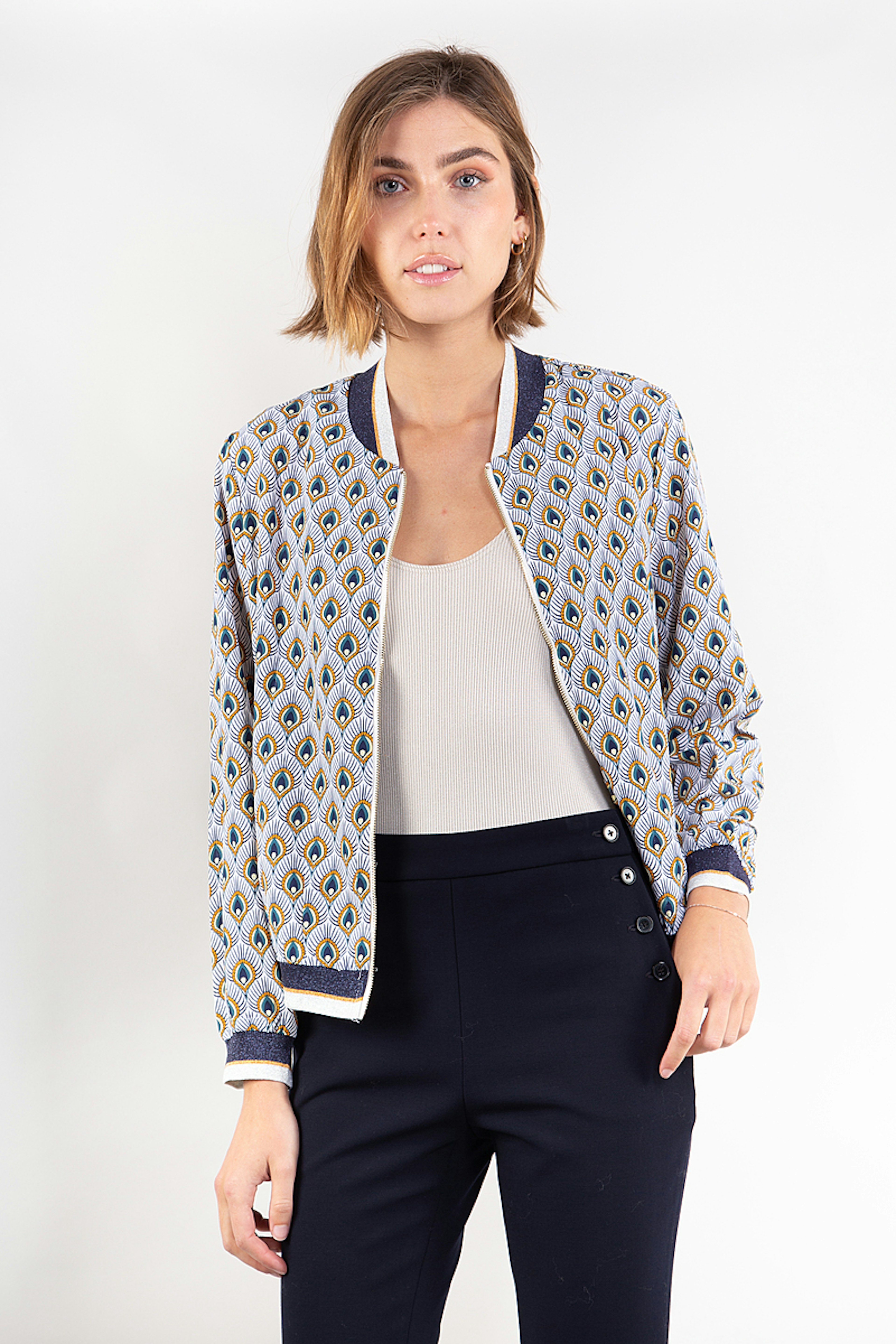 โข Bomber imprimรฉ psychรฉdรฉlique blanc et bleu โข Bord cรดte sur les manches et le bas de la veste โข Doublure viscose โข Ouverture par un zip