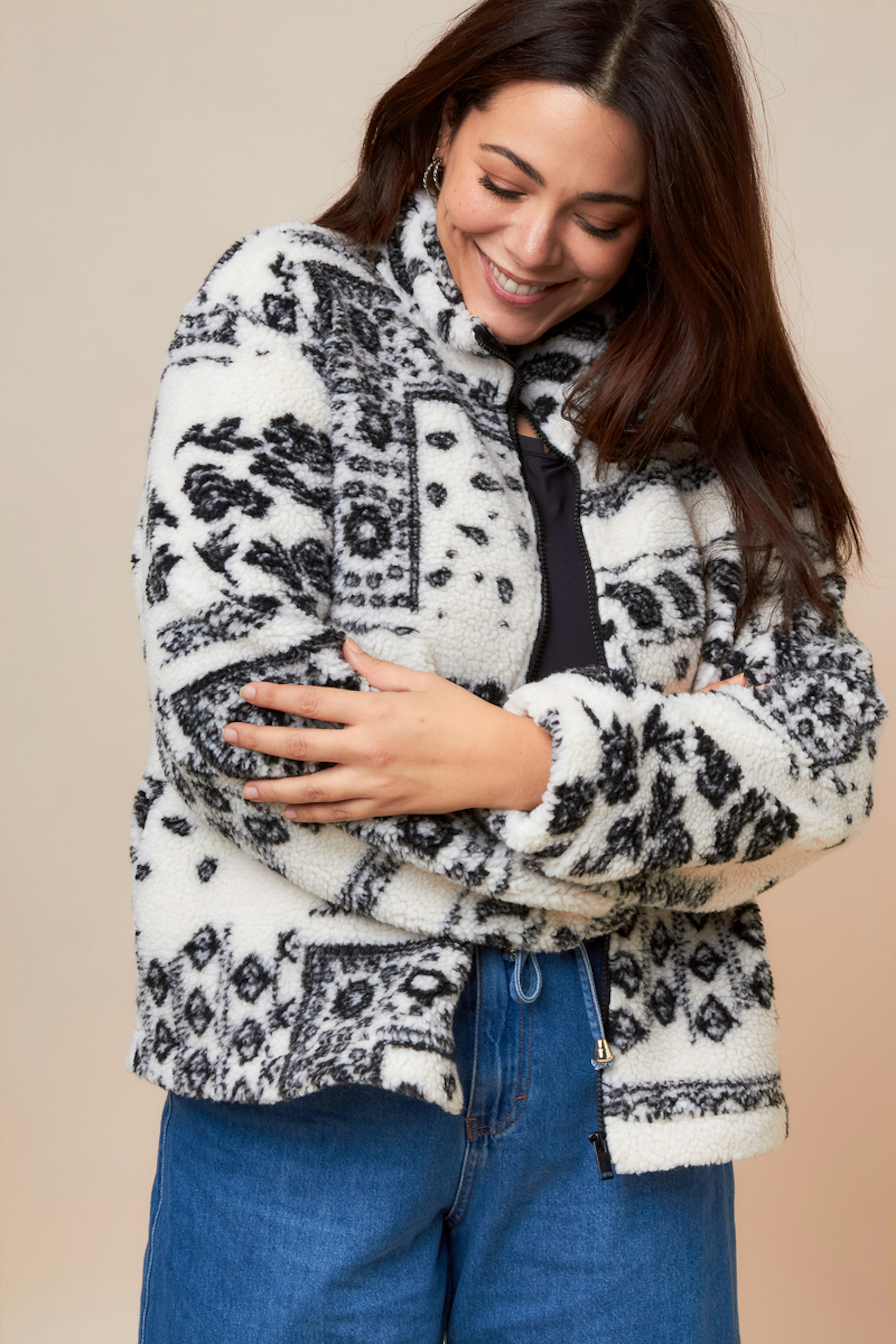 Avec son imprimé audacieux, cette veste sera superbe avec un jean skinny noir et des bottines. Idéale pour l'hiver, elle ajoute de la texture à votre look quotidien. • Veste en polyester • Coupe ample • Manches longues élastiquées • Fermeture éclair • Imprimé graphique