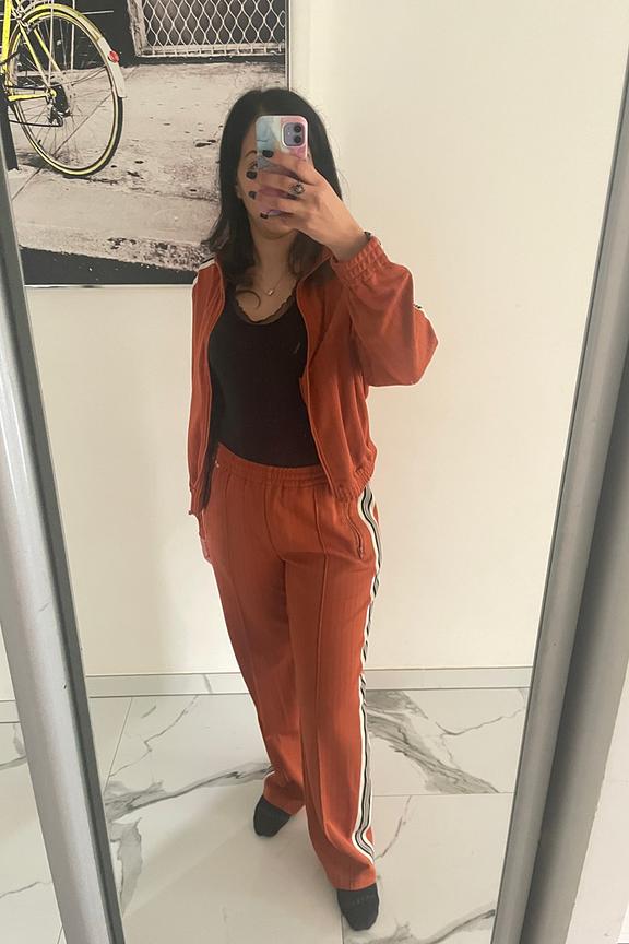 Adoptez un look décontracté chic en associant cette veste avec un jean brut et des baskets blanches. Parfait en toute saison ! • Veste orange • Coupe tempérée • Manches longues • Fermeture éclair • Détail rayures sur manches