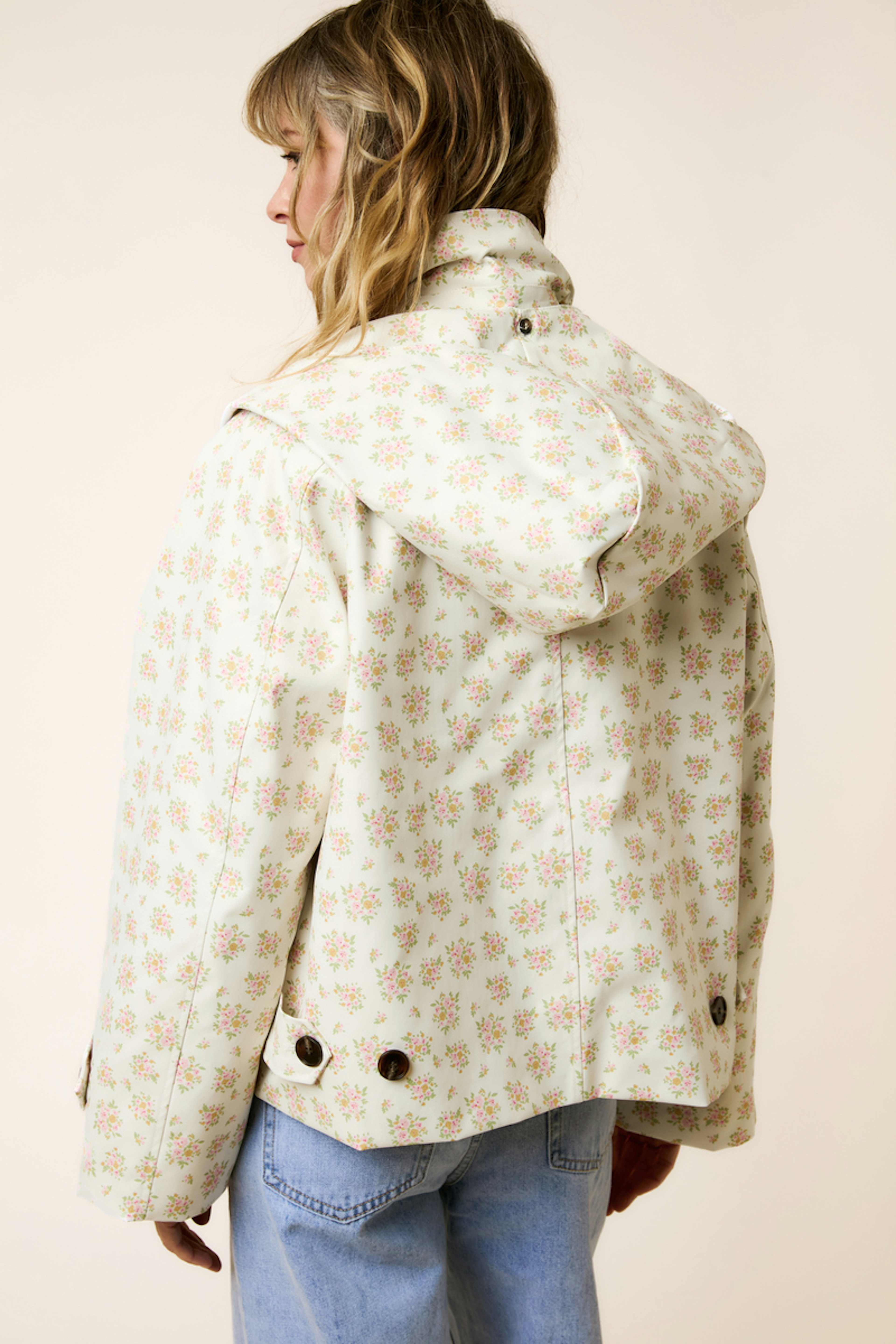 Portée avec un jean taille haute et des bottines, cette veste imprimée est idéale pour les soirées fraîches d'été. • Veste imprimée • Manches longues • Capuche amovible • Fermeture à boutons • Motif fleuri