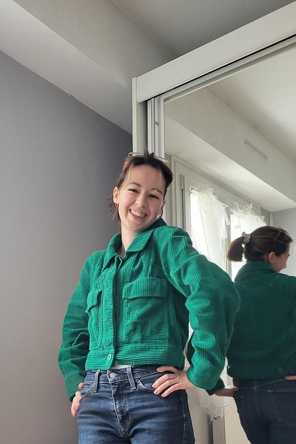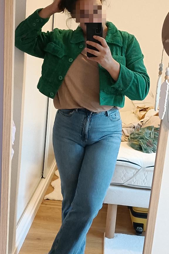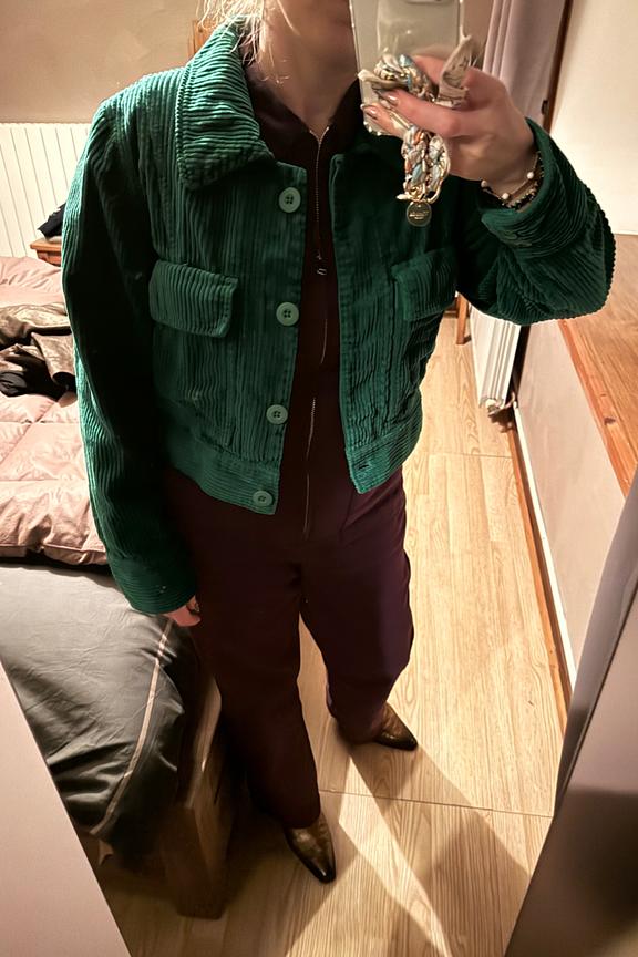 โข Veste courte manches longues โข Velours cรดtelรฉ vert empire โข 2 poches โข Boutonniรจre โข Hauteur de buste : 51 cm โข Longueur de manches : 62 cm