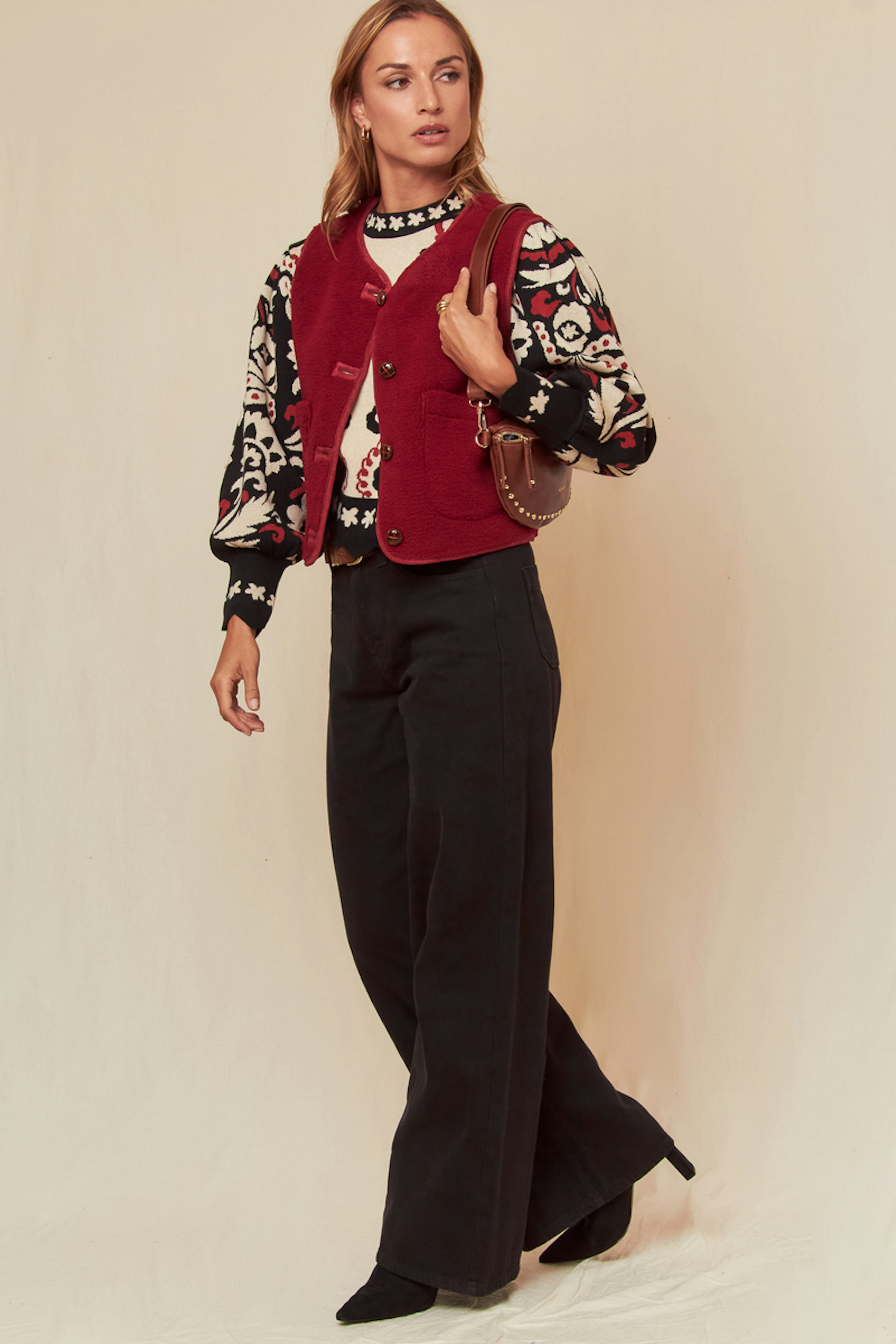 Ajoutez une note d'originalité à votre tenue avec un pantalon noir ajusté et des bottines. Cette veste est votre alliée idéale pour un hiver cosy. • Veste à manches longues • Coupe droite structurée • Fermeture à boutons décoratifs • Deux poches avant pratiques • Motif floral contrastant
