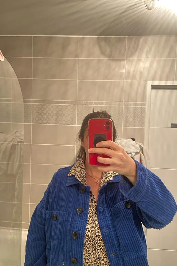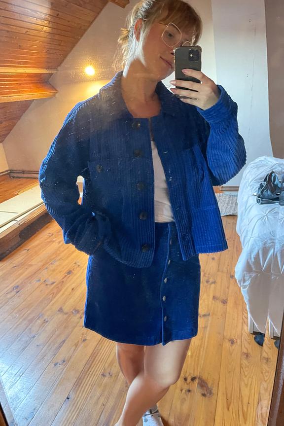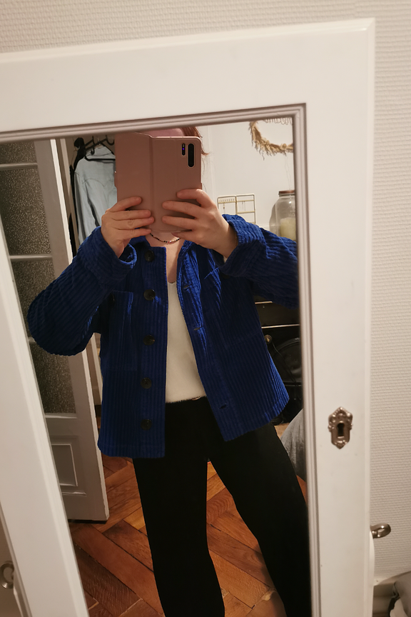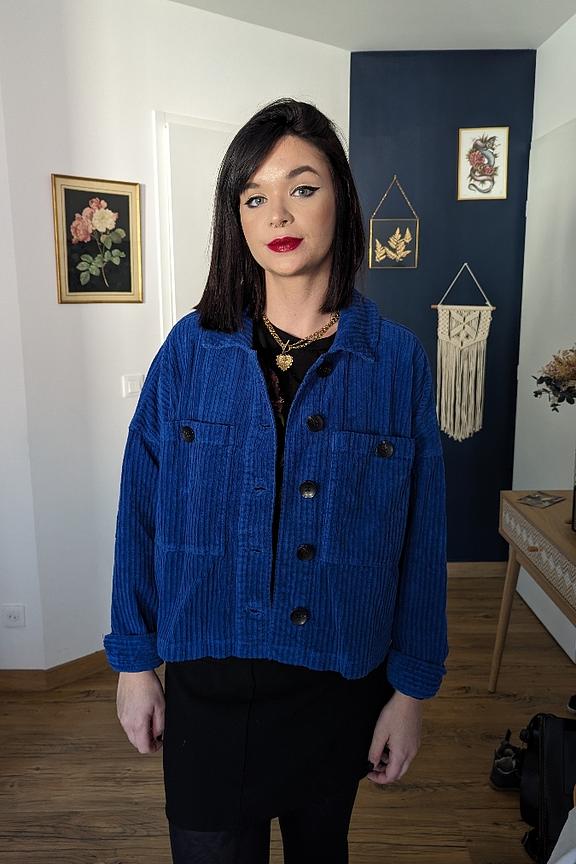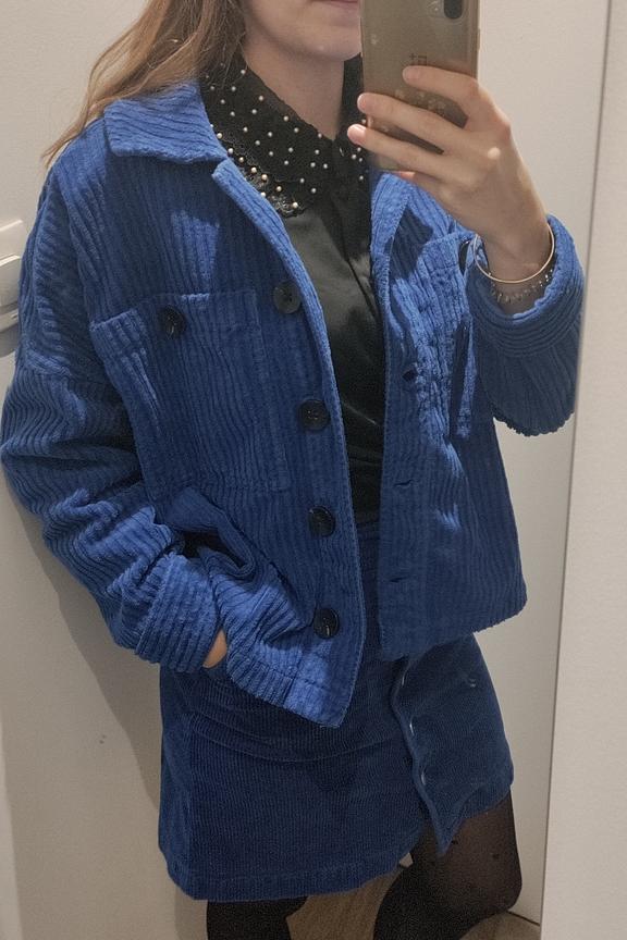 โ€ข Veste en velours bleue manches longues โ€ข 2 poches plaquรฉes boutonnรฉes sur le devant โ€ข Col chemise โ€ข Fermeture boutonnรฉe sur le devant โ€ข Boutonniรจre noires โ€ข Hauteur de buste : 51 cm โ€ข Longueur de manches : 62 cm