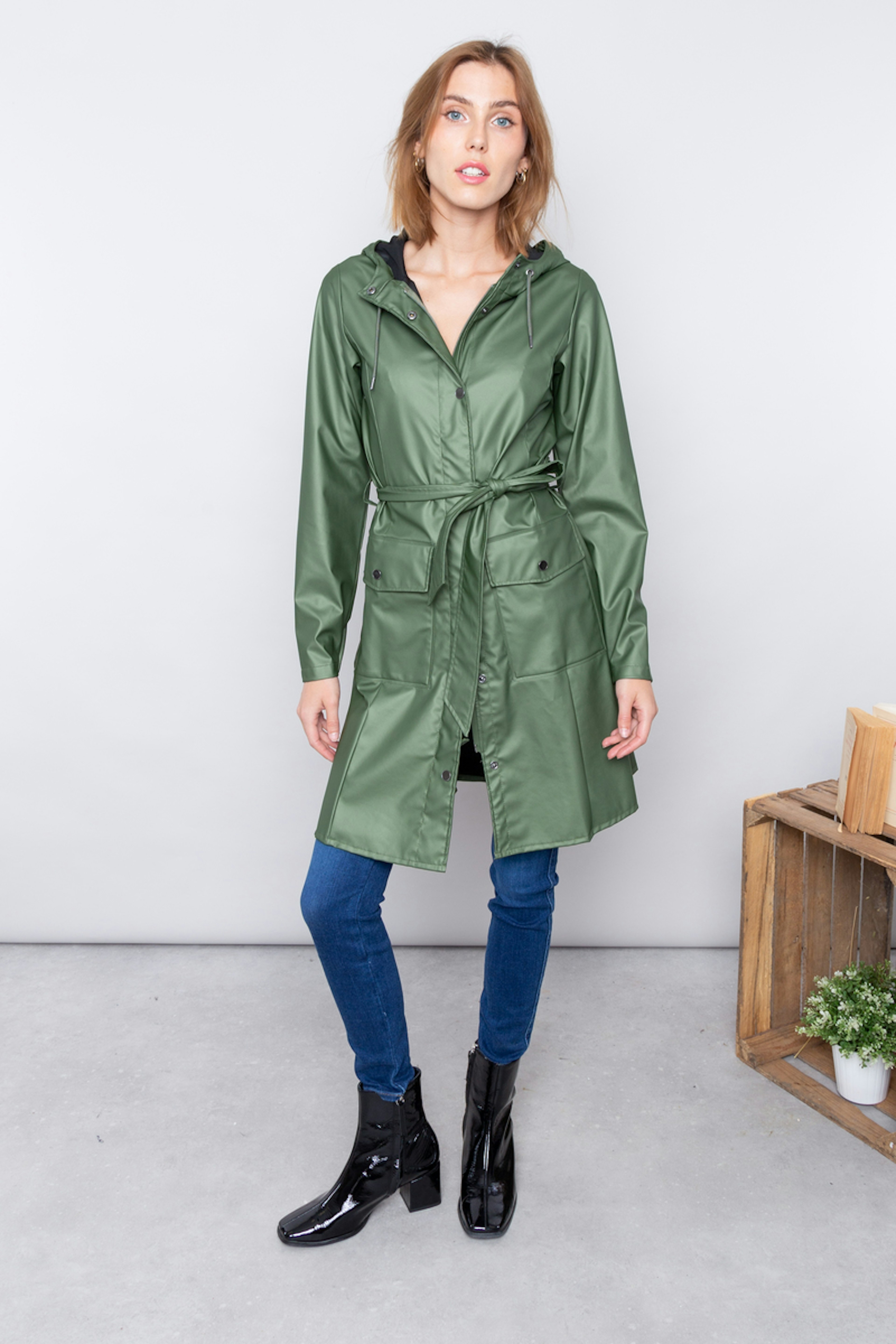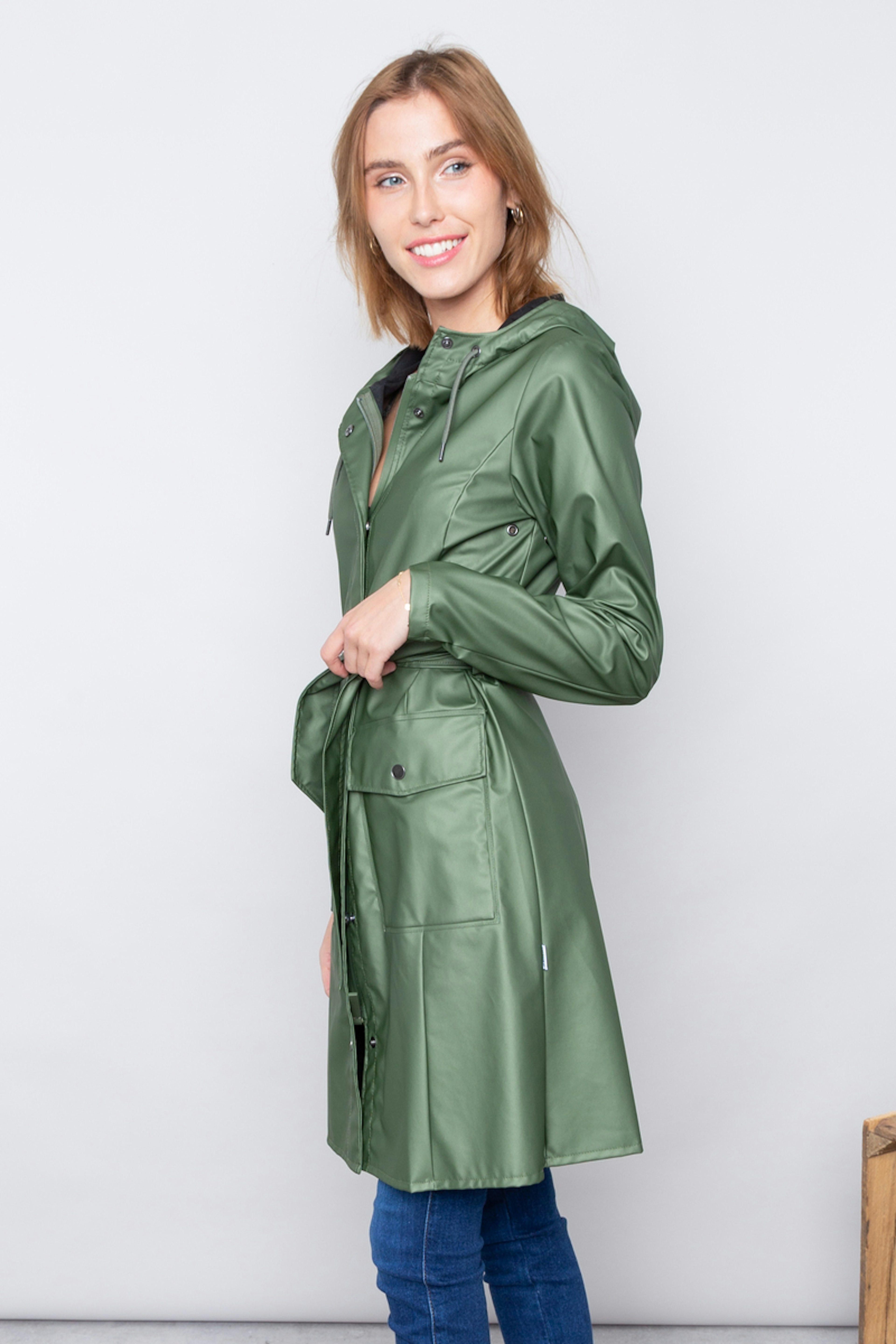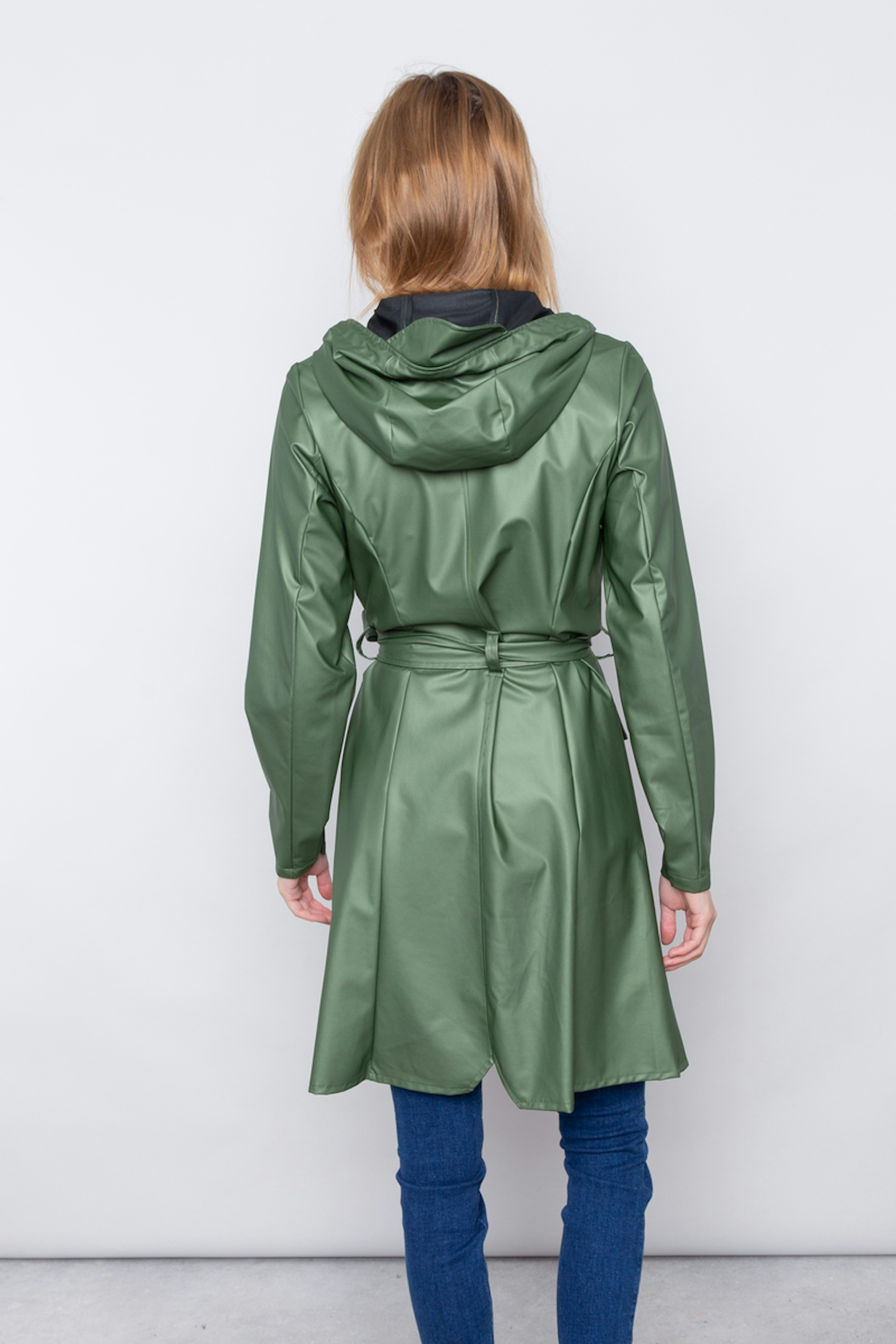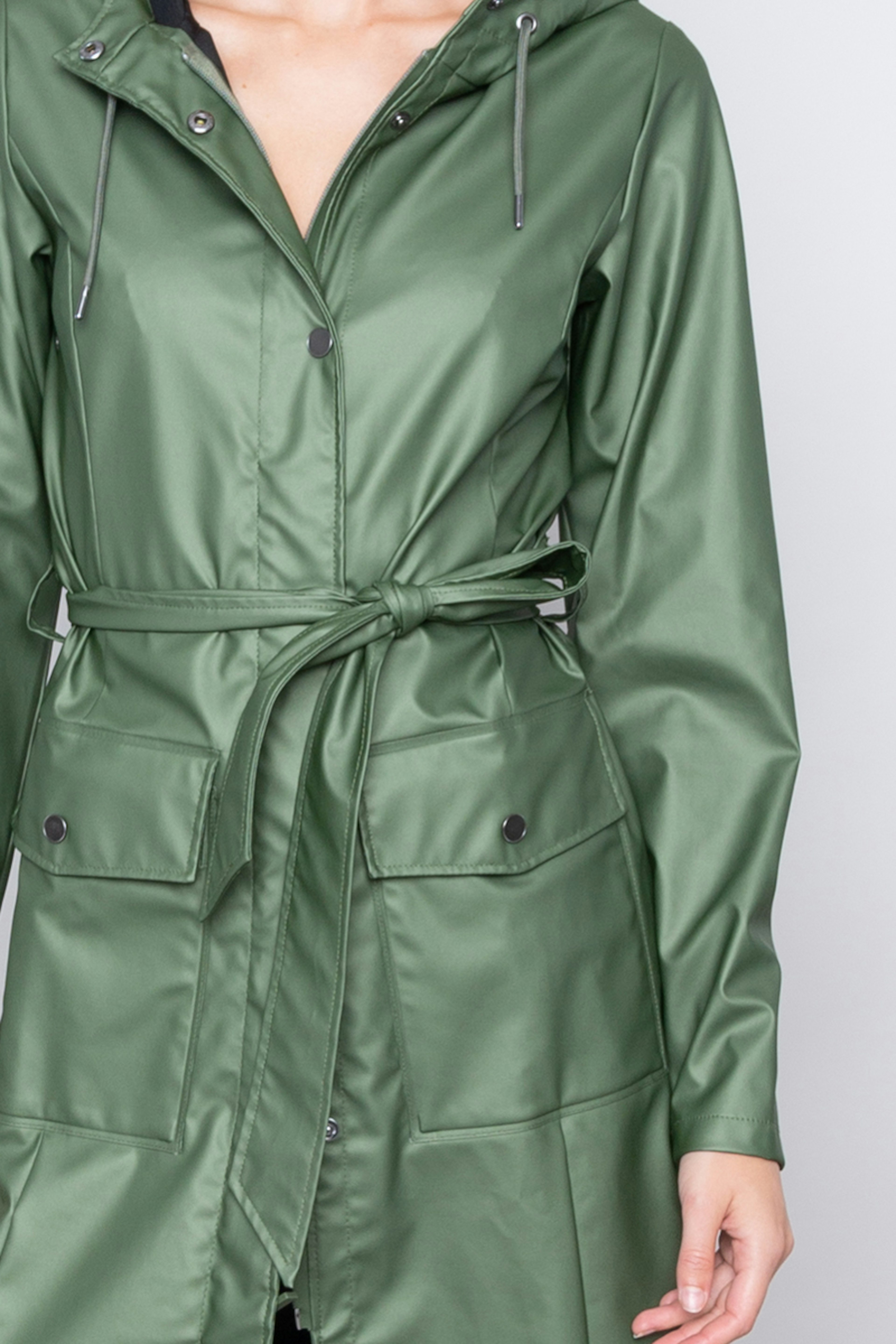 La Curve Jacket est une interprรฉtation du trench-coat fรฉminin de Rains. โข Veste impermรฉable verte โข Coupe trapรจze โข Ceinture โข Capuche avec cordon de serrage et casquette ร visiรจre โข Fermeture รฉclair avec patte de boutons-pression โข Poignets rรฉglables โข Deux poches plaquรฉes โข Tissu impermรฉable dans le PU emblรฉmatique de Rains