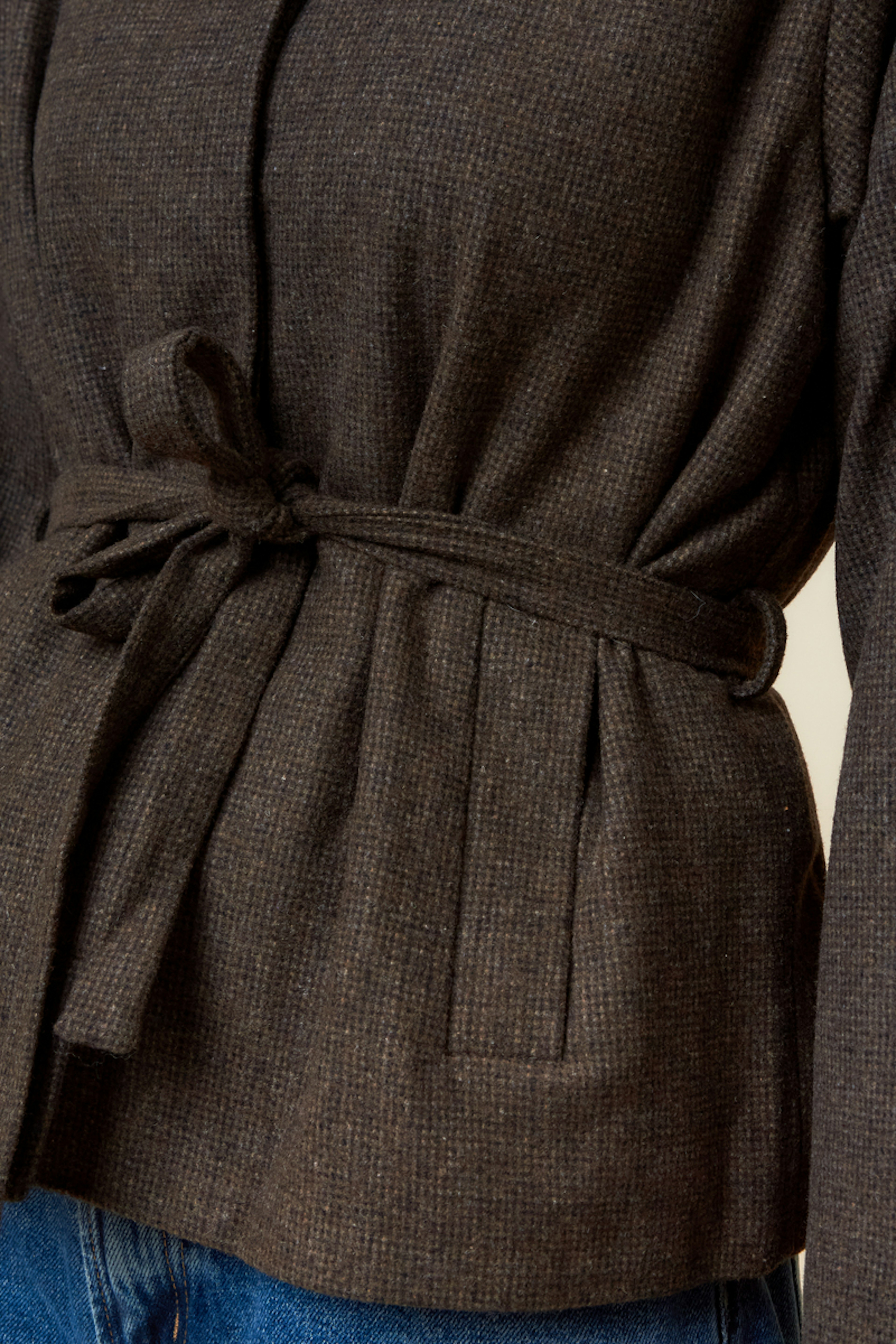 Associez cette veste à un jean taille haute et des bottines pour un look moderne et chic cet hiver. • Veste à manches longues • Coupe ample • Ceinture à nouer à la taille • Col rond • Tissu en laine mélangée