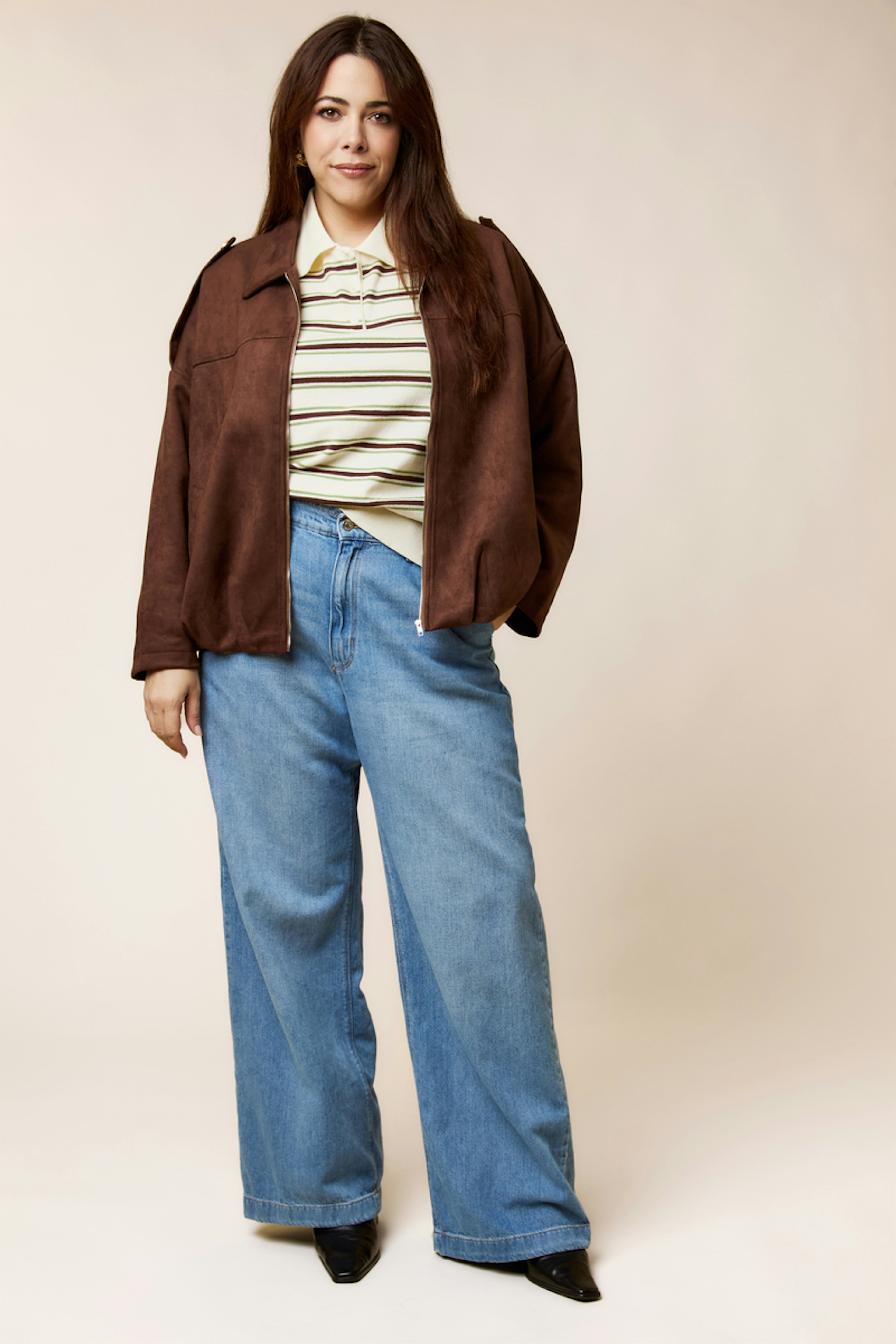 Portez cette veste marron avec un jean taille haute et des bottines pour un style casual-chic. Parfait pour l'hiver. โข Veste en polyester โข Coupe ample โข Col large โข Fermeture zippรฉe โข รpaules tombantes