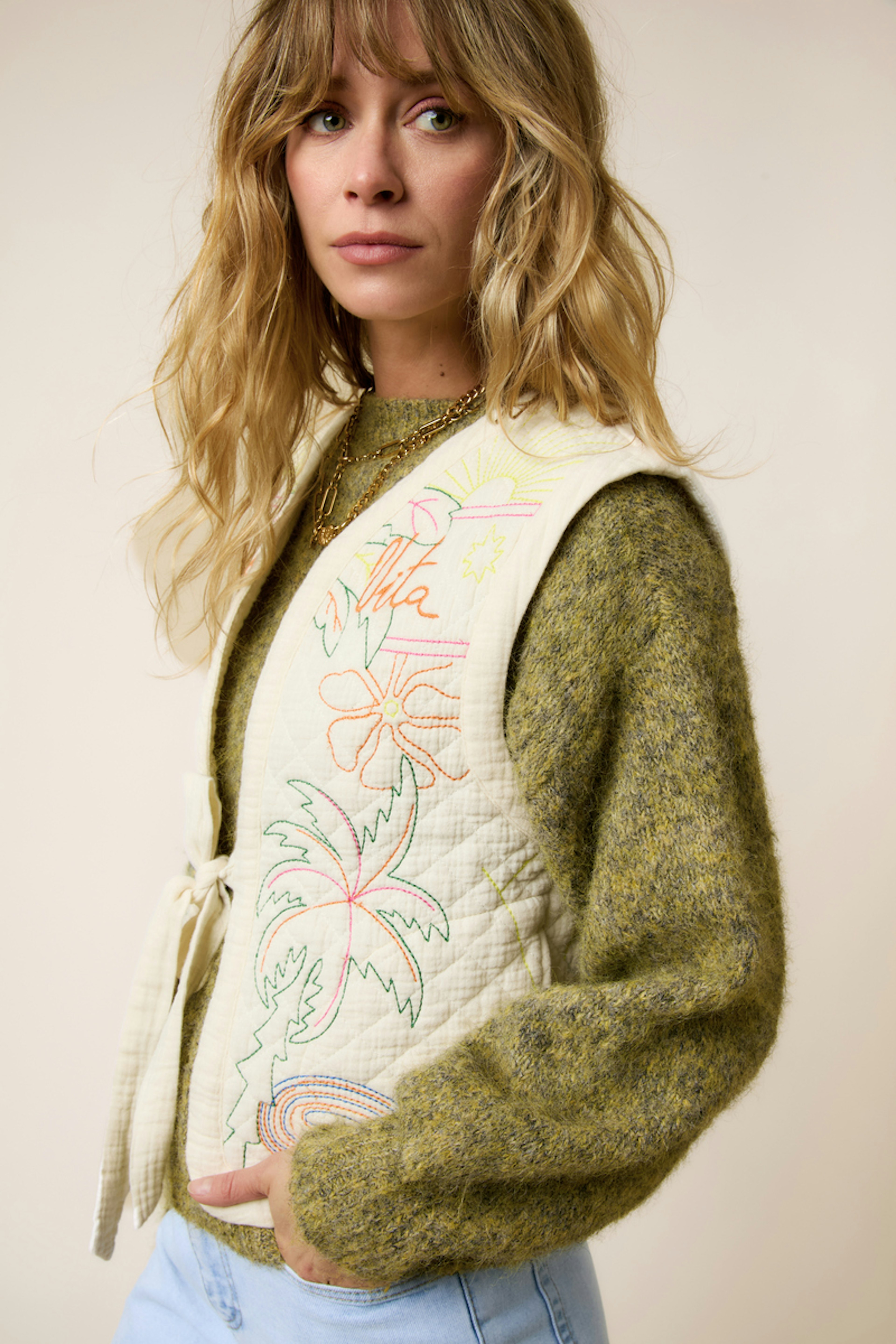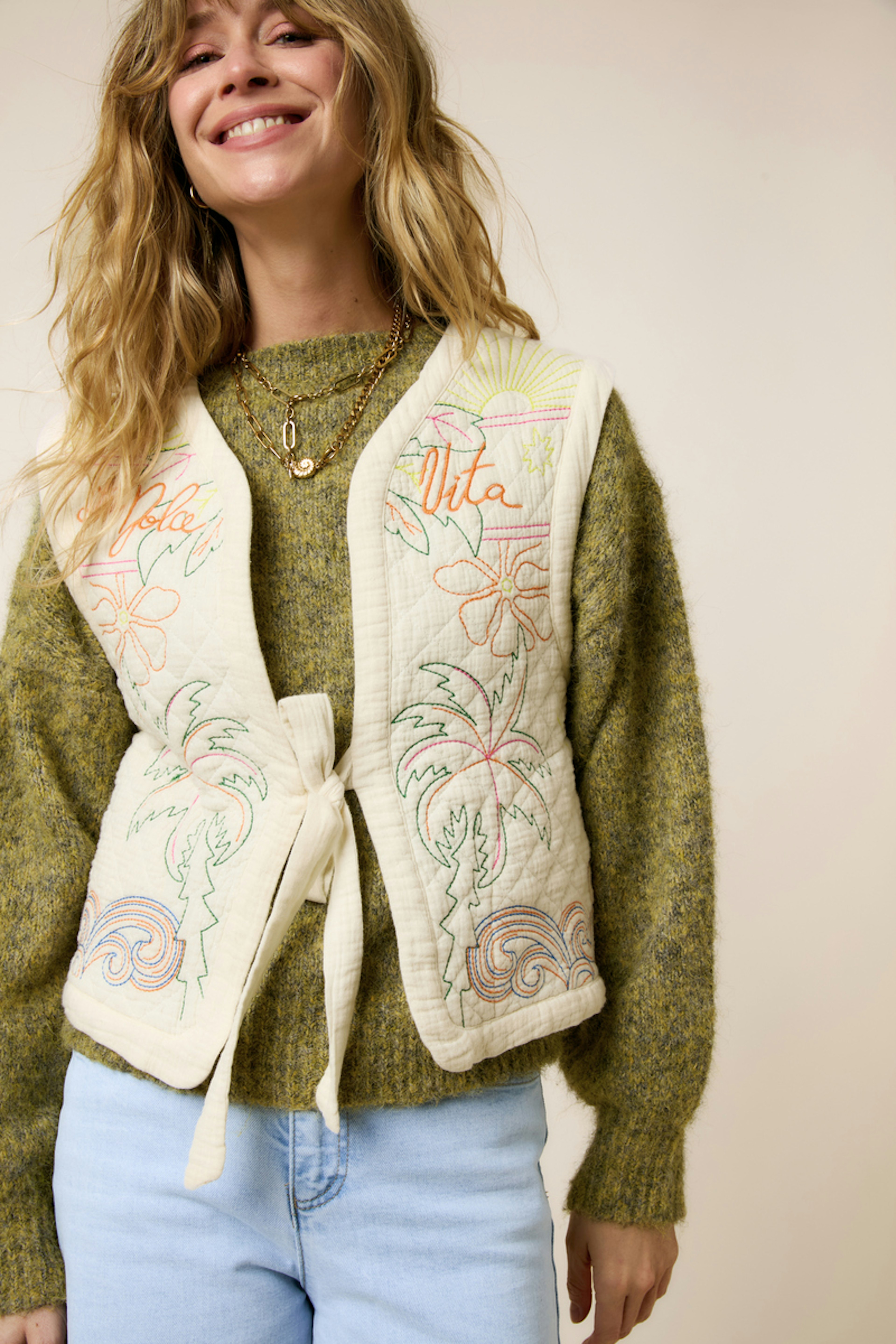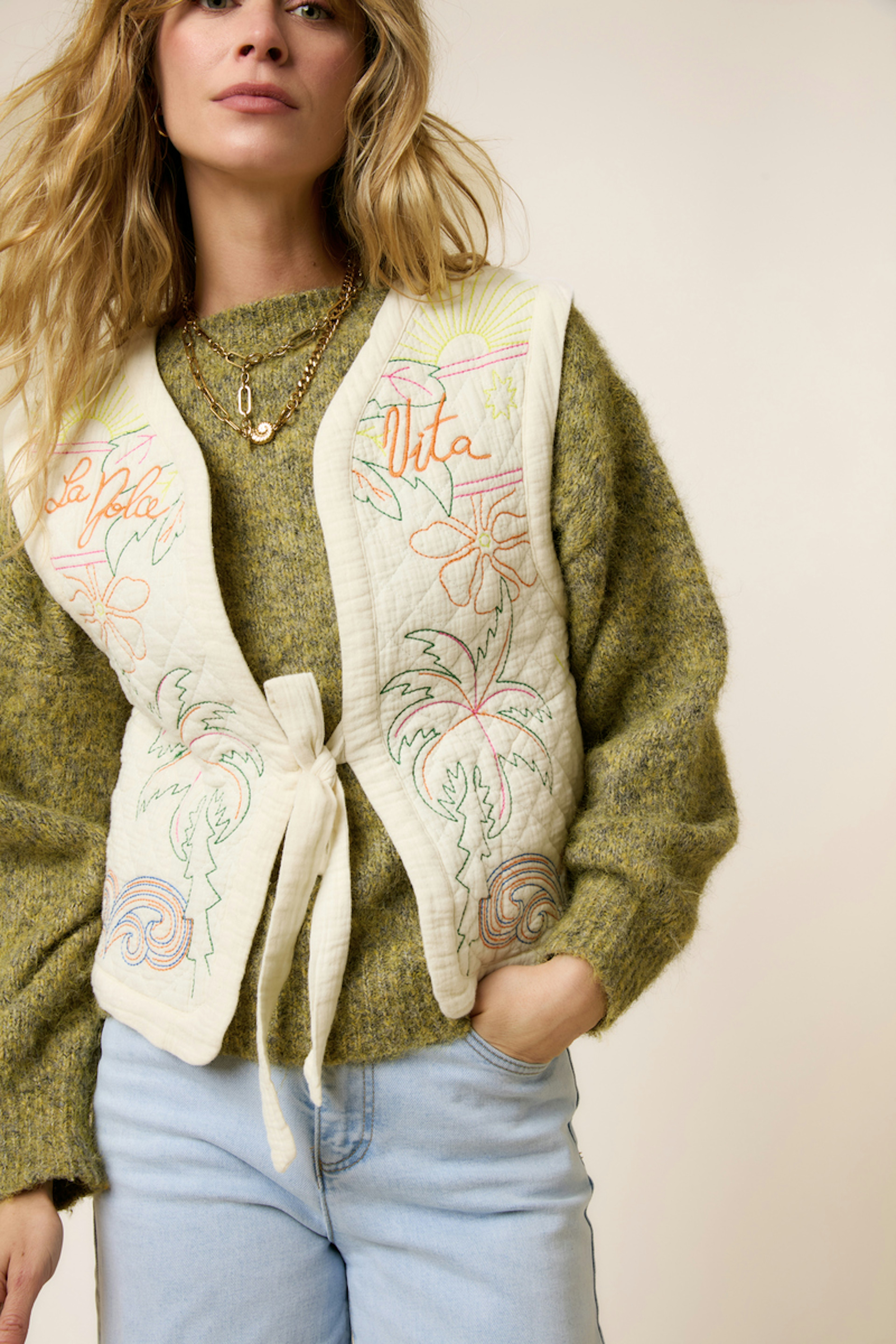 Combinez cette veste avec un jean léger et un débardeur pour une allure estivale décontractée. • Veste en coton • Coupe sans manches • Attaches élégantes à nouer • Broderie florale colorée • Style décontracté et poétique