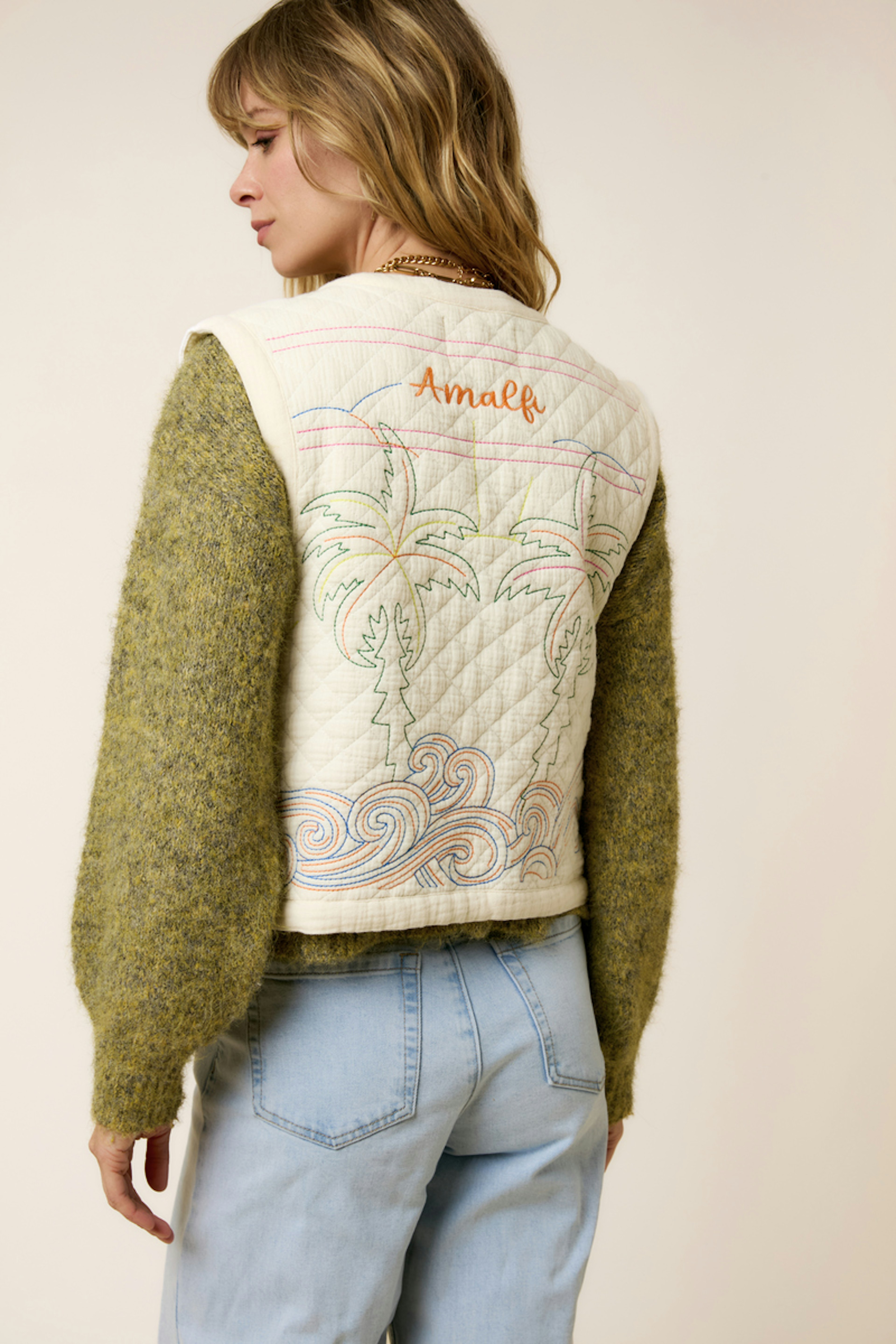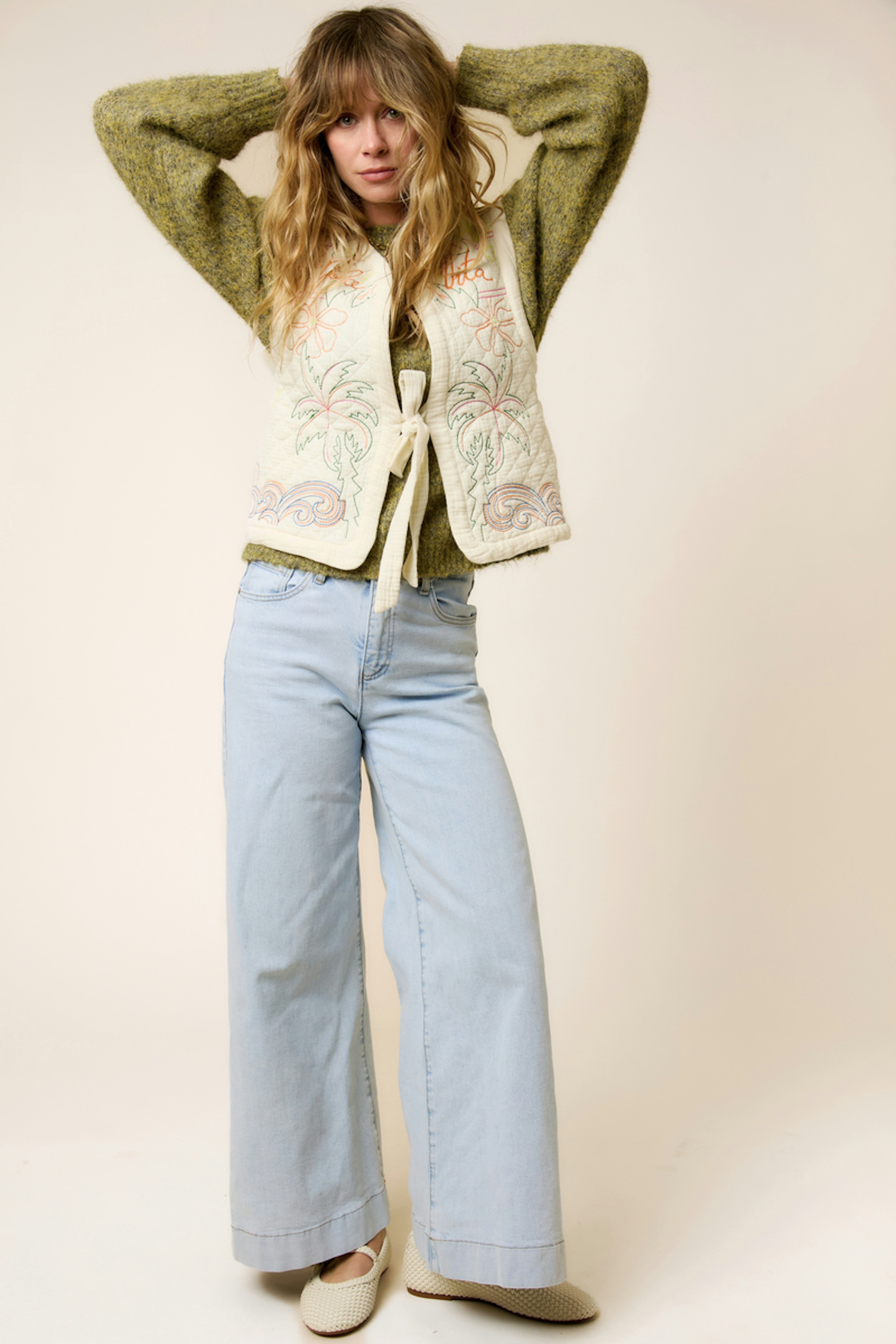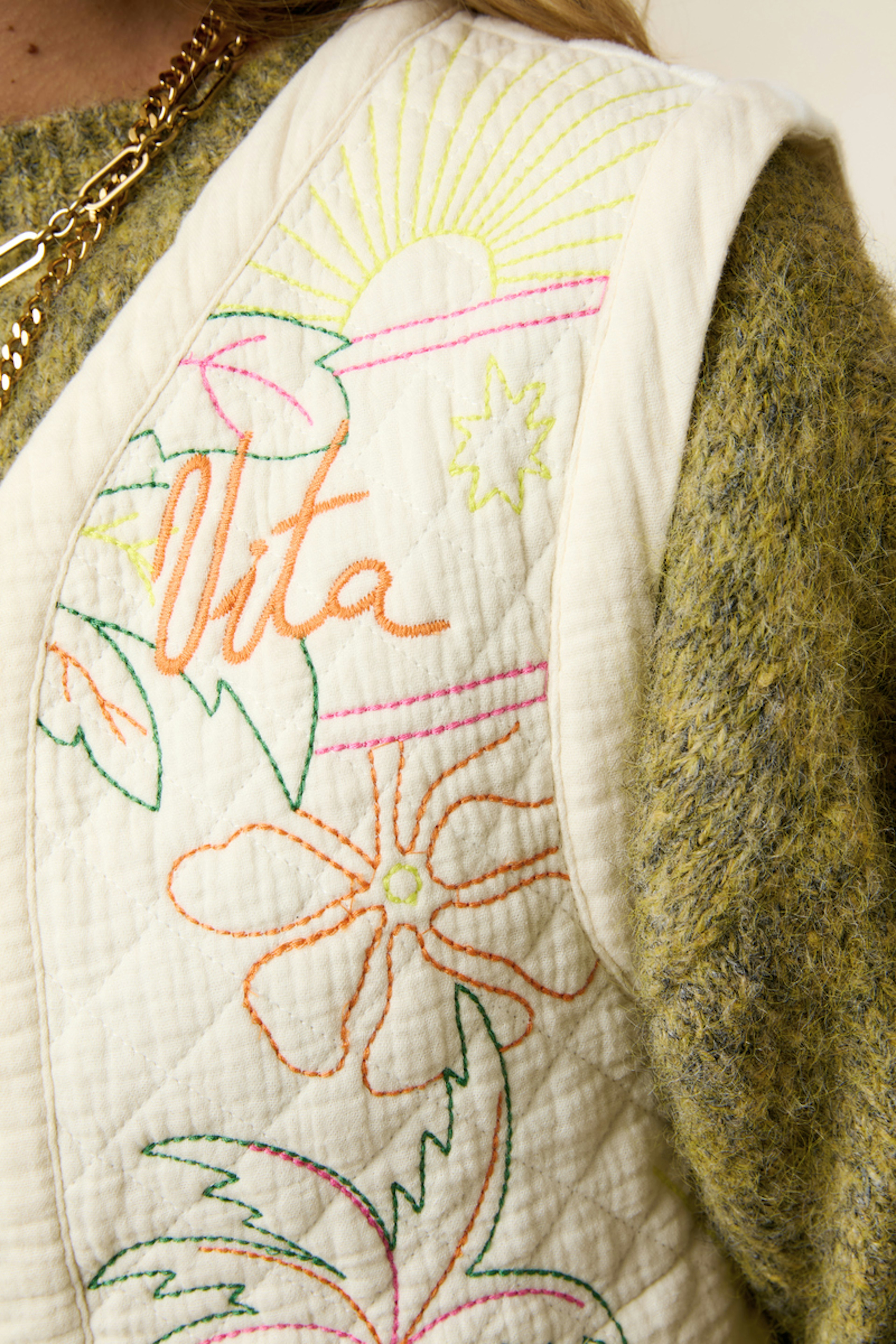 Combinez cette veste avec un jean léger et un débardeur pour une allure estivale décontractée. • Veste en coton • Coupe sans manches • Attaches élégantes à nouer • Broderie florale colorée • Style décontracté et poétique
