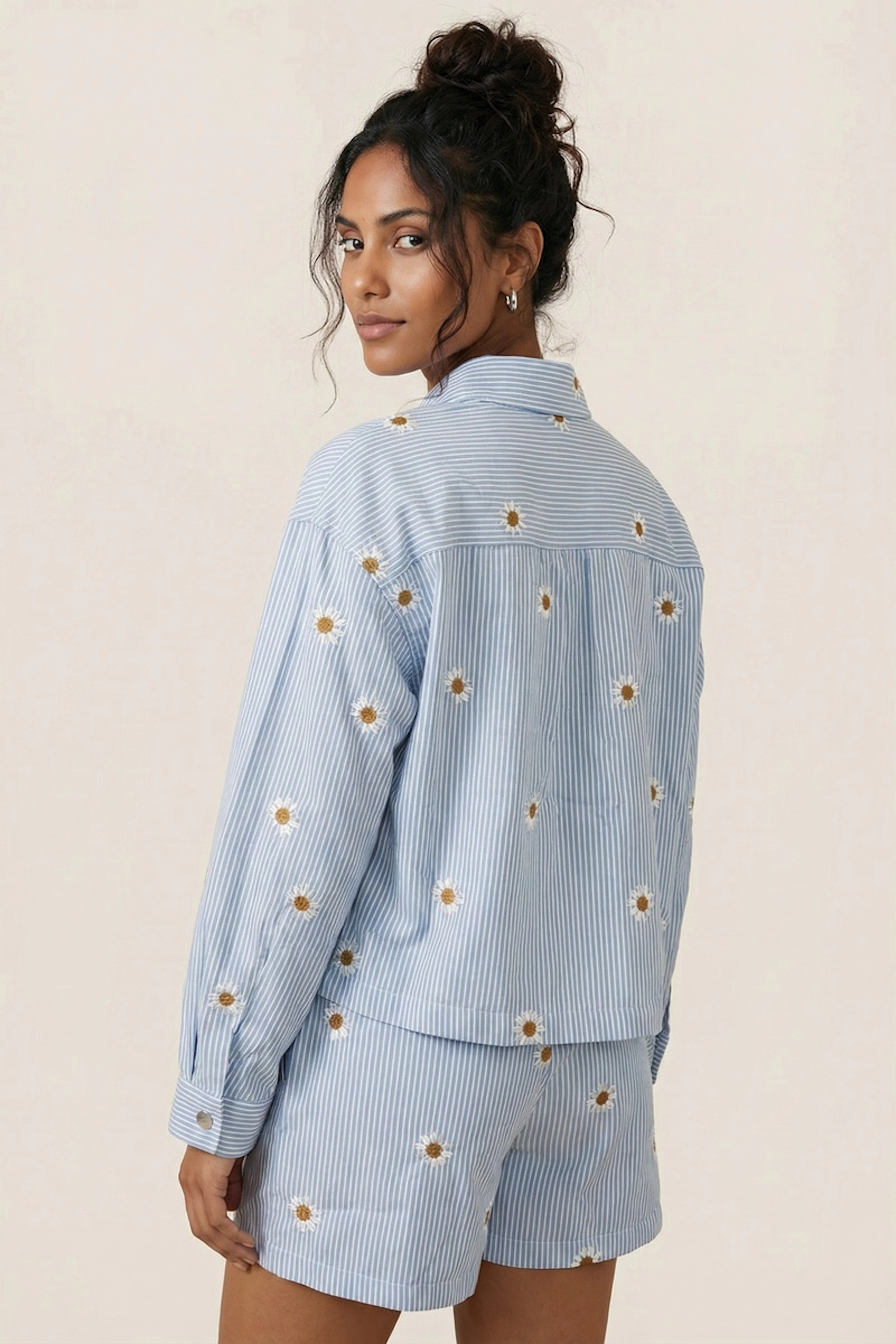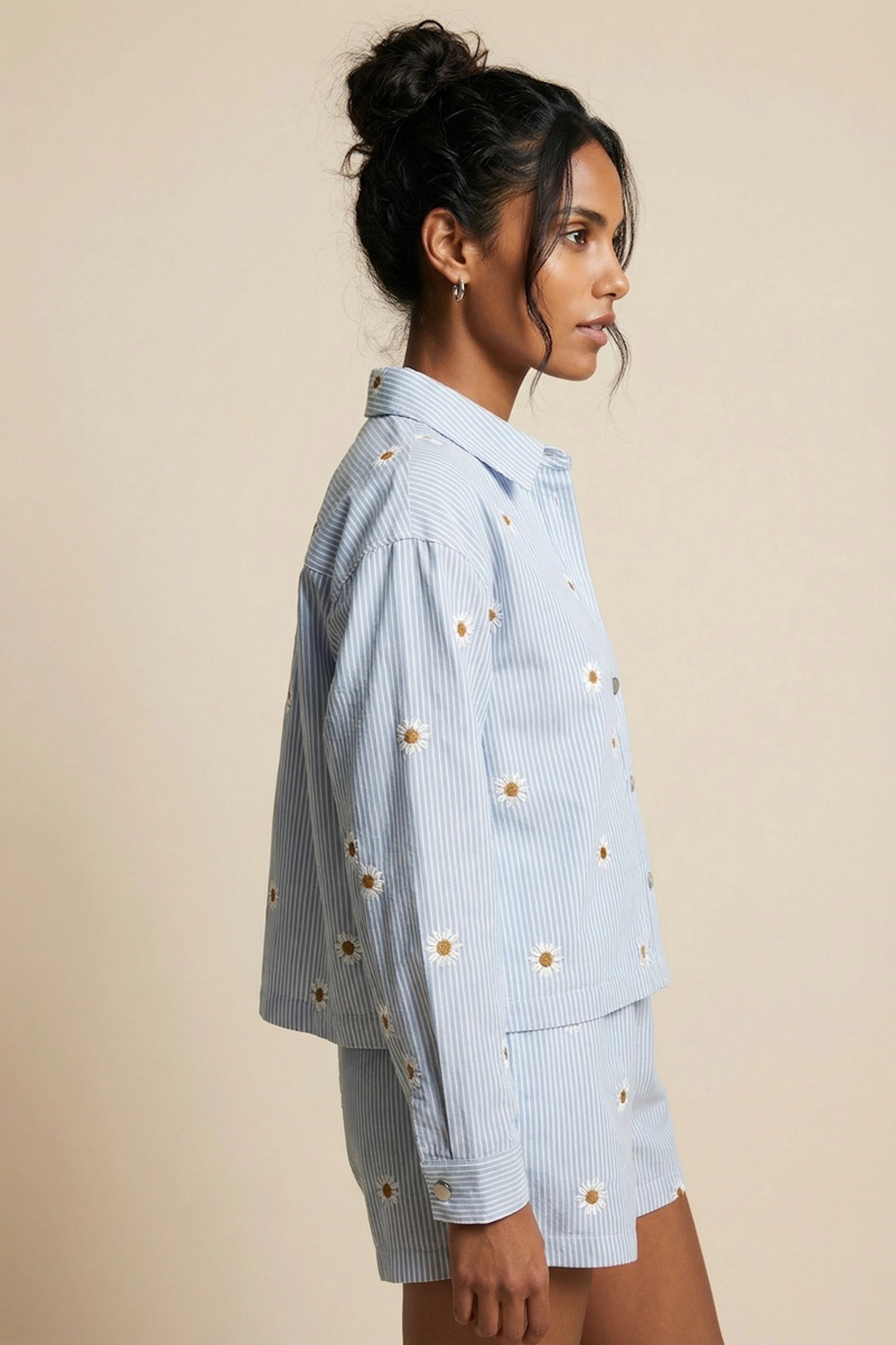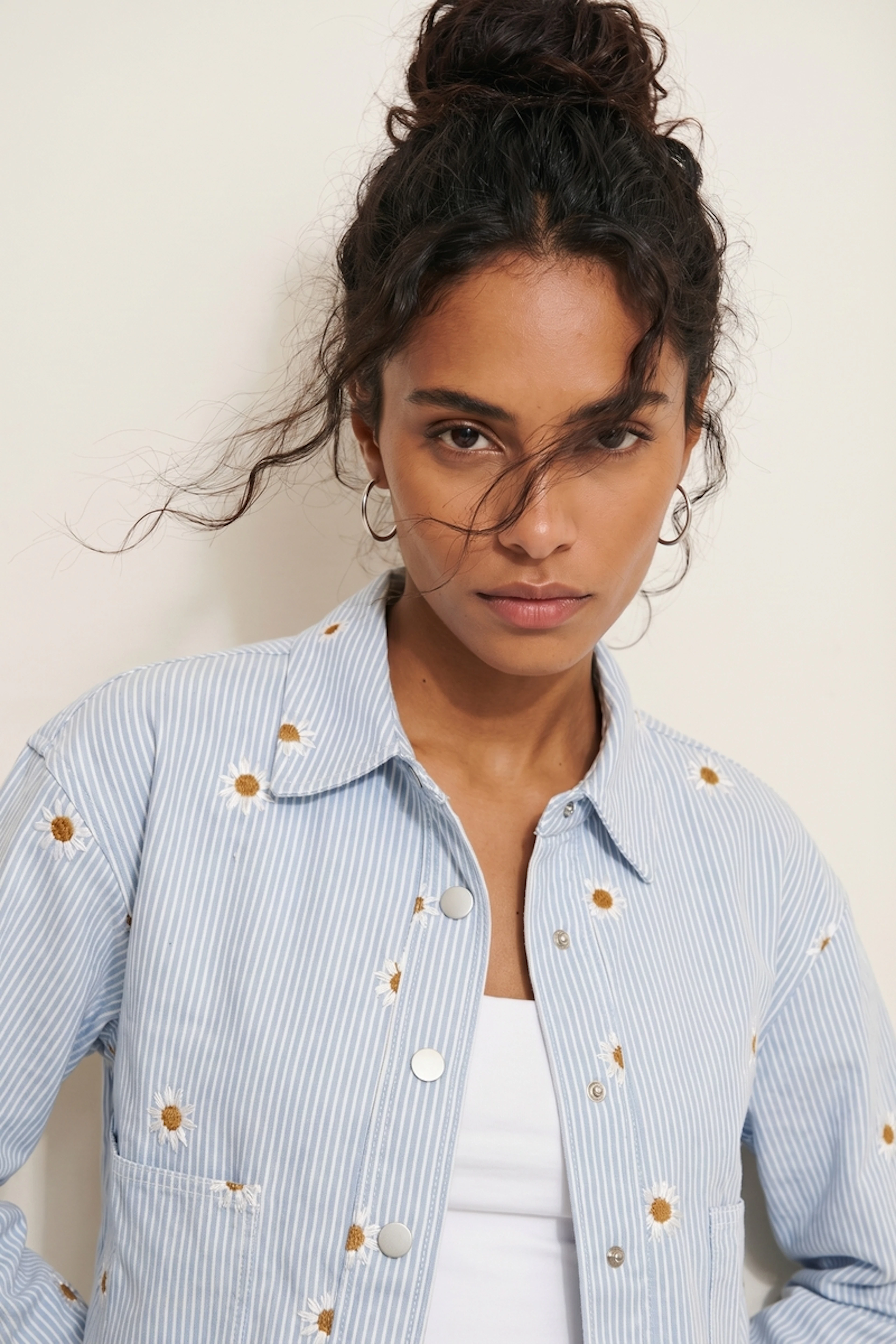 Cette veste se marie à merveille avec un jean blanc et des sandales pour un look estival frais et élégant. • Veste en coton à rayures • Coupe droite • Manches longues • Fermeture à boutons-pression • Motif floral discret