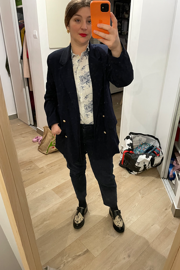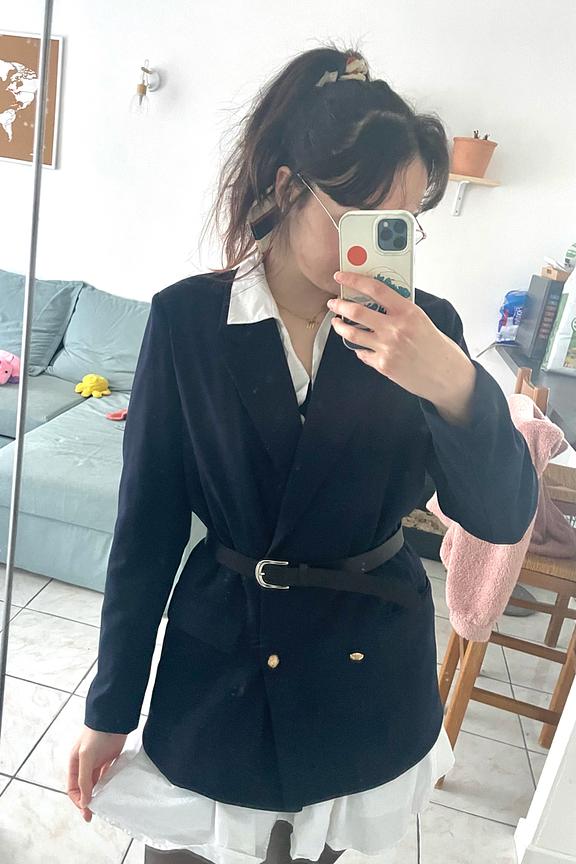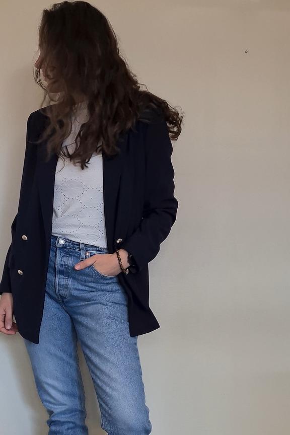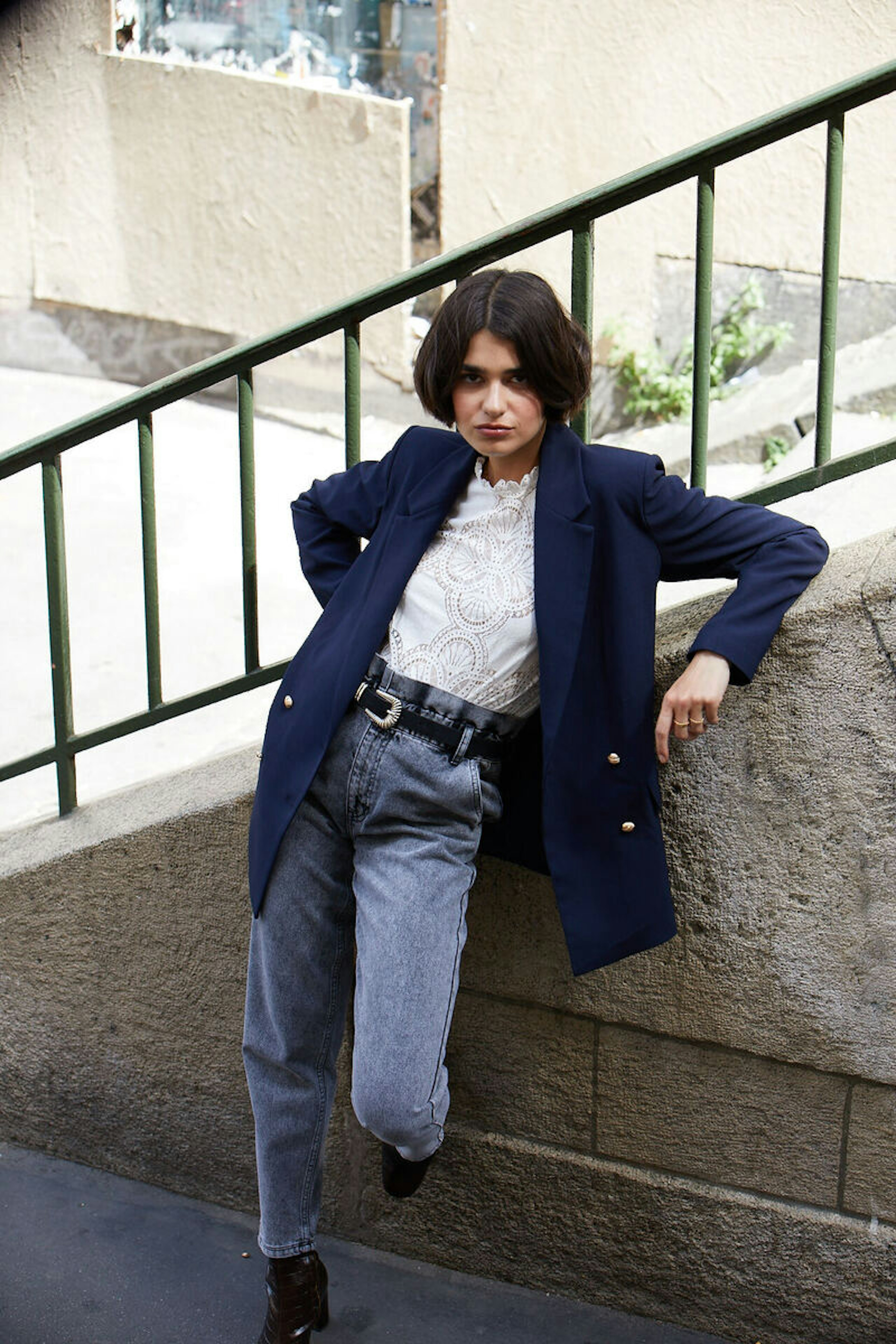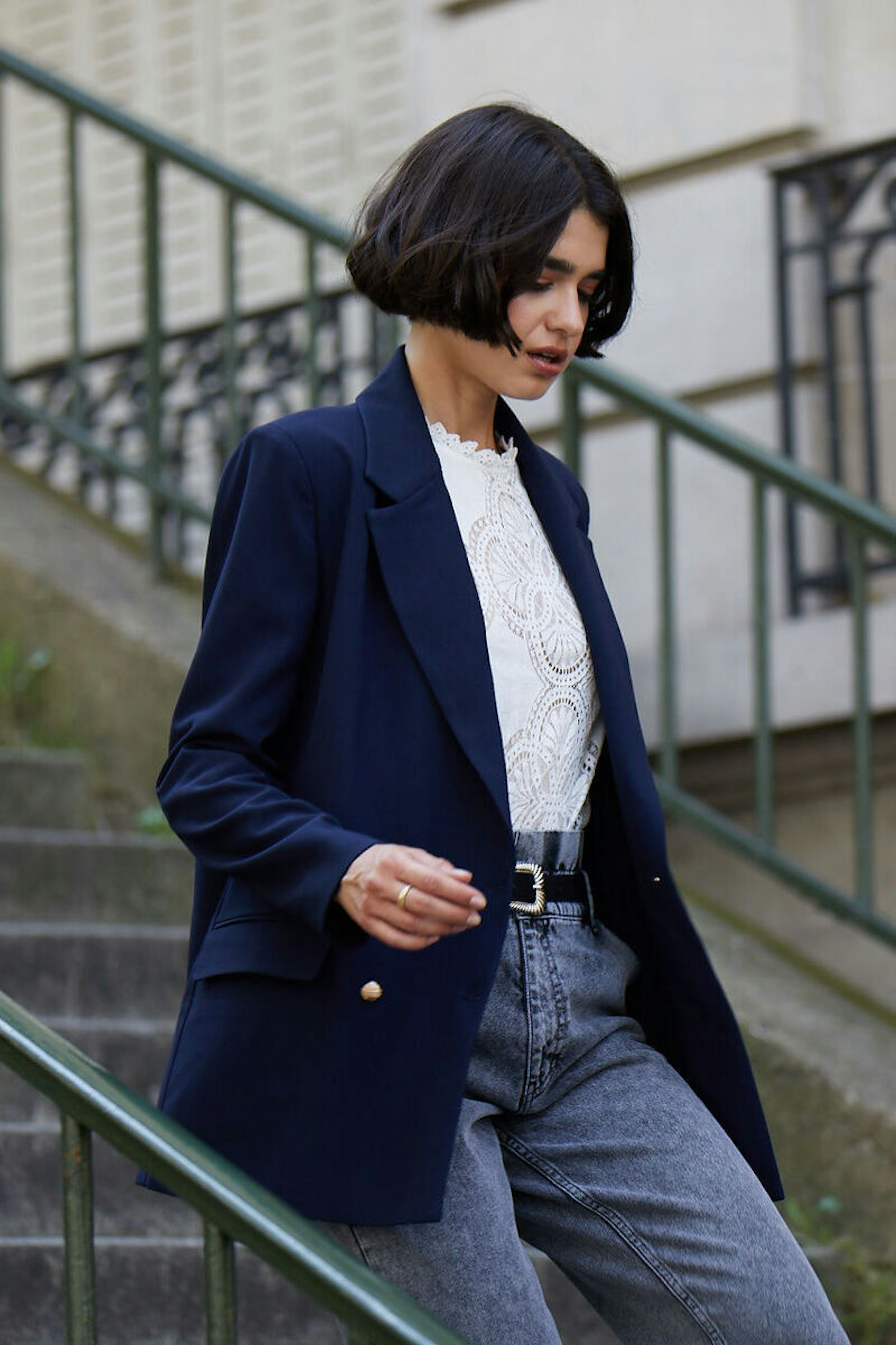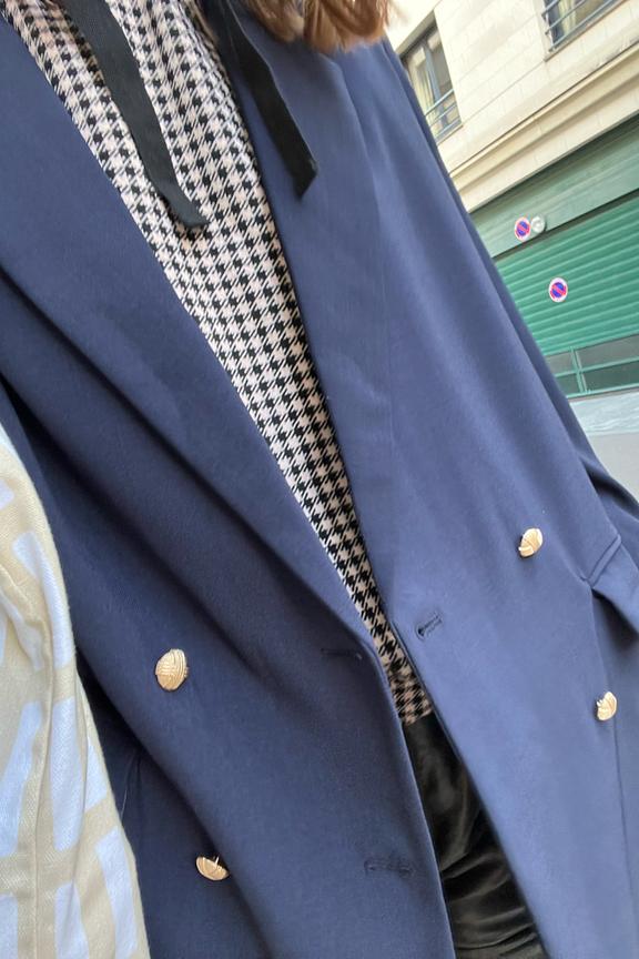 โข Blazer รฉpaulรฉ ร croisure double boutonnage โข Large col tailleur โข Manches longues et rabats de poche โข Coupe droite