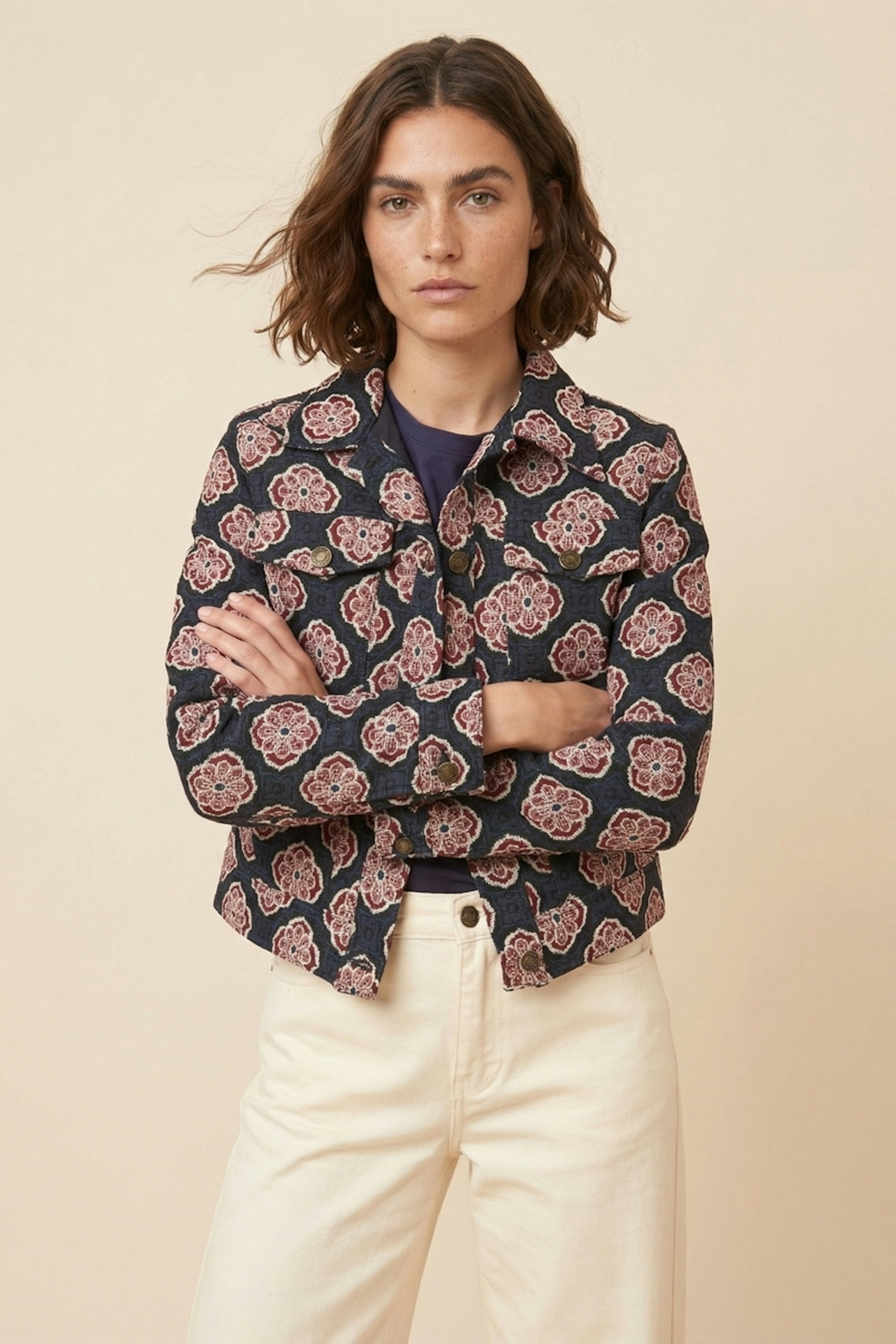 Associez cette veste imprimée à un jean blanc pour une allure estivale lumineuse. Idéale pour élever votre style lors des soirées douces. • Veste à imprimé • Coupe droite • Col chemise • Manches longues • Fermeture boutonnée
