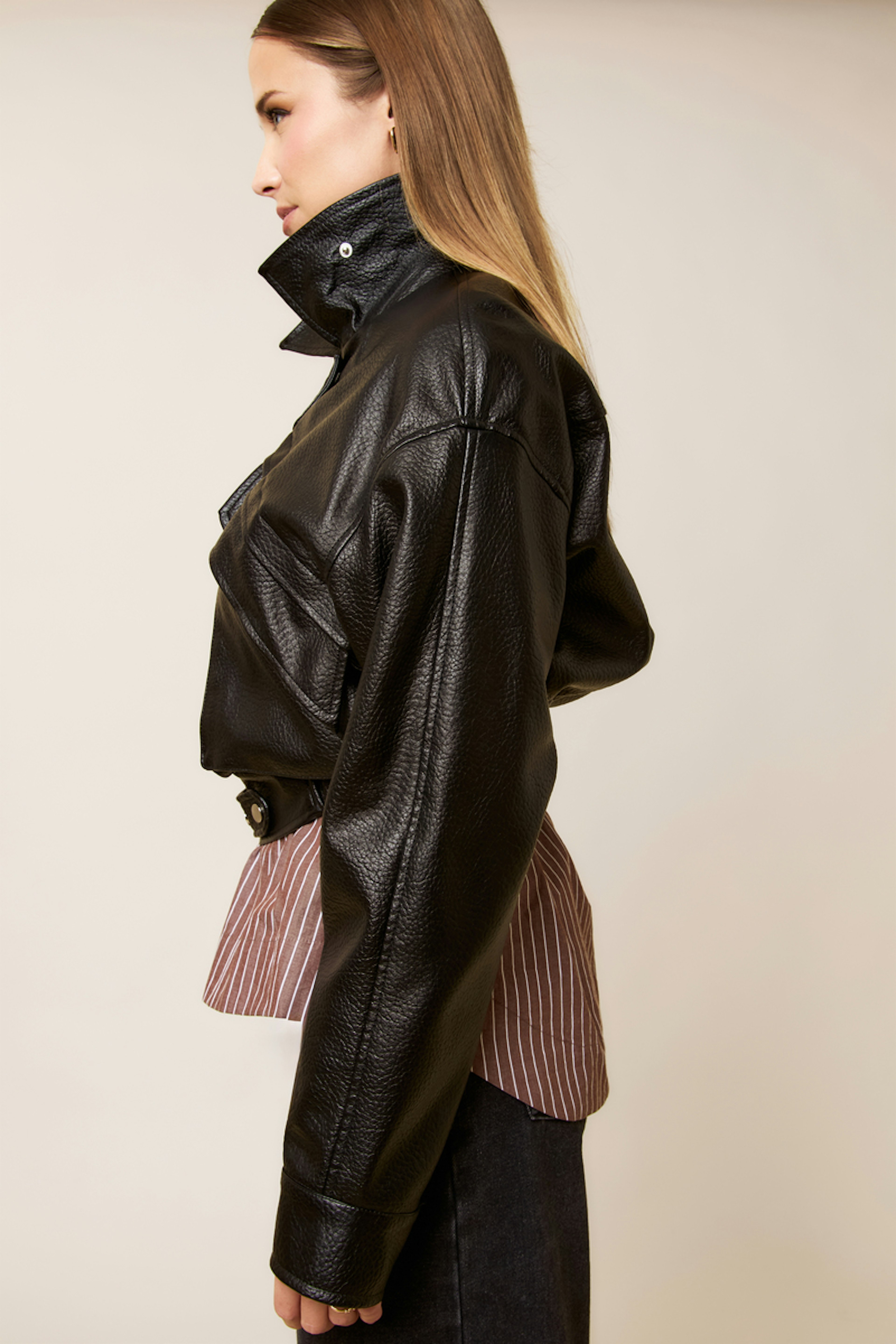 Portez cette veste avec un jean slim et des bottines pour un look chic et moderne en hiver. • Veste ajustée • Manches longues • Fermeture zippée • Col classique • Texture en cuir