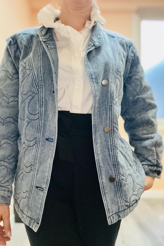 Associez cette veste en denim avec un pantalon large et des bottines pour une allure chic et décontractée. Idéale pour toutes les saisons. • Veste en coton • Coupe tempérée • Manches longues • Fermeture boutonnée • Motif brodé coeurs