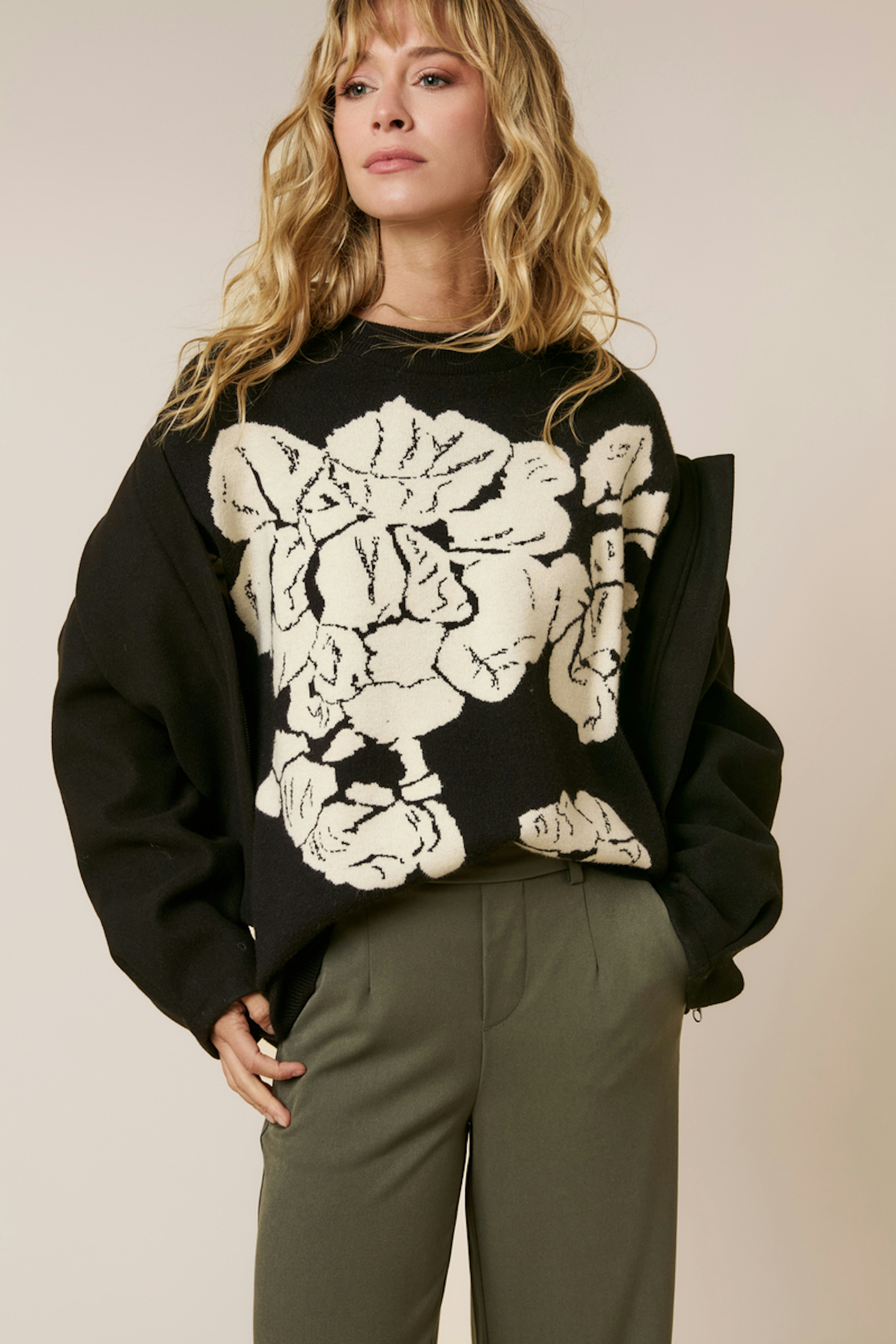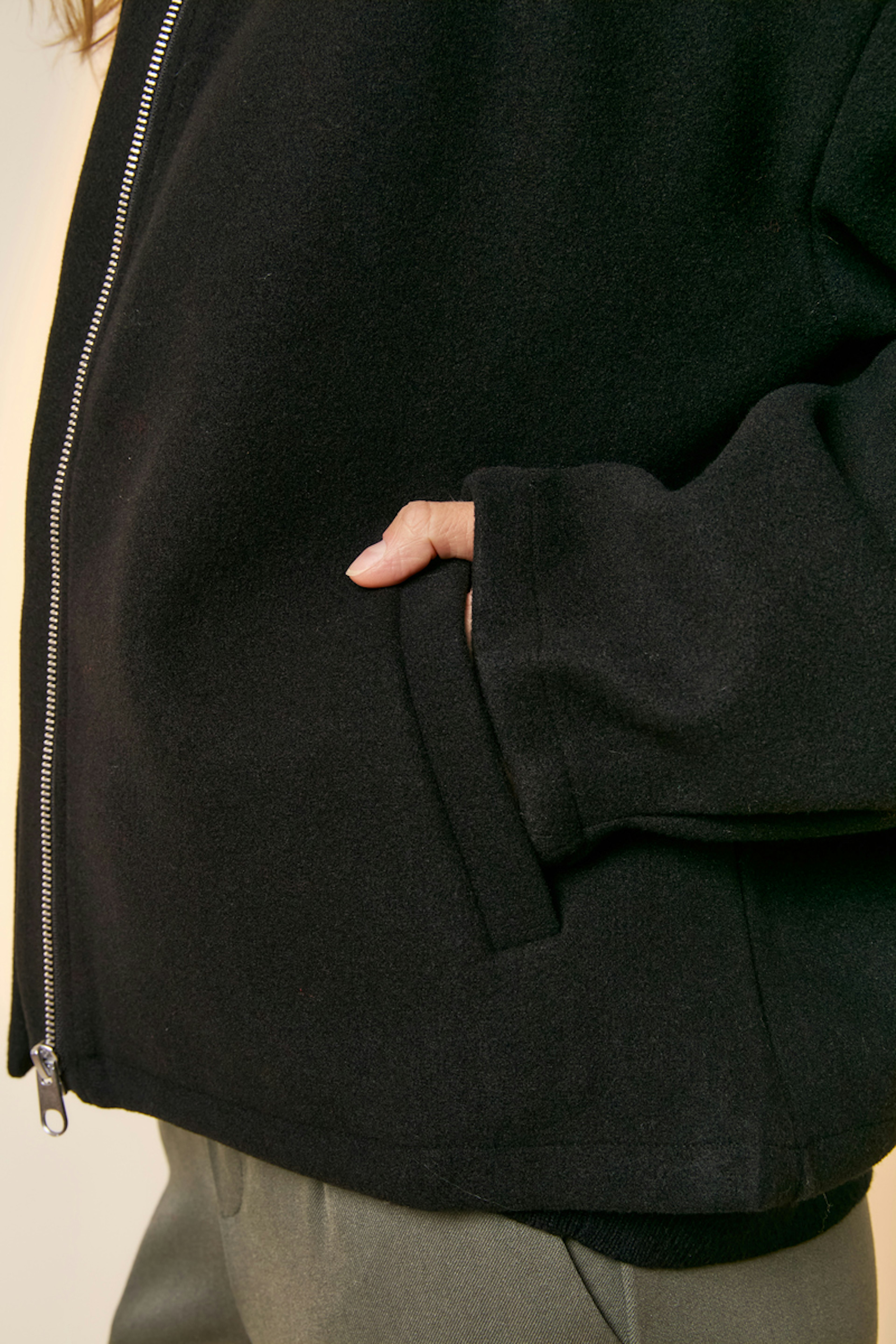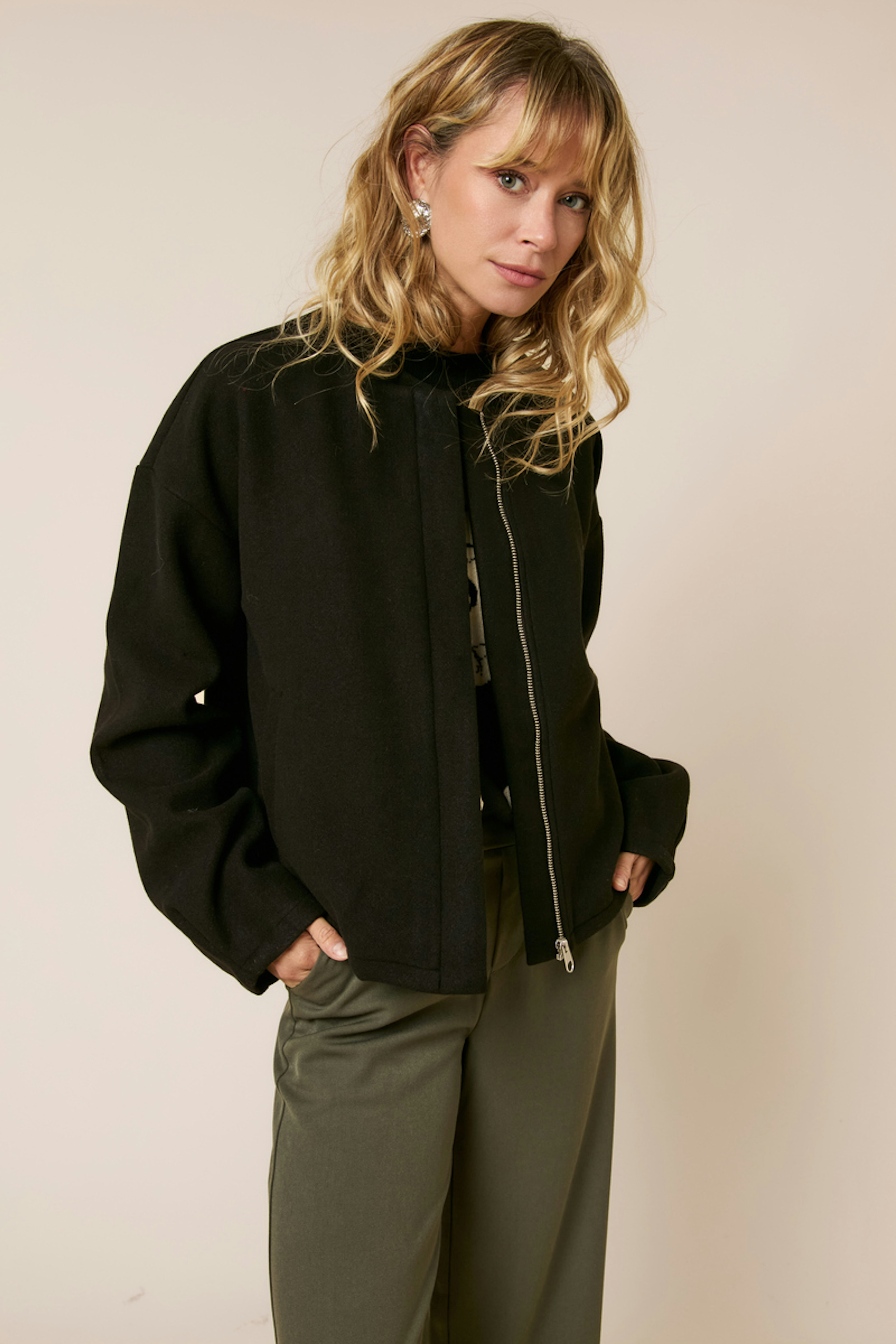 Optez pour un look chic avec un pantalon taille haute et des bottines. Idéal pour une promenade hivernale. • Veste à manches longues • Coupe droite décontractée • Fermeture éclair centrale • Col montant • Style minimaliste élégant