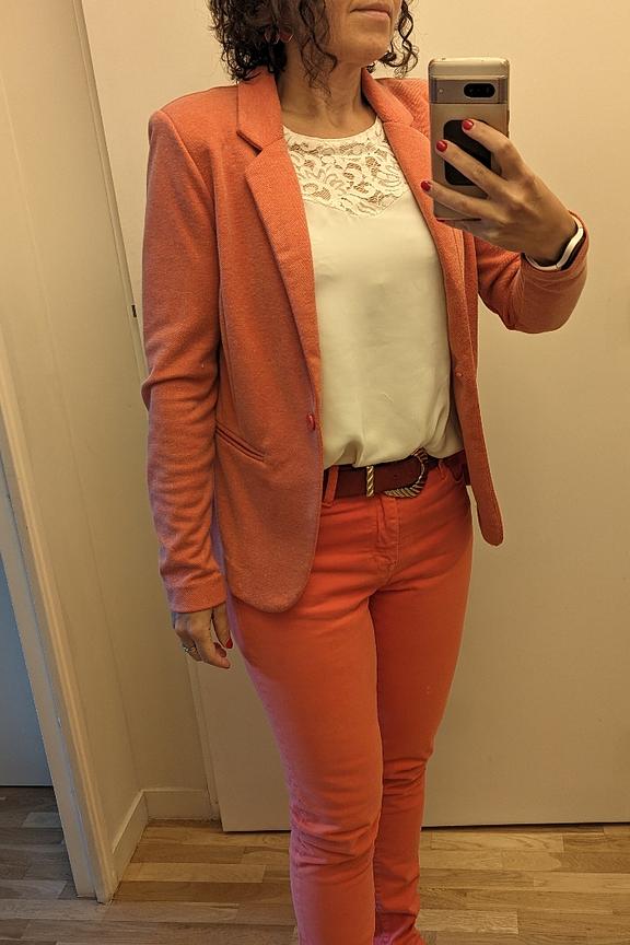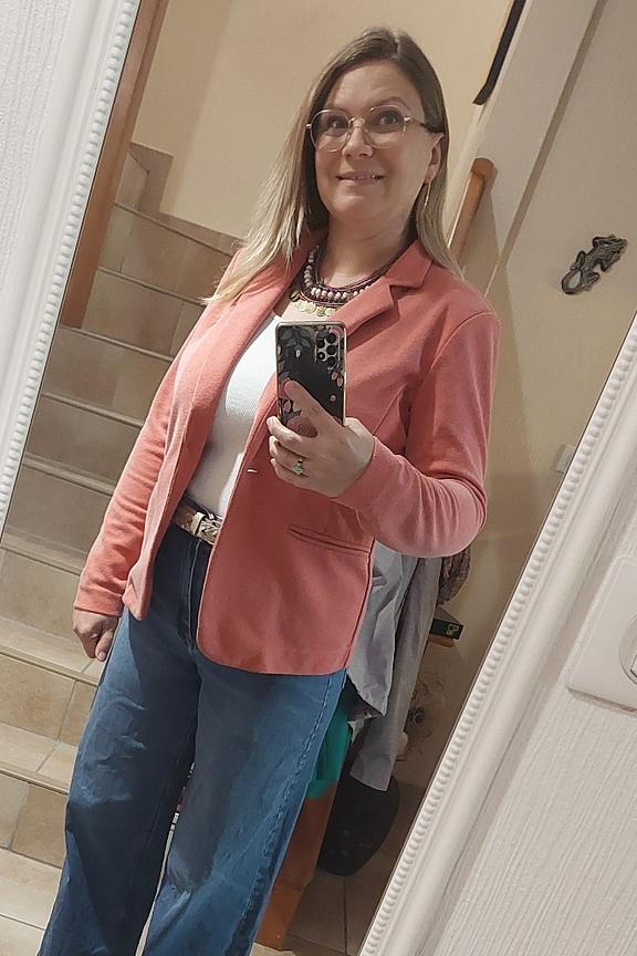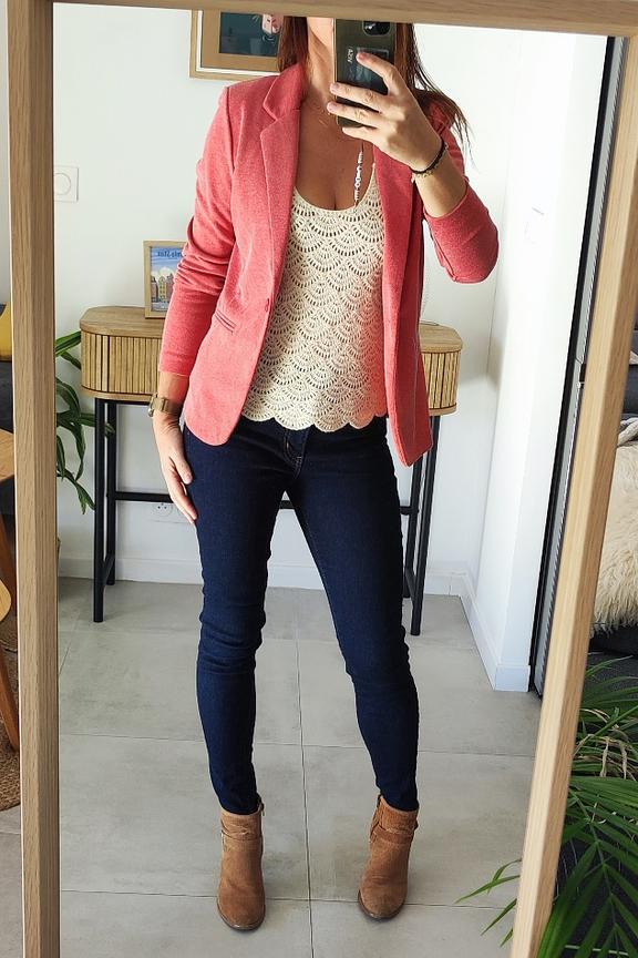 โ€œDonne un look chic dรฉcontractรฉ trรจs sympa, par contre la coupe est vraiment รฉtroite aux manches, c'est dommage, impossible ร  porter sur un chemisier par exemple. La couleur est beaucoup plus chinรฉe que sur la photoโ€