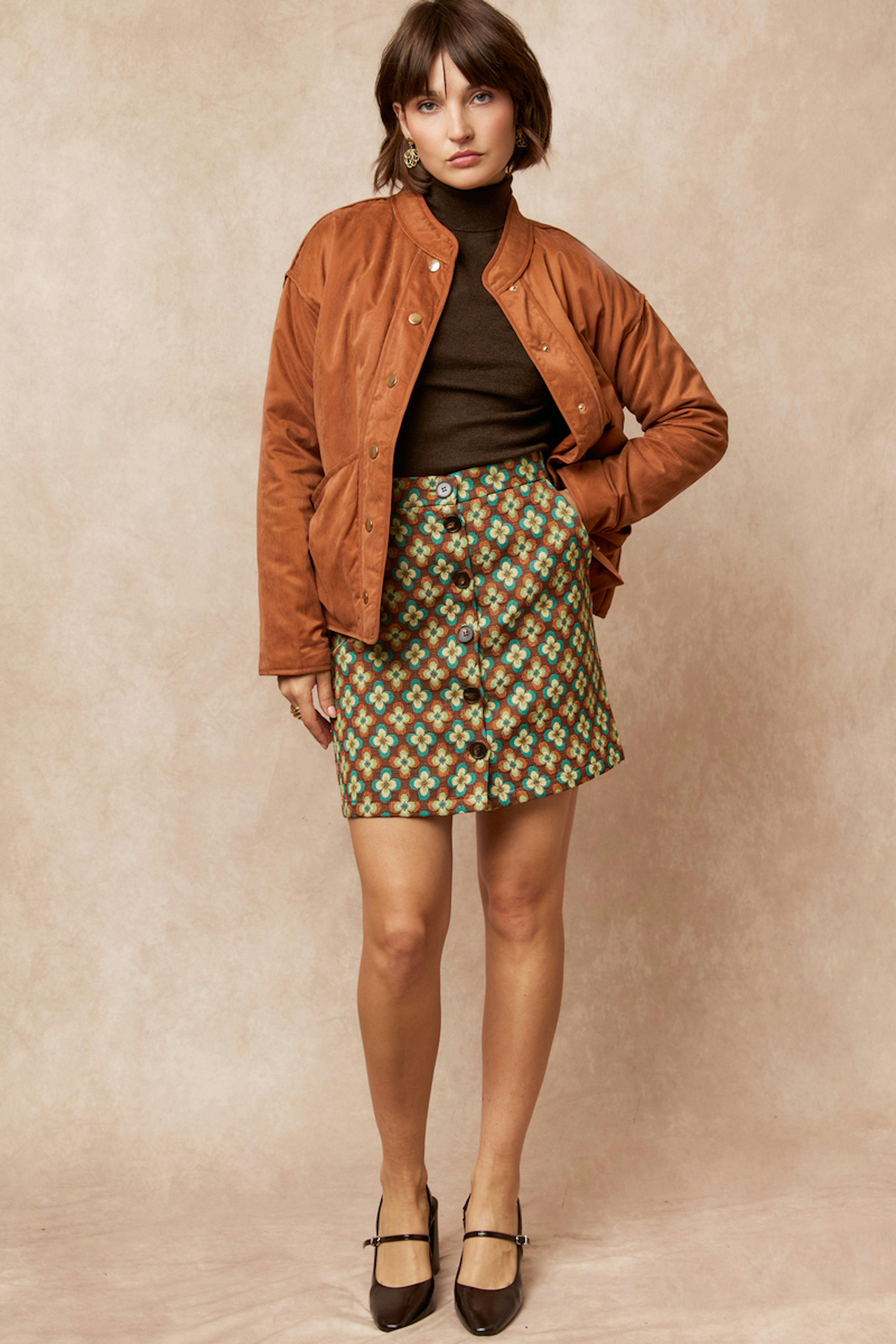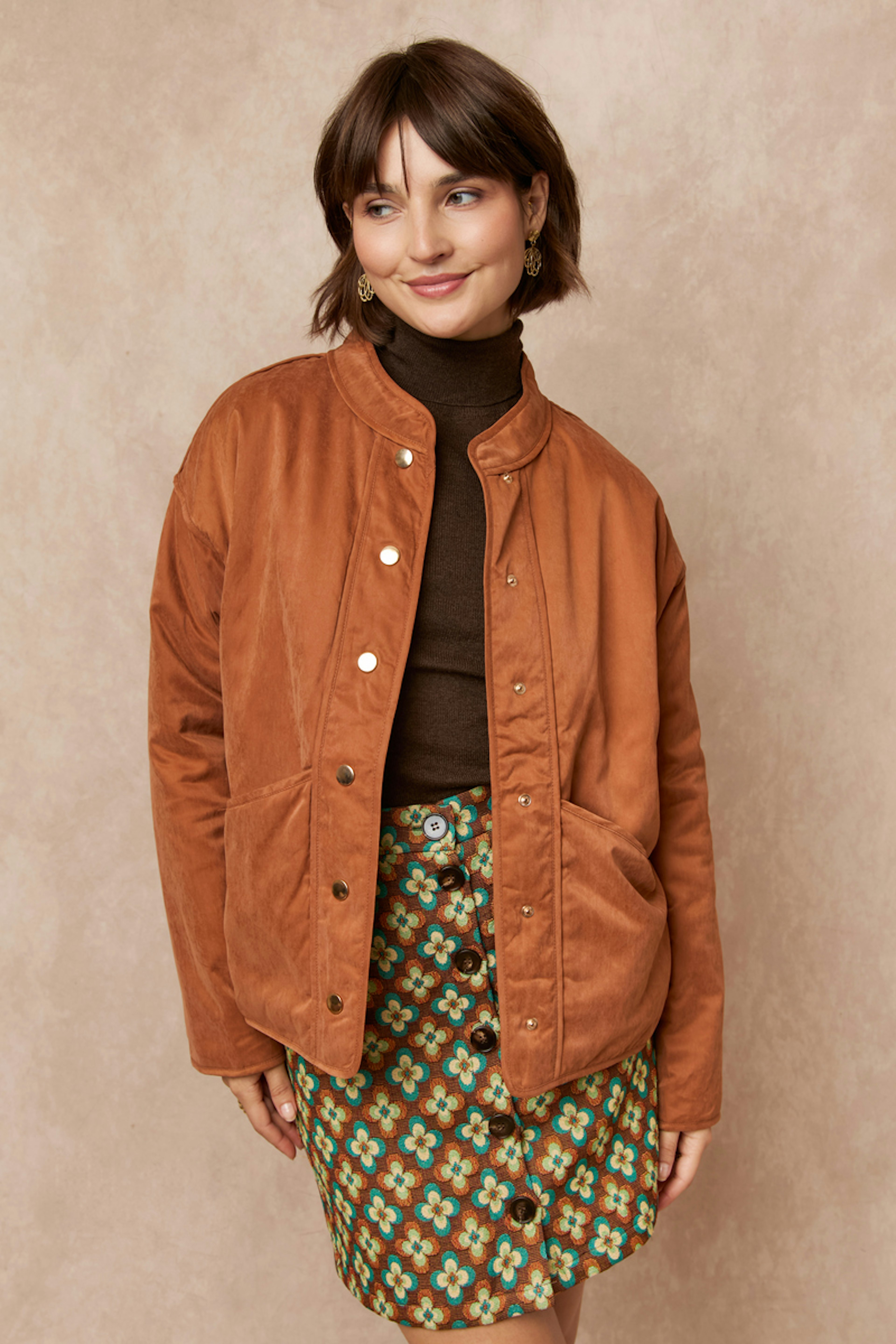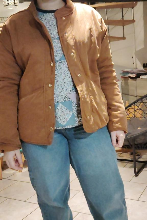 “Jolie veste décontractée au tissu coton aspect velouté. Belle couleur écureuil, parfaite pour l'automne.”