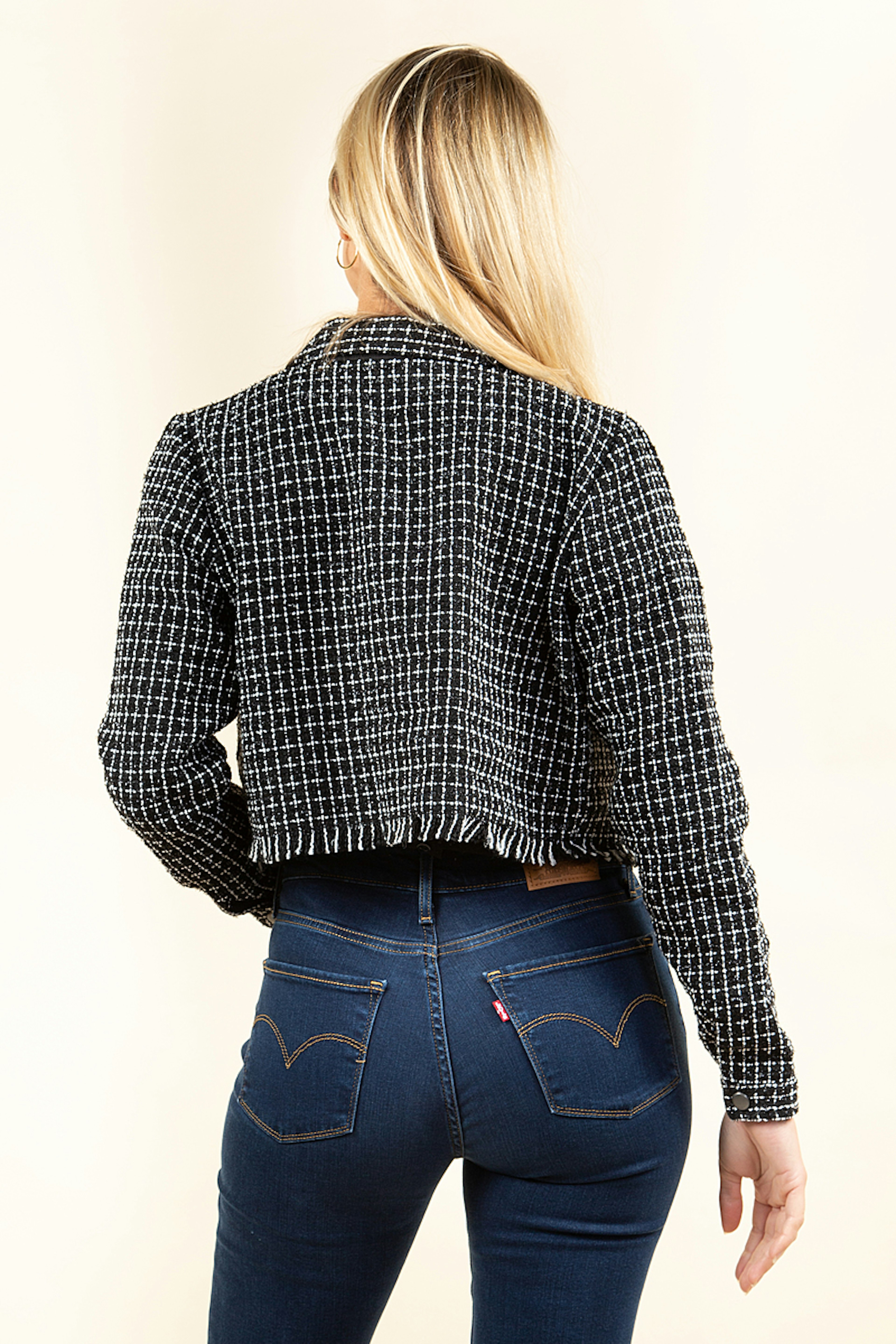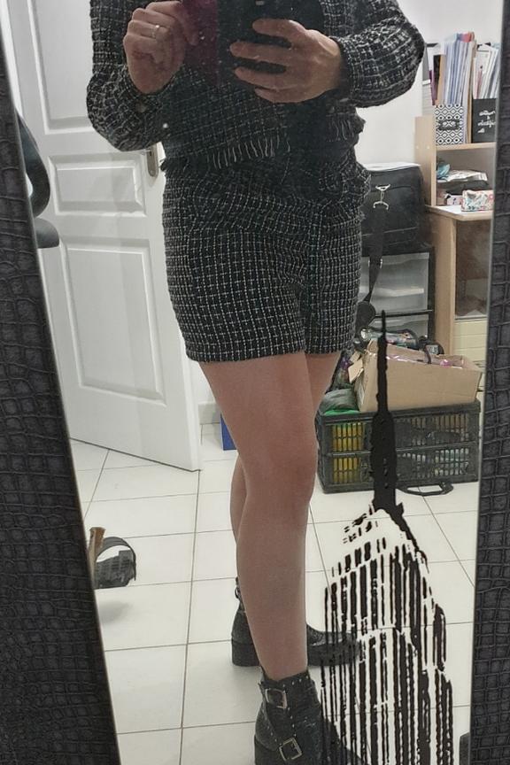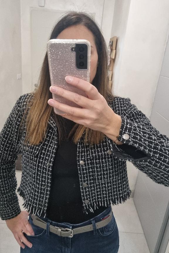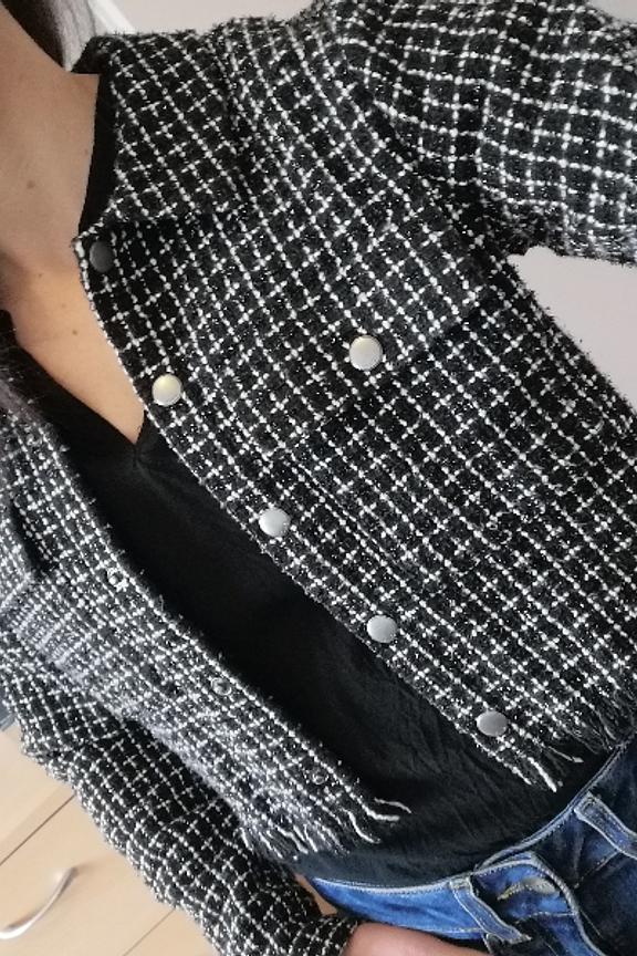 Coup de coeur pour Livia cette robe effet tweed ร la coupe tendance. โข Veste courte ร manches longues noire et blanche โข Bord franc โข Pressions sur le devant