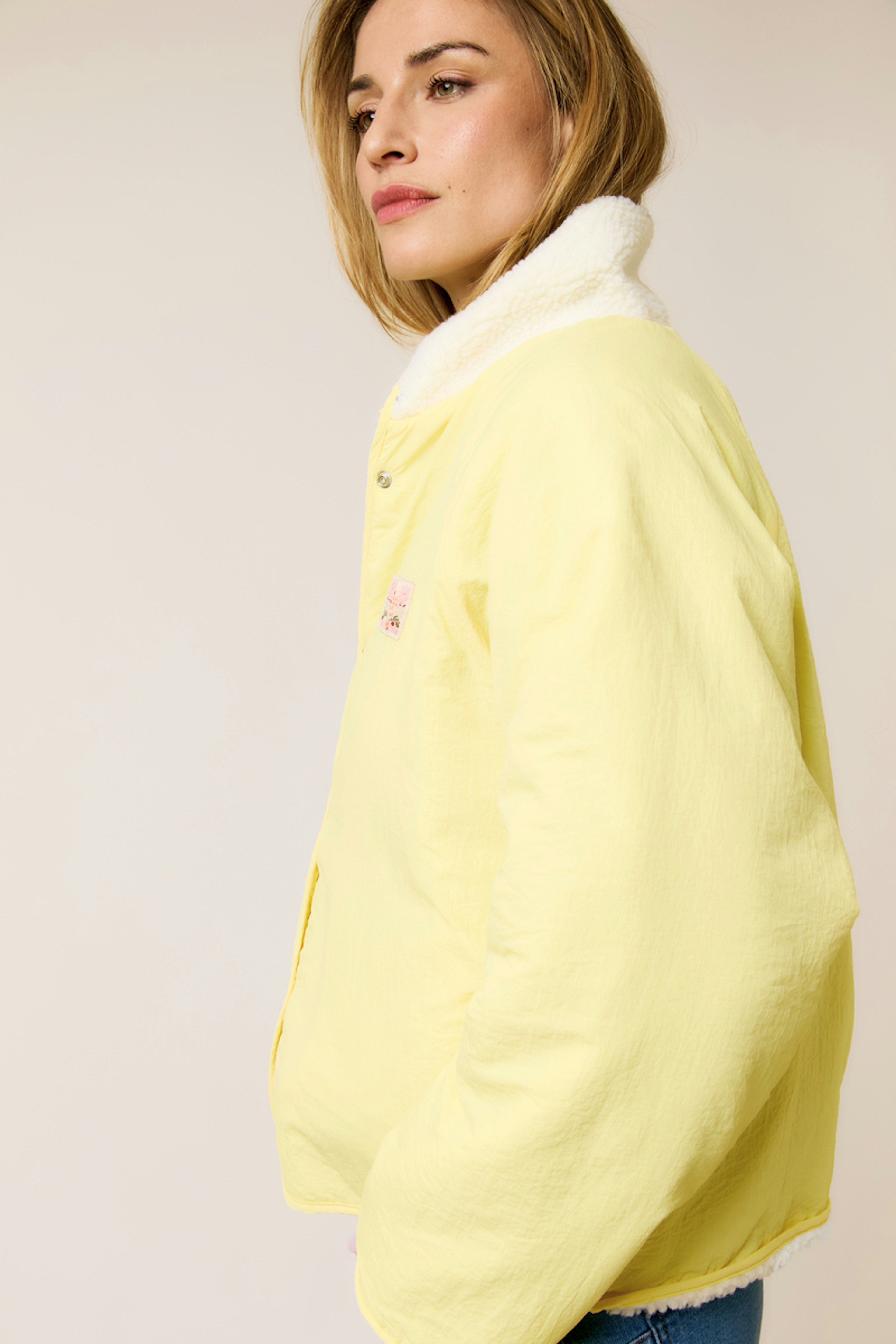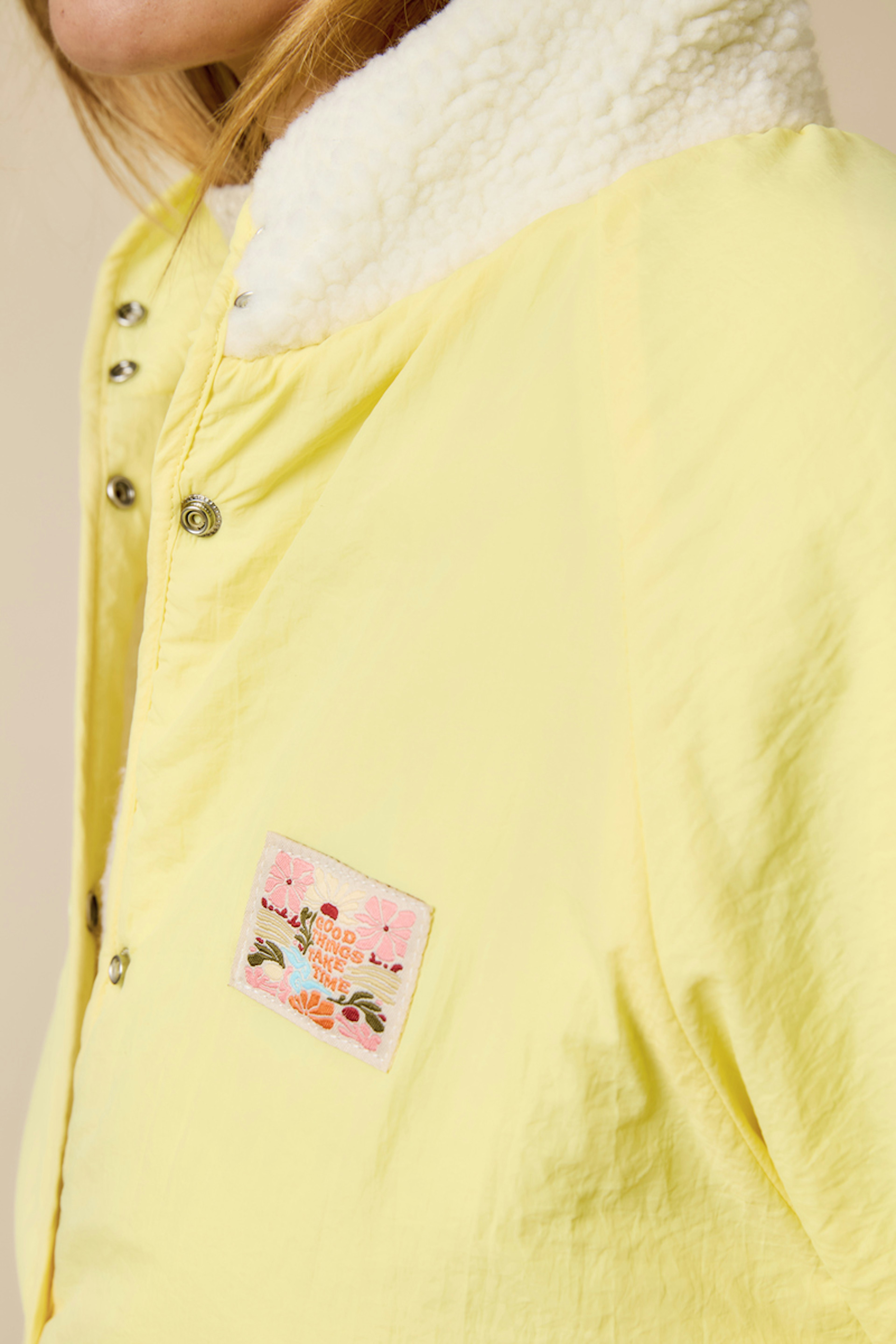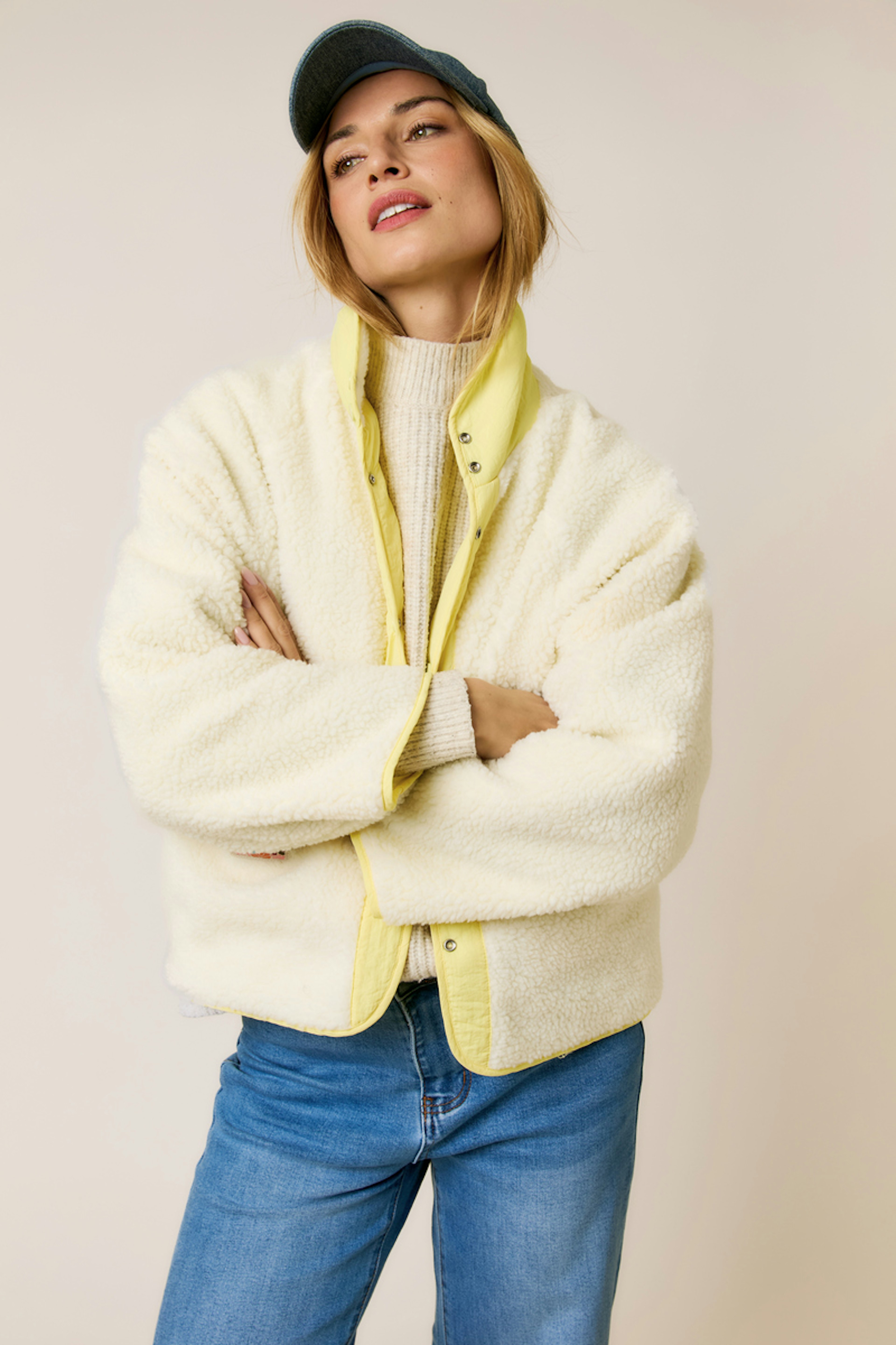 Associez cette veste avec un jean brut et des bottines pour un look hivernal stylé. Ajoutez une écharpe colorée pour plus de chaleur. • Veste à capuche • Coupe oversize • Fermeture par boutons pression • Épaisseur généreuse • Détails contrastés jaunes