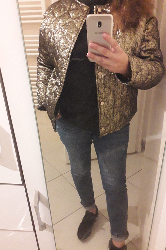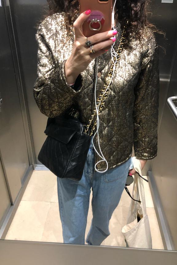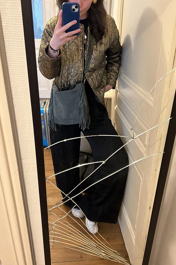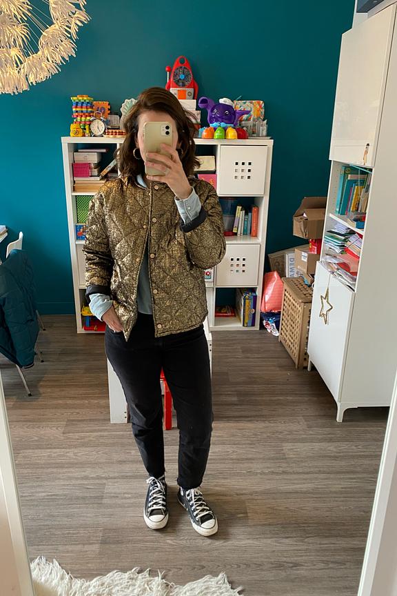 โTaille grand et encore j'ai pris un S. La couleur est plus dorรฉe que sur la photo. Je n'ai pas pu la mettreโ
