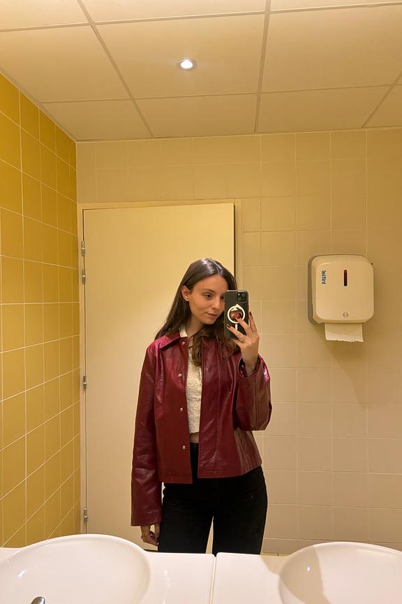 Ajoutez une touche audacieuse ร votre tenue avec cette veste rouge! Associez-la ร un jean skinny noir et des bottines pour un look chic hivernal. โข Veste en simili-cuir โข Coupe ample โข Manches longues โข Fermeture ร boutons-pression โข Poches latรฉrales pratiques