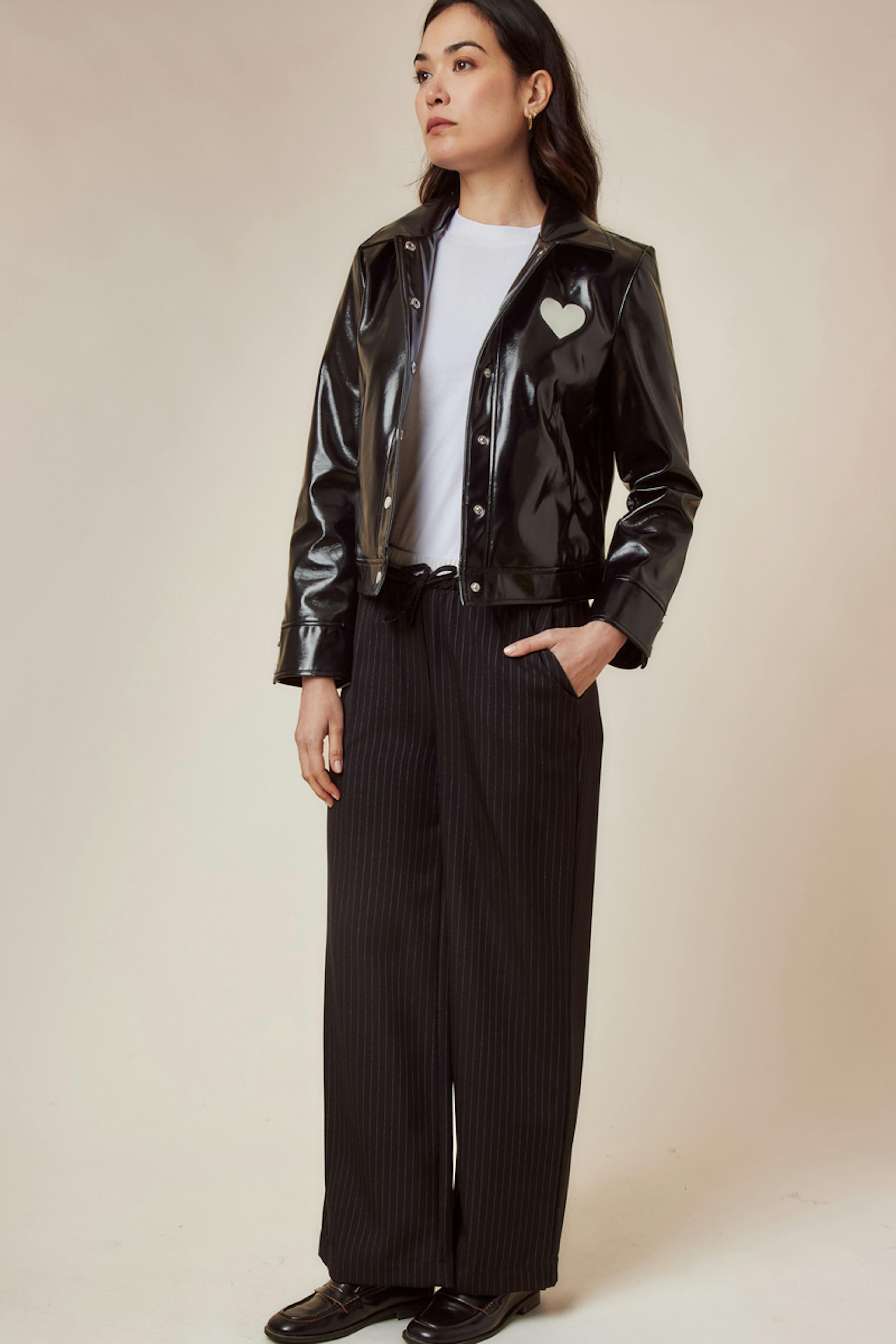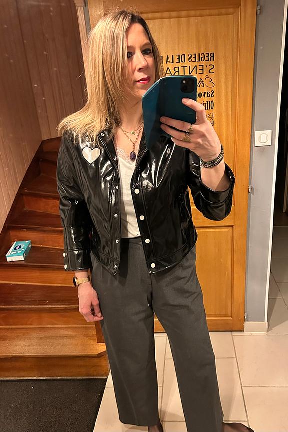 Ose une allure audacieuse avec cette veste et marie-la à un jean skinny et des bottines pour un look hivernal stylé. • Veste noire • Coupe droite • Fermeture à boutons-pression • Détail cœur découpé • Finition brillante