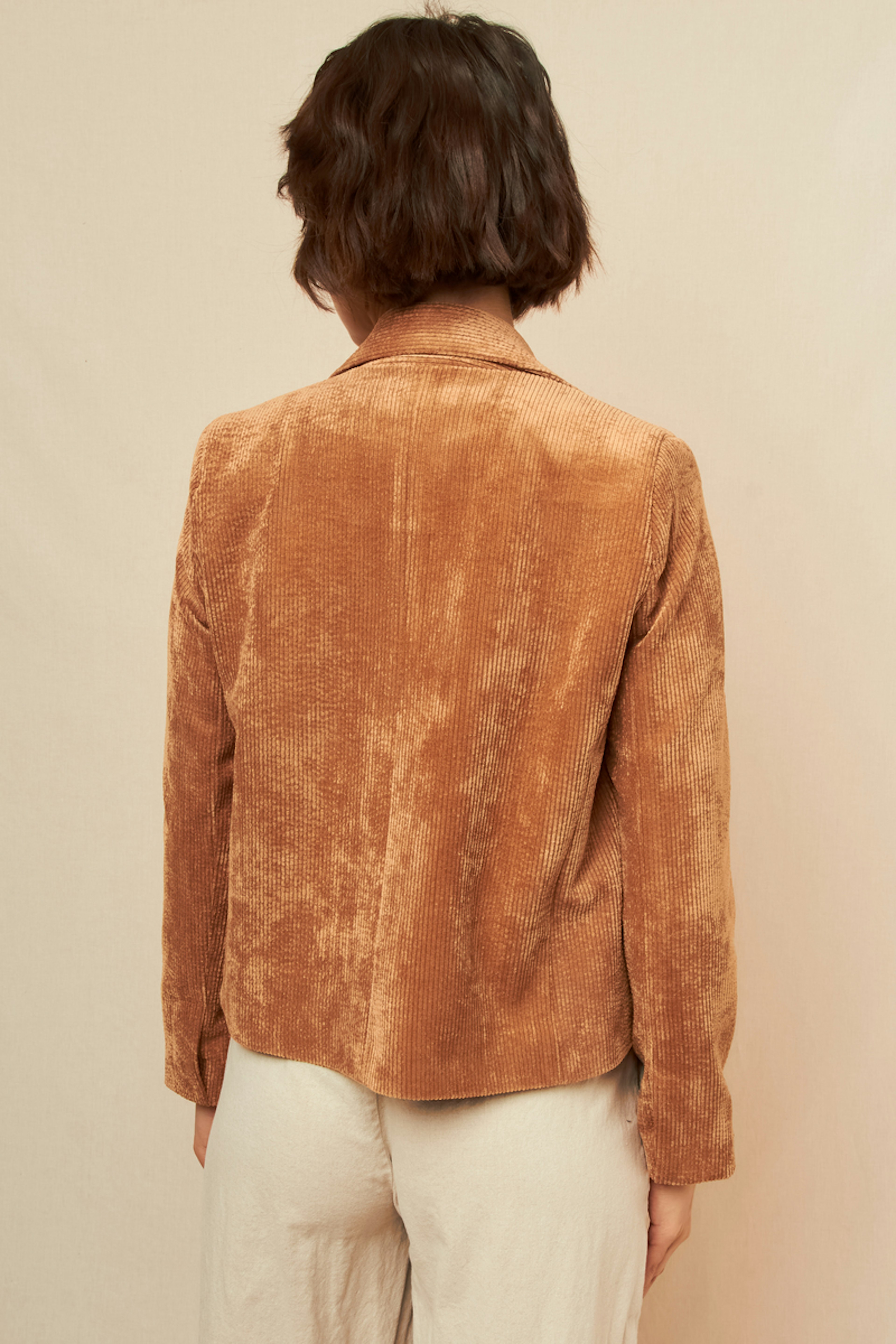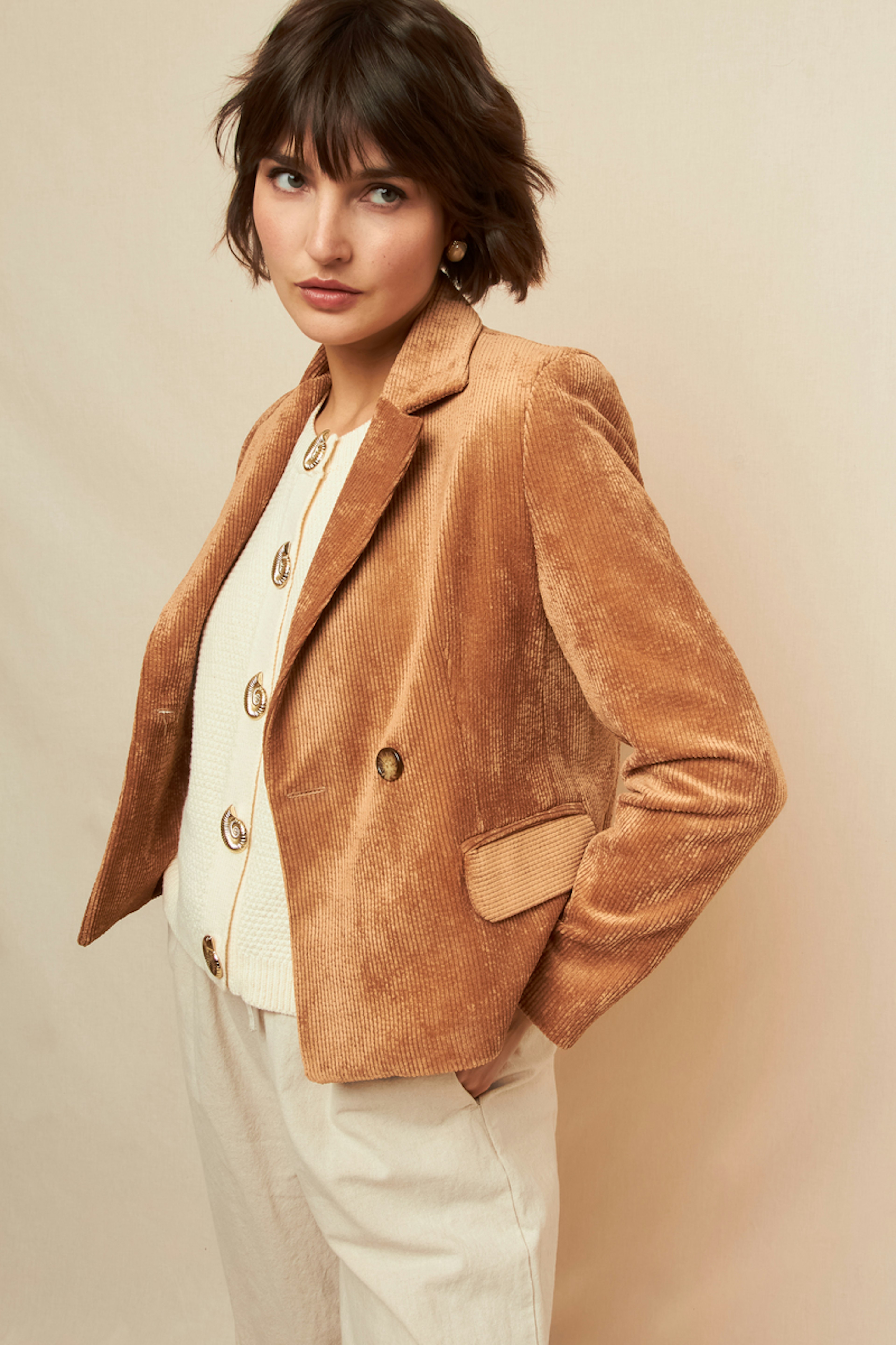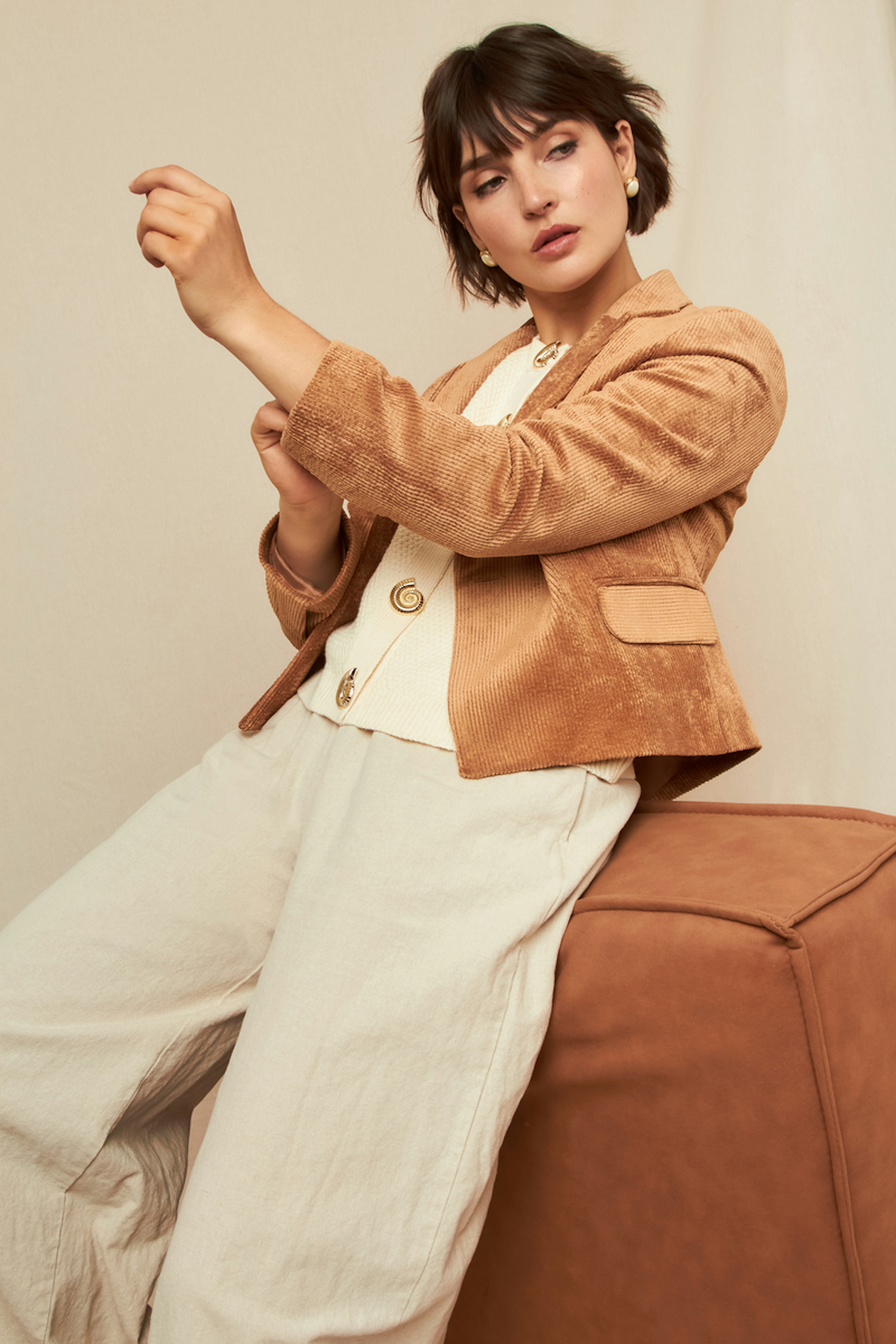 Portez cette veste avec un pantalon fluide et des sandales ouvertes pour une allure décontractée et chic. Parfait pour les soirées estivales. • Veste courte en velours côtelé • Coupe ajustée • Épaules structurées • Fermeture boutonnée dorée • Poches frontales élégantes
