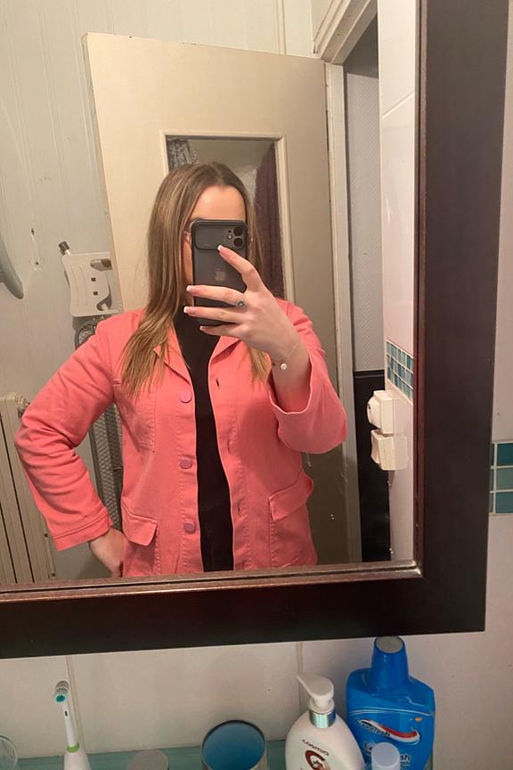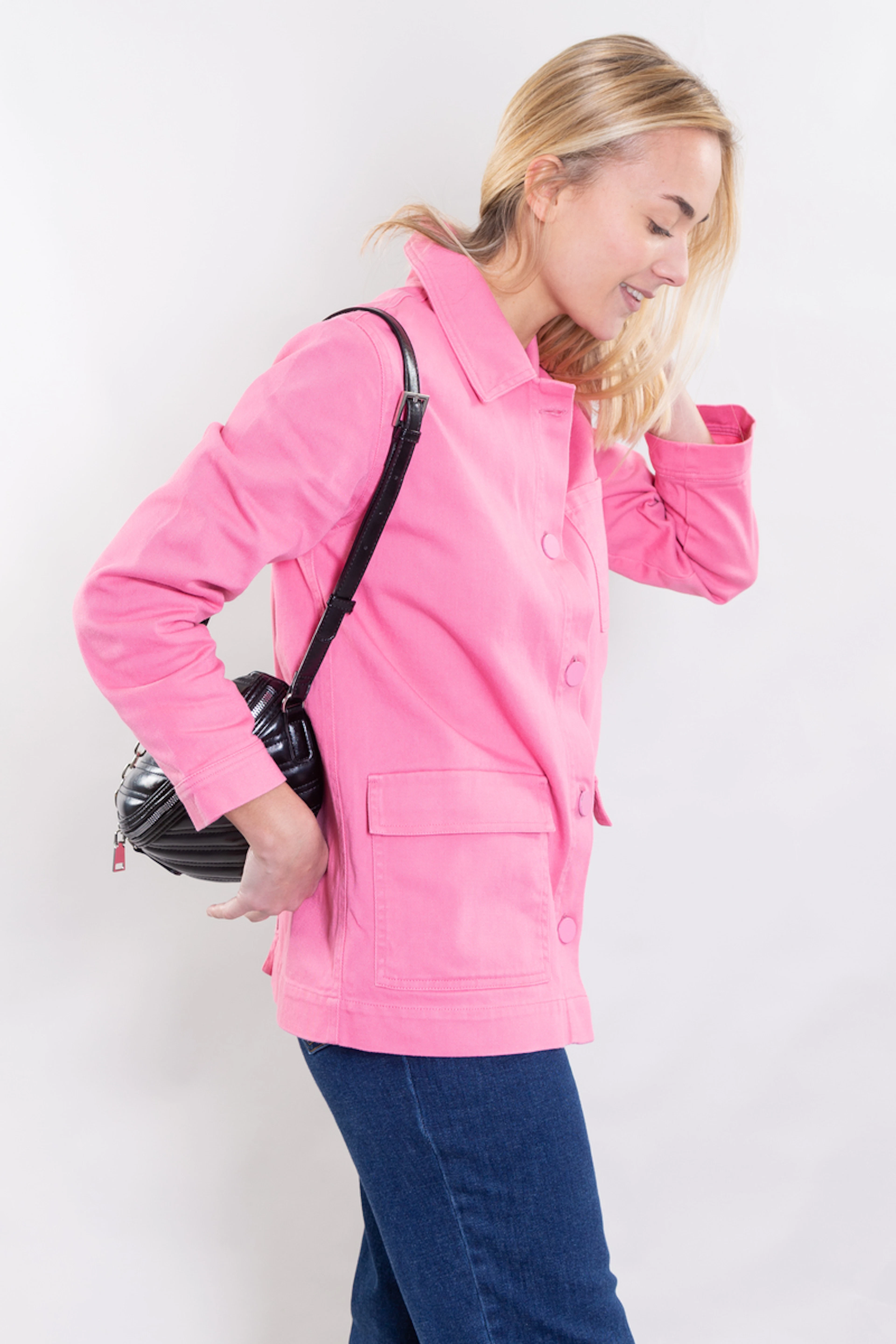 LE rose de travail 100% Make My Lemonade pour remplacer votre veste de mi-saison : effet bonne mine garanti ! • 3 poches • Longueur au niveau des hanches • Coupe droite • Boutons roses • Finitions surpiquées comme la vraie veste de travail • Fabriquée au Portugal